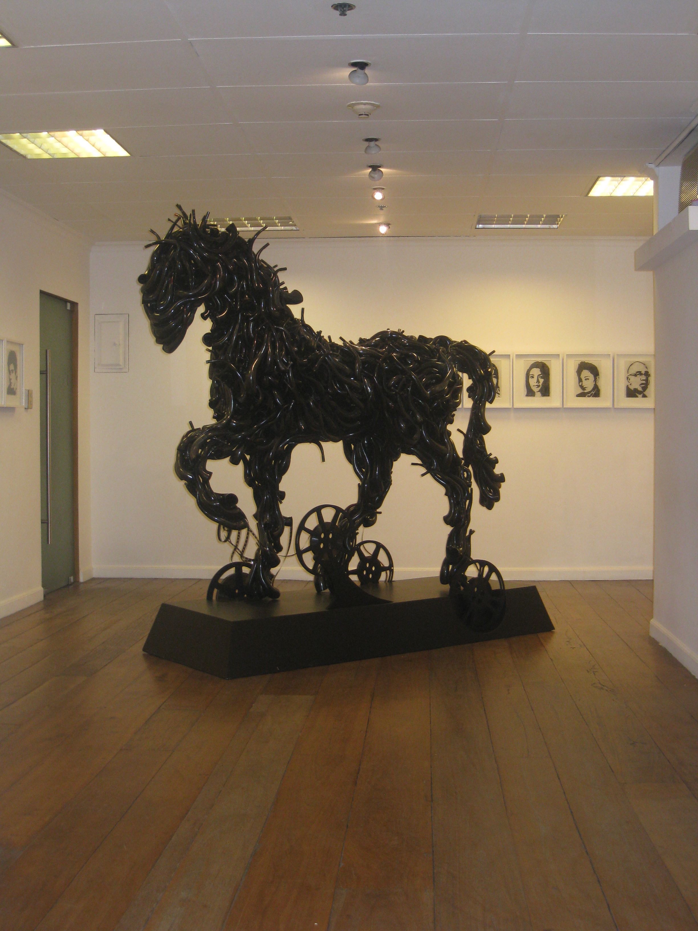 Exhibit installation view- Trojan horse sculpture from old "torotots" (horns)