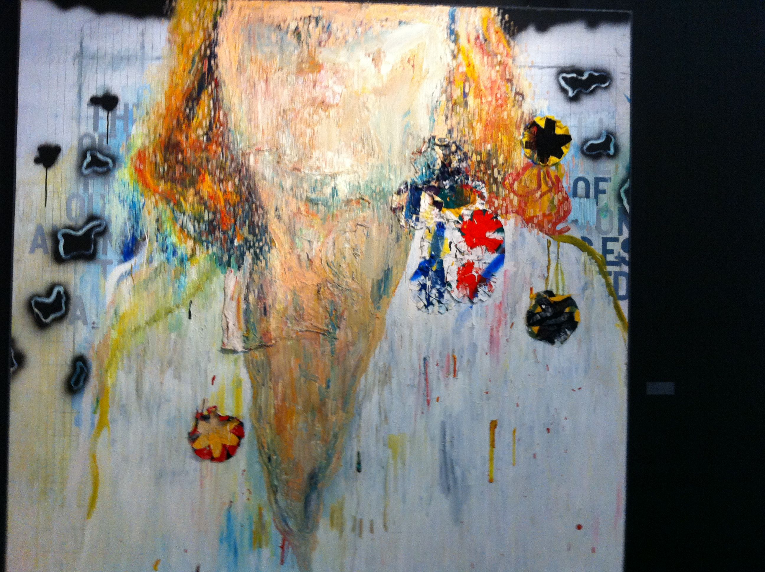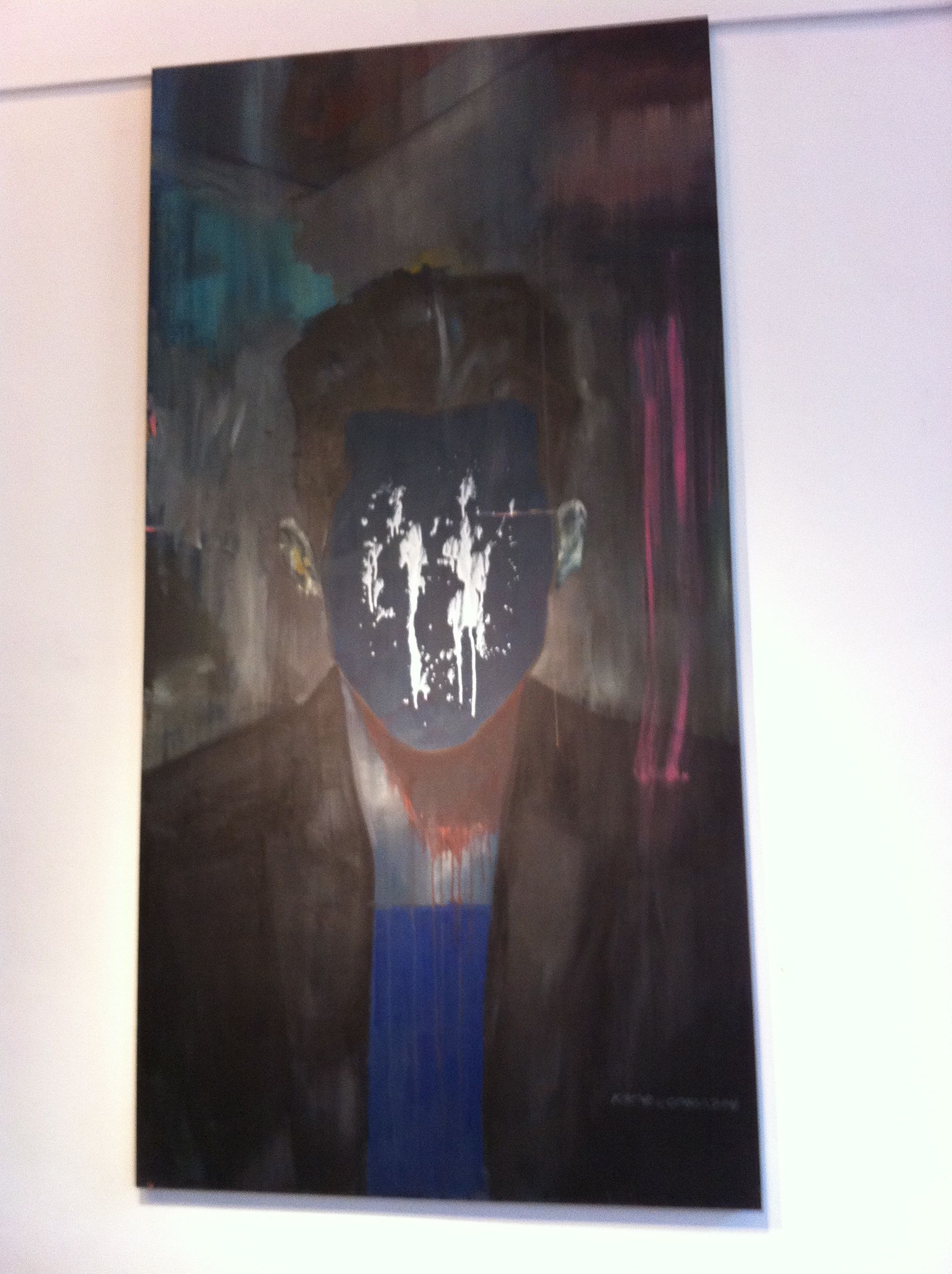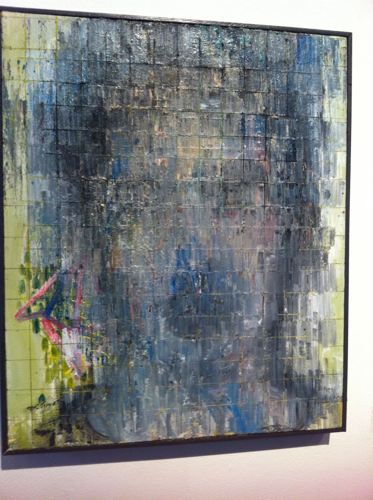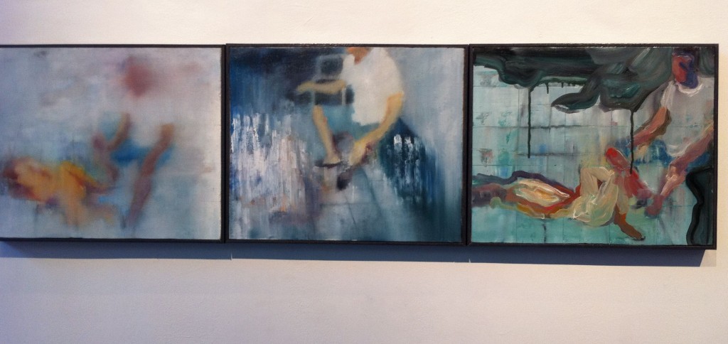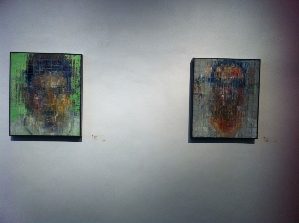 From afar, the works give off the impression of paint that has run, of watercolors washed out in the rain.  Up close, you appreciate the details:  the grid like pattern Maya has etched onto the thick paint, the drips, the bright green she used to enhance two of the portraits (Untitled IV and Untitled V).  I especially liked the trio of works she calls I Will Never Remember Your Face (I, II, III). They hang beside each other, like a set of contact prints, or film stills, displayed in sequence.  Do they recount a scene of violence or of passion? Hard to tell.