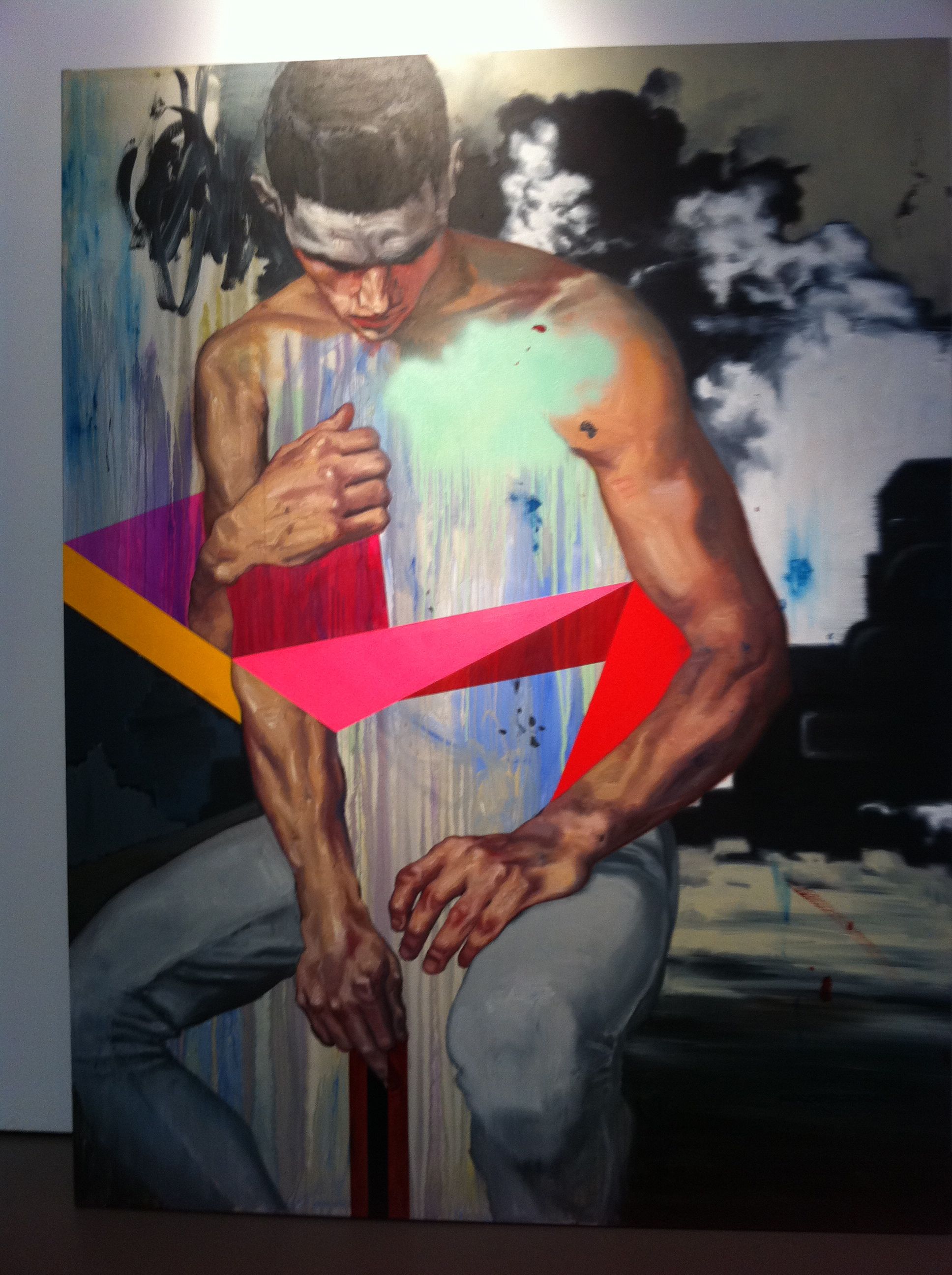 Kiko exhibits four large oil on canvas paintings, portraits as well, to complement Maya’s.  Like hers, we don’t get a glimpse of his subjects’ faces. While done well, I don’t find them as appealing as I do his charcoal drawings. They don’t deliver the same impact as his distinctive visages on paper— the hip, chic, and badass urban denizens he has claimed as his own.  These feel too generic, tame even, lacking in attitude.  They don’t give off the Kiko vibe.