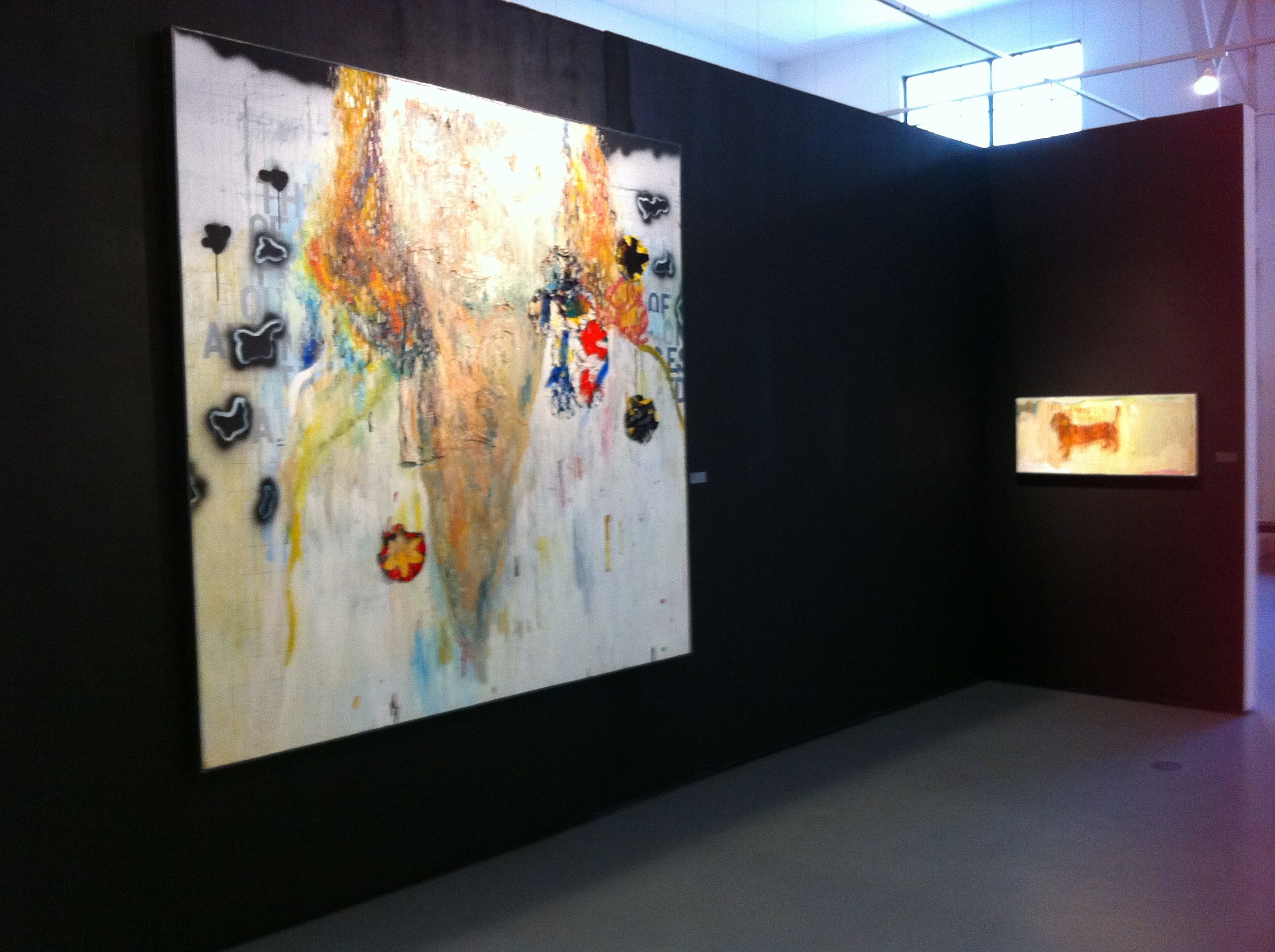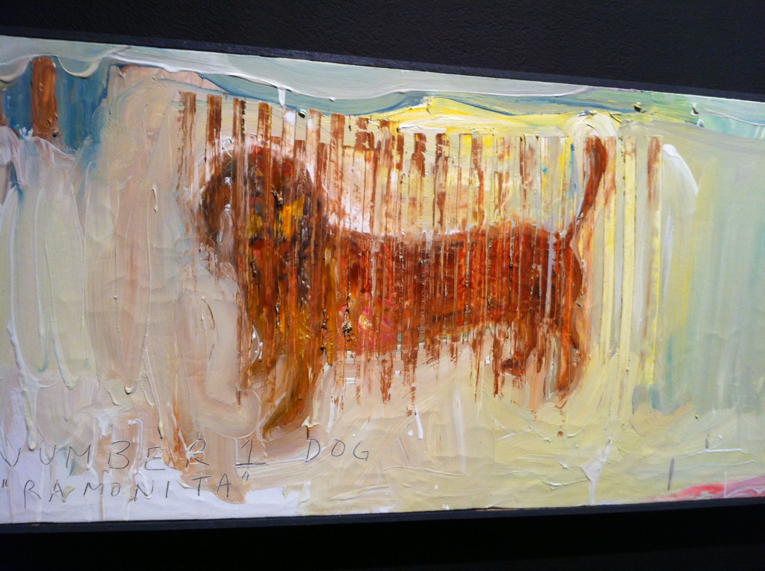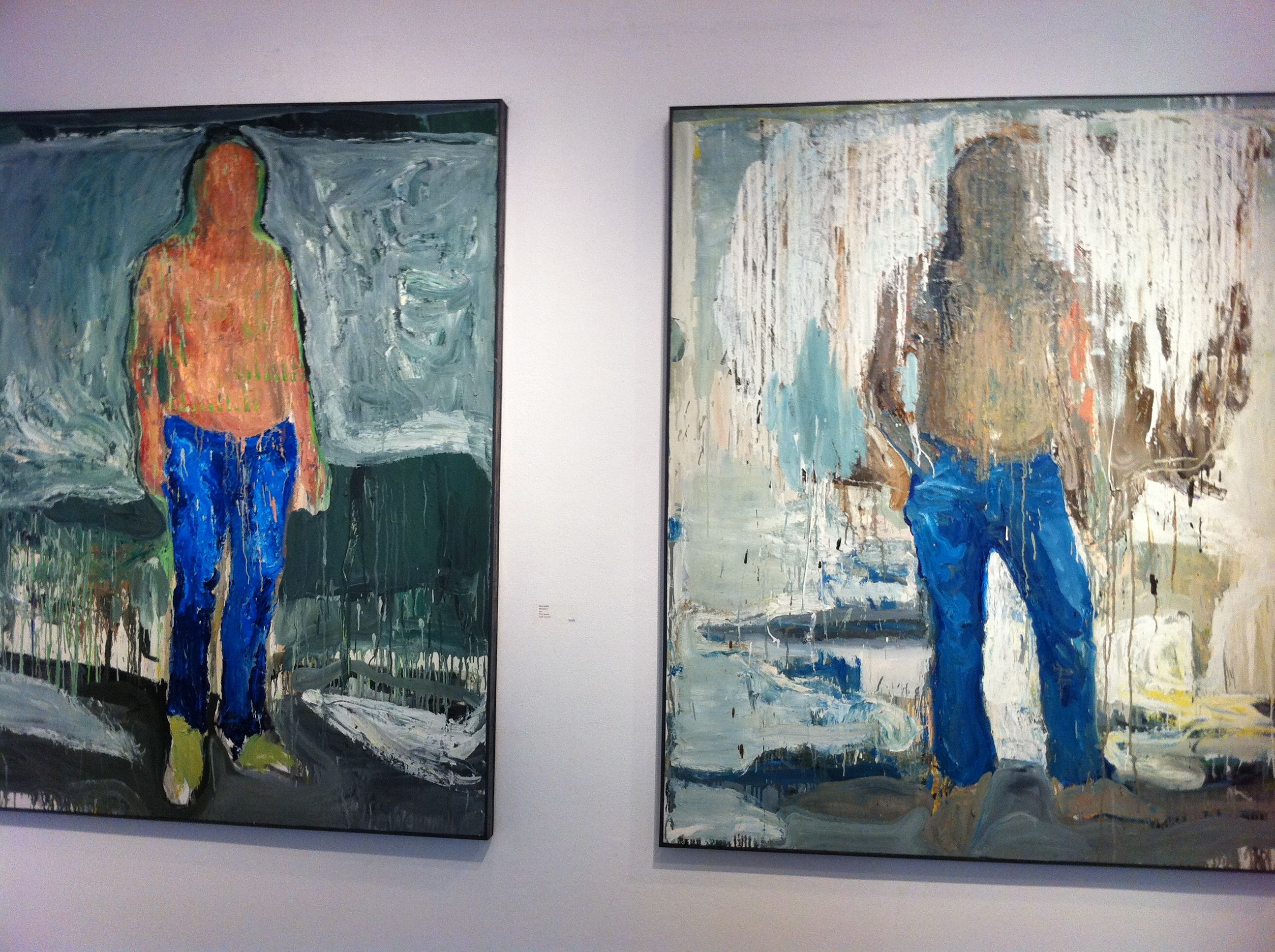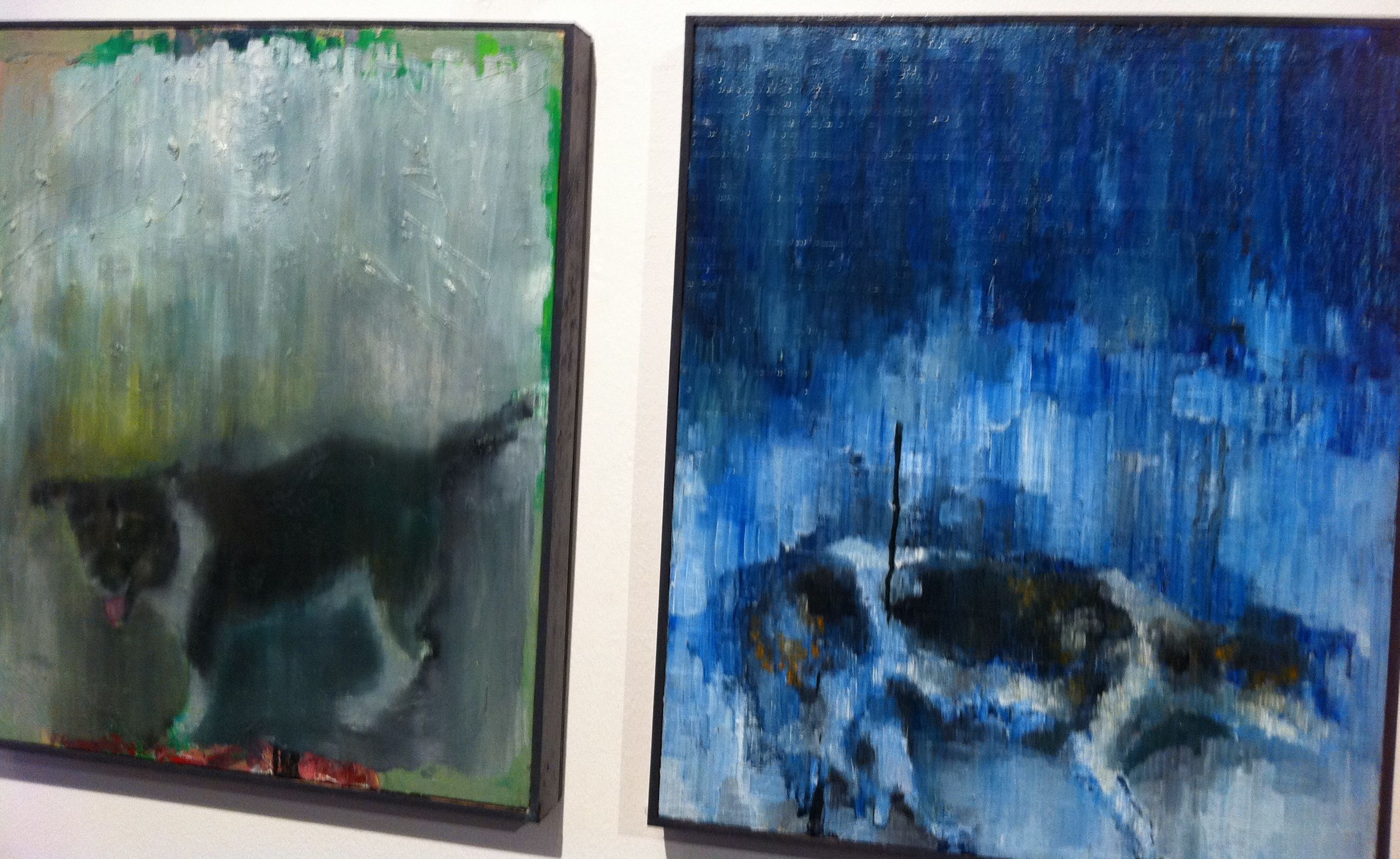 I enjoyed Maya’s smaller paintings, canvases not more than two feet in length (56 cm), which comprise all but three of the pieces she exhibits.  They portray single figures, one set of men, another of dogs; their features rendered indistinct. The men look mysterious and somewhat menacing, the dogs, in contrast, fuzzy and warm. Now who would you label as beasts?