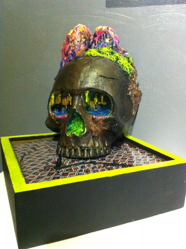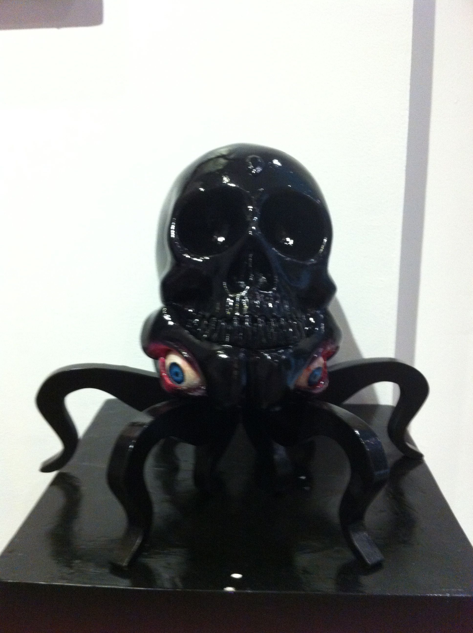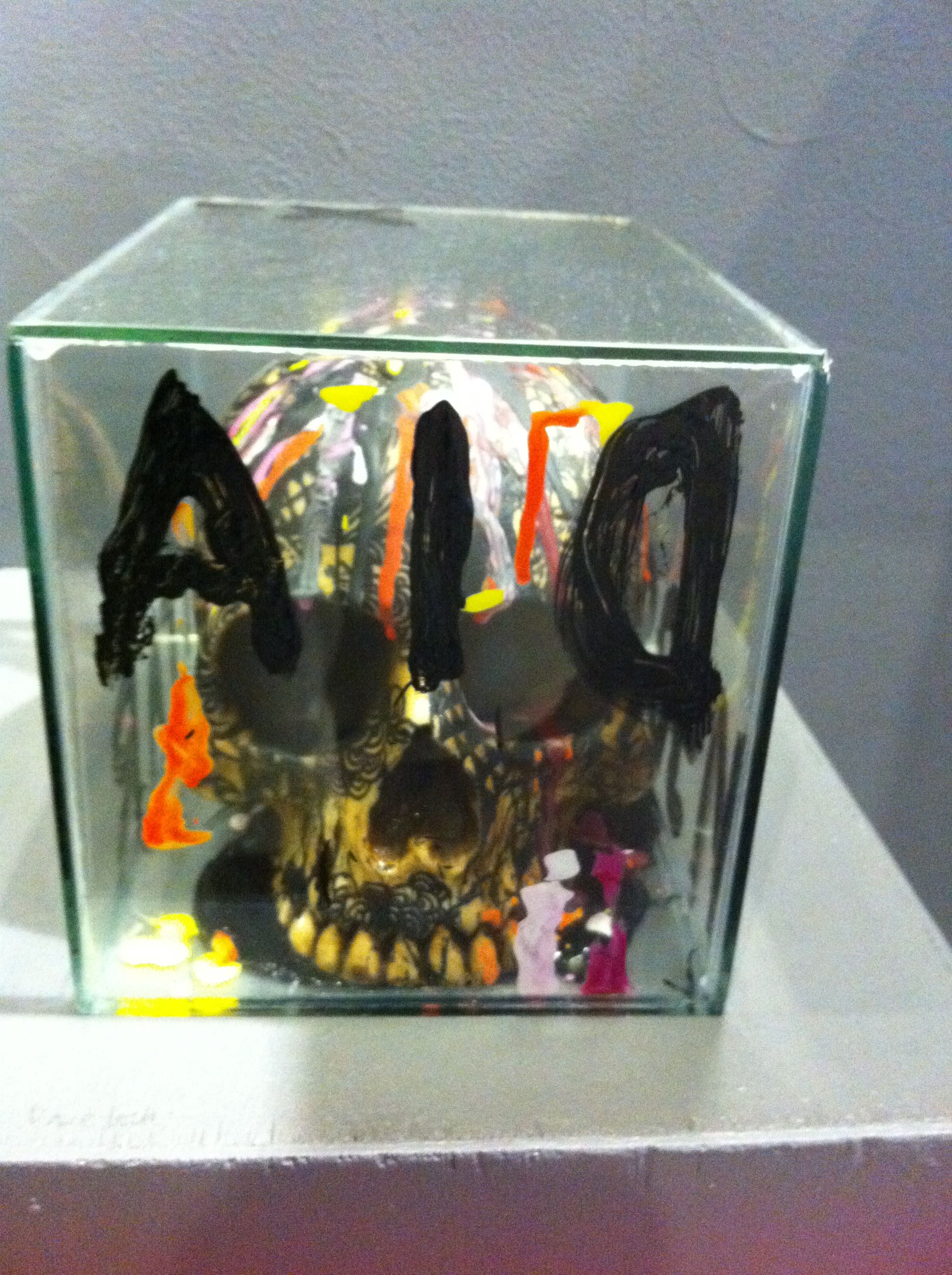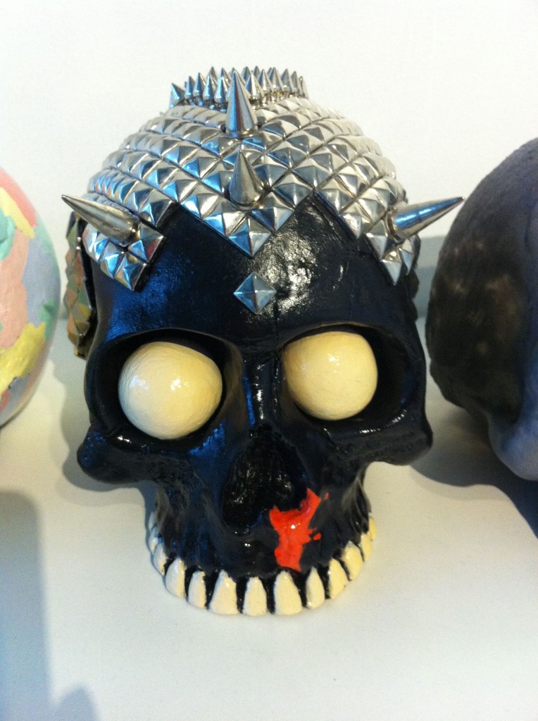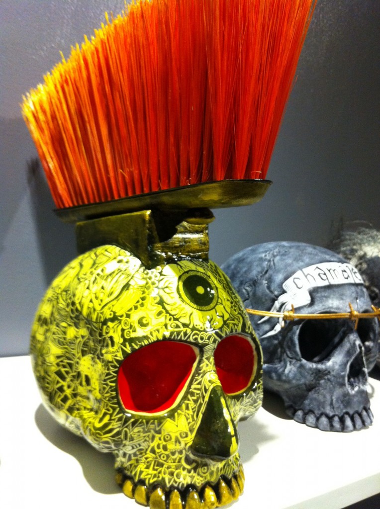 The skull must be to us as the peace sign was to the hippies and rebels of the 1960s and 70s.  We see it everywhere, on everything. The visual arts, especially, has adopted it an all manner of works.  Damien Hirst’s For The Love of God counts as one of the more notorious ones in recent history, platinum cast and encrusted in diamonds, priced at close to $100 million dollars.  Unfazed by the controversy created by the sale (or non-sale, depending on which report one subscribes to), the artist made another one, this time using the cast of an infant’s skull, to inaugurate the Gagosian Gallery’s Hong Kong branch early this year.  He called this second version For Heaven’s Sake.