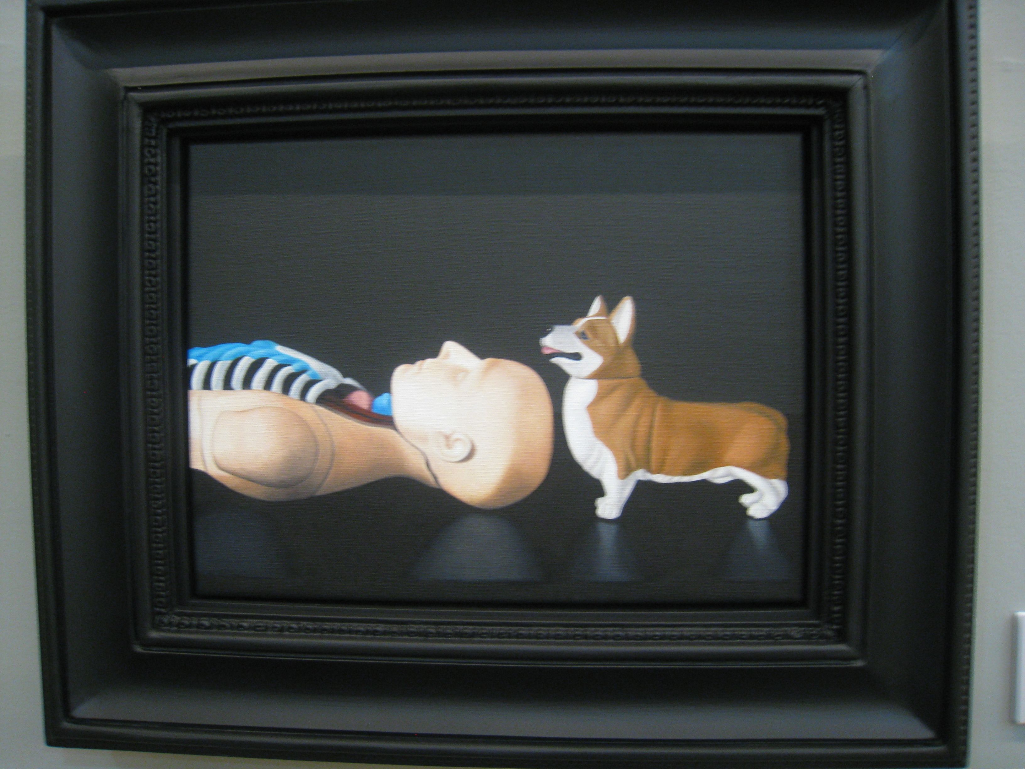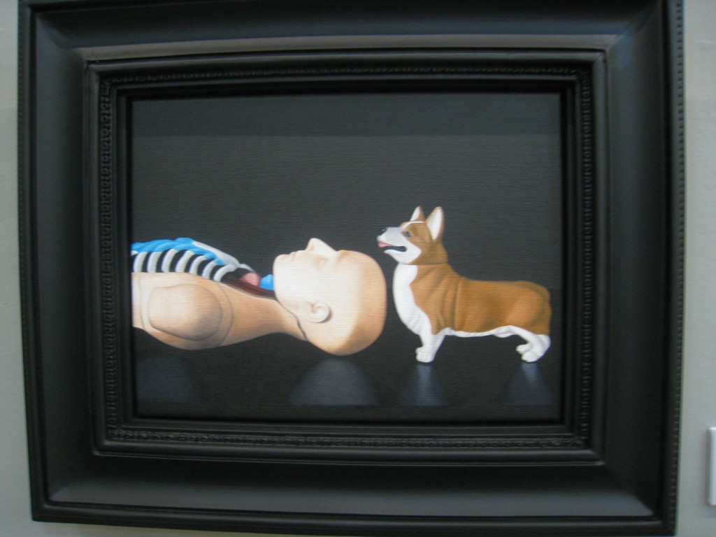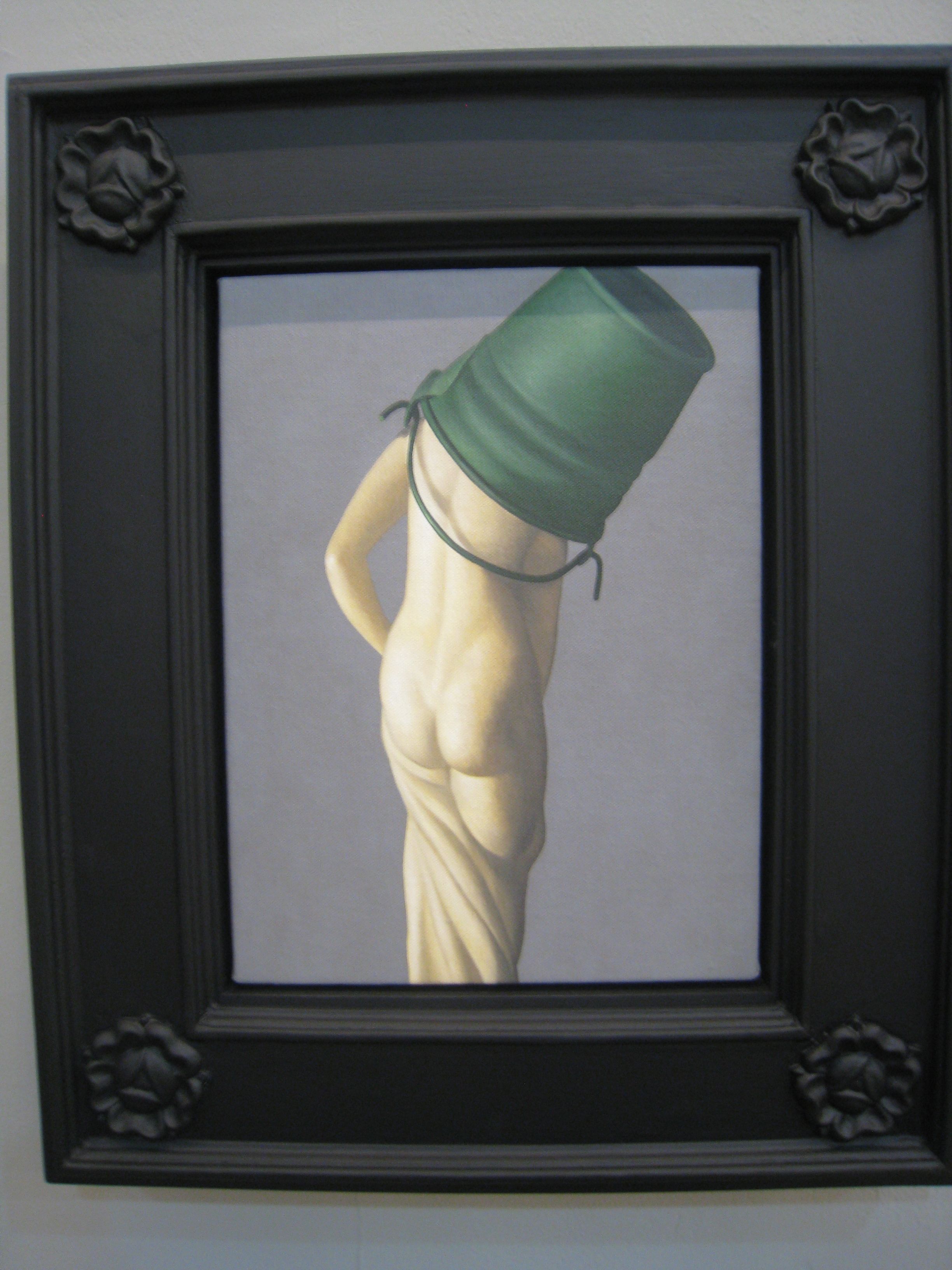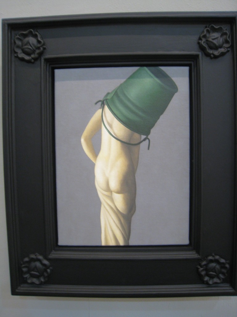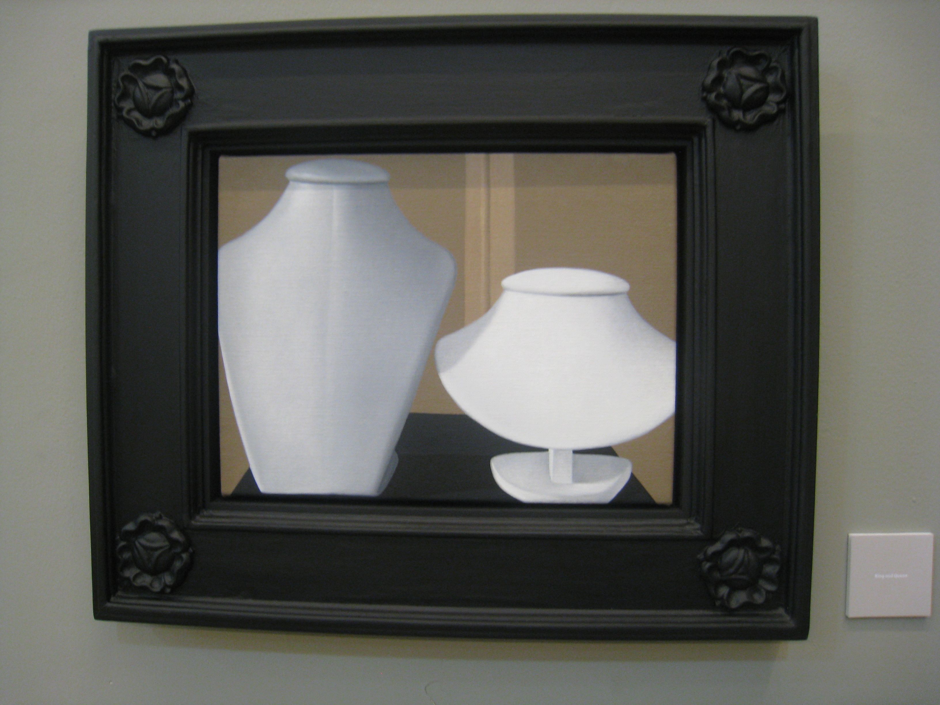 Bourgeois Dilemma marks Natee’s first solo exhibit in Manila. Now on view at Finale Art Gallery, he sent over a series of small works, each roughly the size of a legal document. They have been beautifully framed in wood hand-carved to his specific design, executed locally by craftsmen from Paete. He has painted concisely on linen, each item rich with symbolism. The empty mannequin torsos used to display jewelry in King and Queen hint at the prolonged absence from public view of the royal couple, the country’s heads of state. In the background, a wall of carton bound with tape implies that Their Majesties have been packed up, bundled out of sight. His approach differs from the obvious militancy we Pinoys are used to.