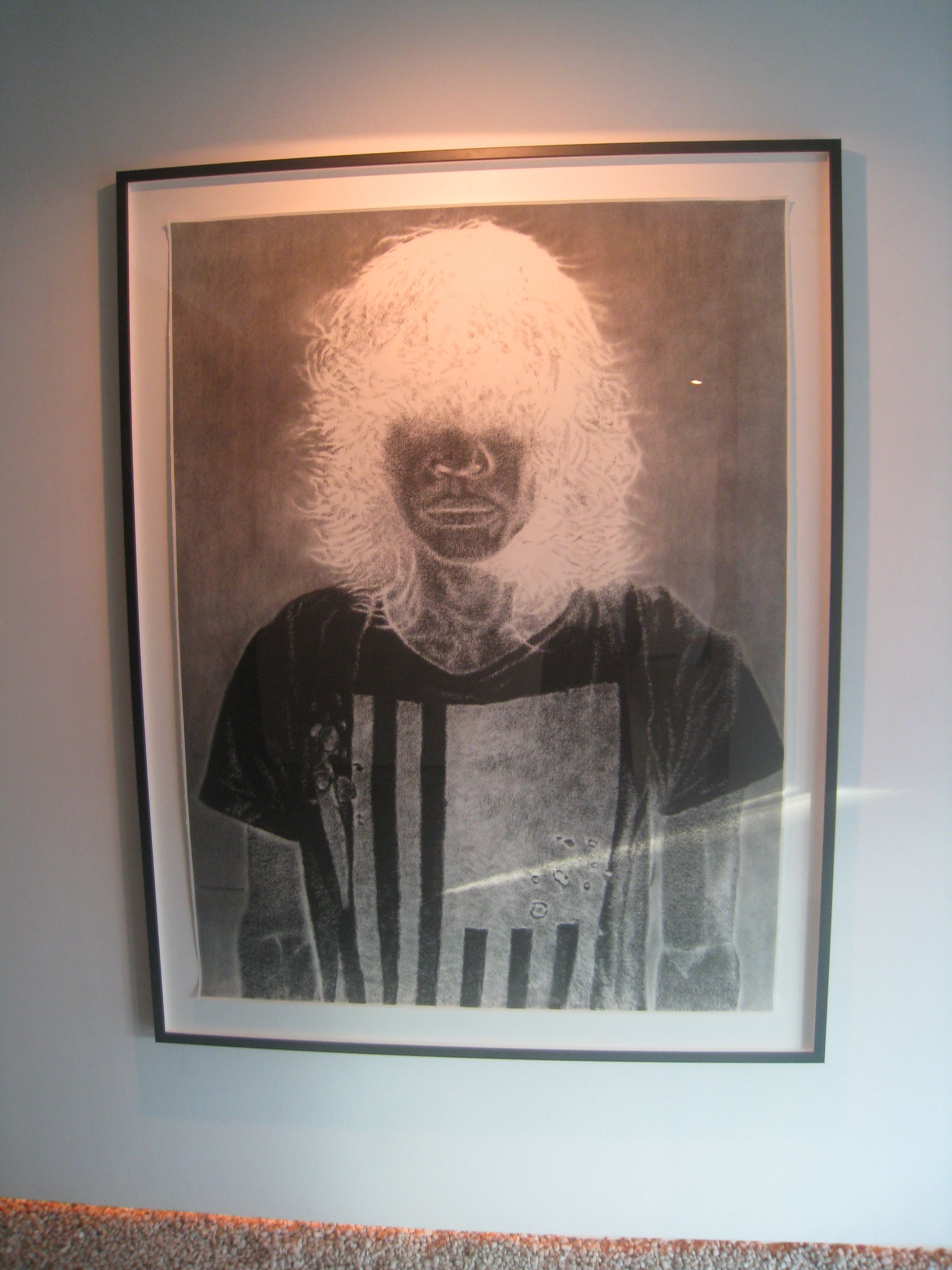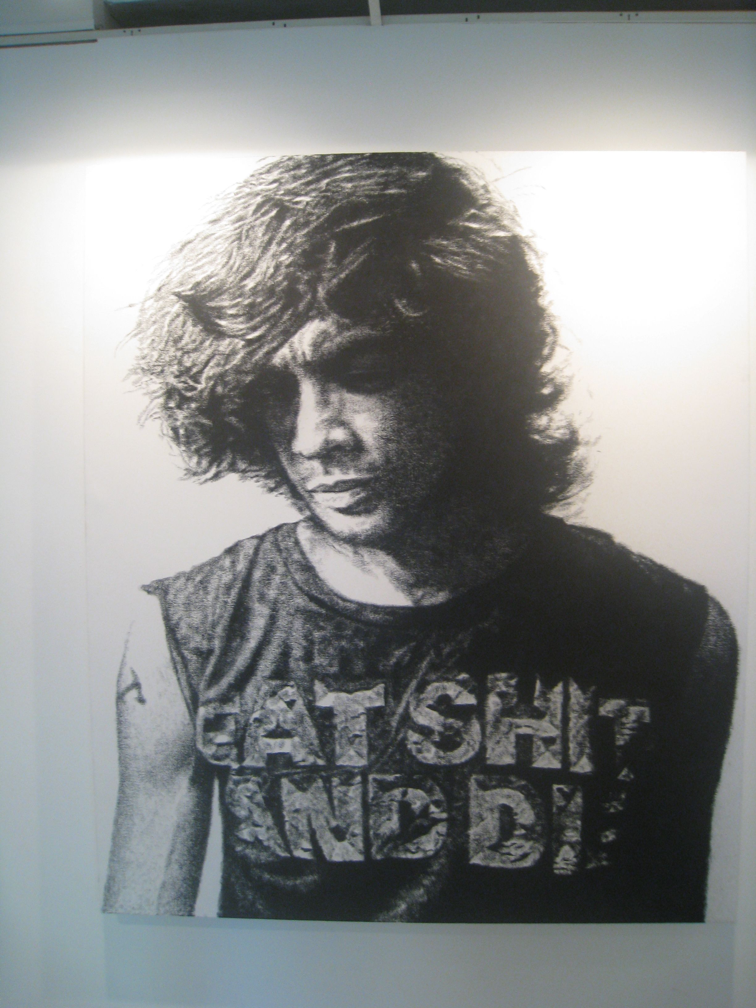 Kiko has made a concession to his signature look with the sole work he drew on canvas. His use of charcoal on the rough material gives the piece an agreeable texture, especially palpable in the ripples on the shaggy dude’s shirt, in the portion where it says “Eat Shit And Die”. Now that sass is vintage Kiko.