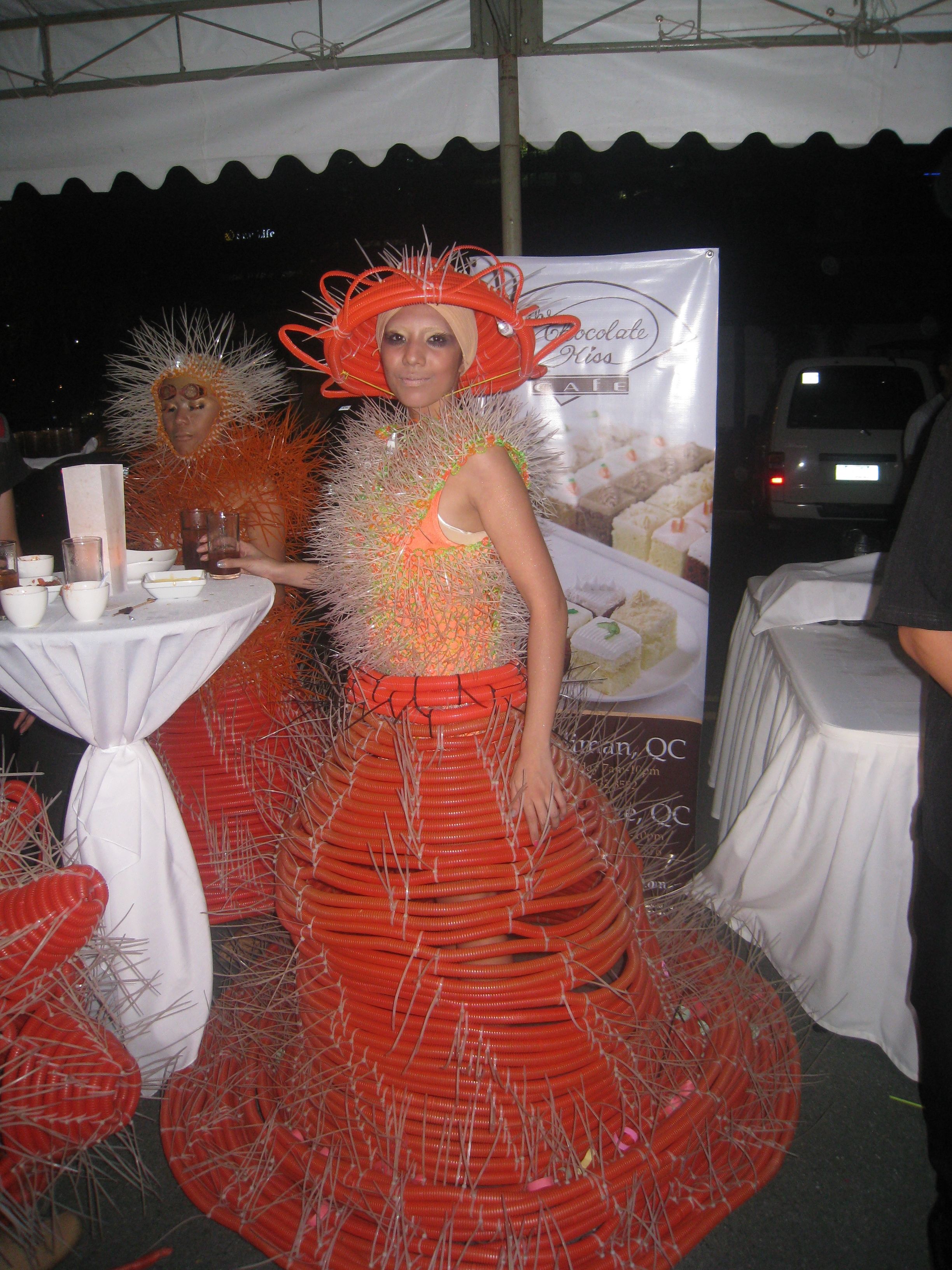 Leeroy has made news lately as the creator of the outfit that Lady Gaga donned for her Marry The Night video.  Leeroy showed off more of his wearable art on the night of the outdoor gallery’s launch.  For their performance that evening, he dressed the Sipat Lawin Ensemble in creations that echoed the sculptures on site.