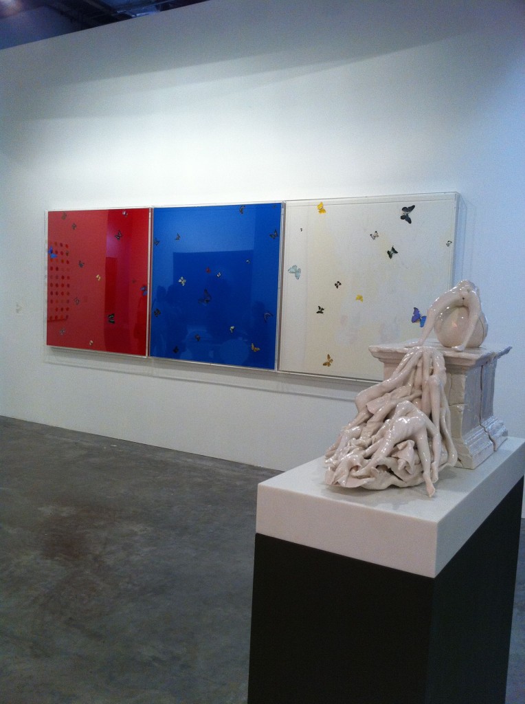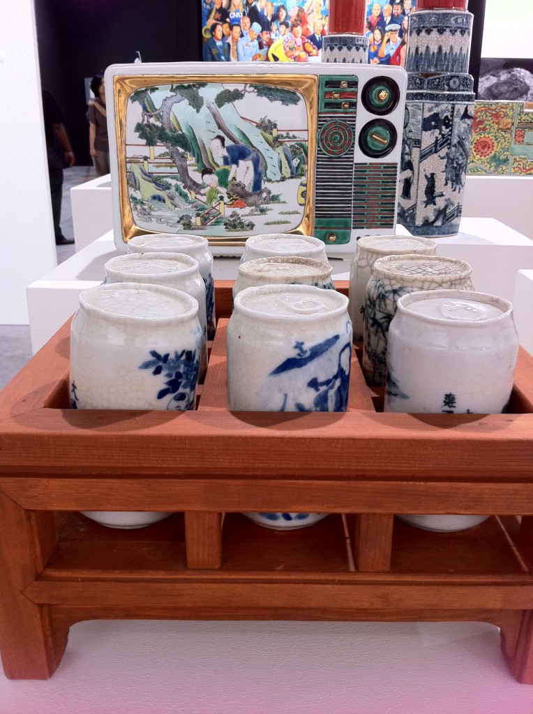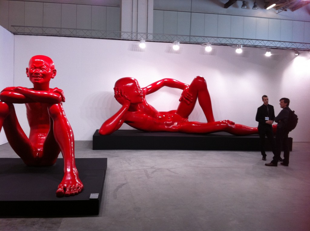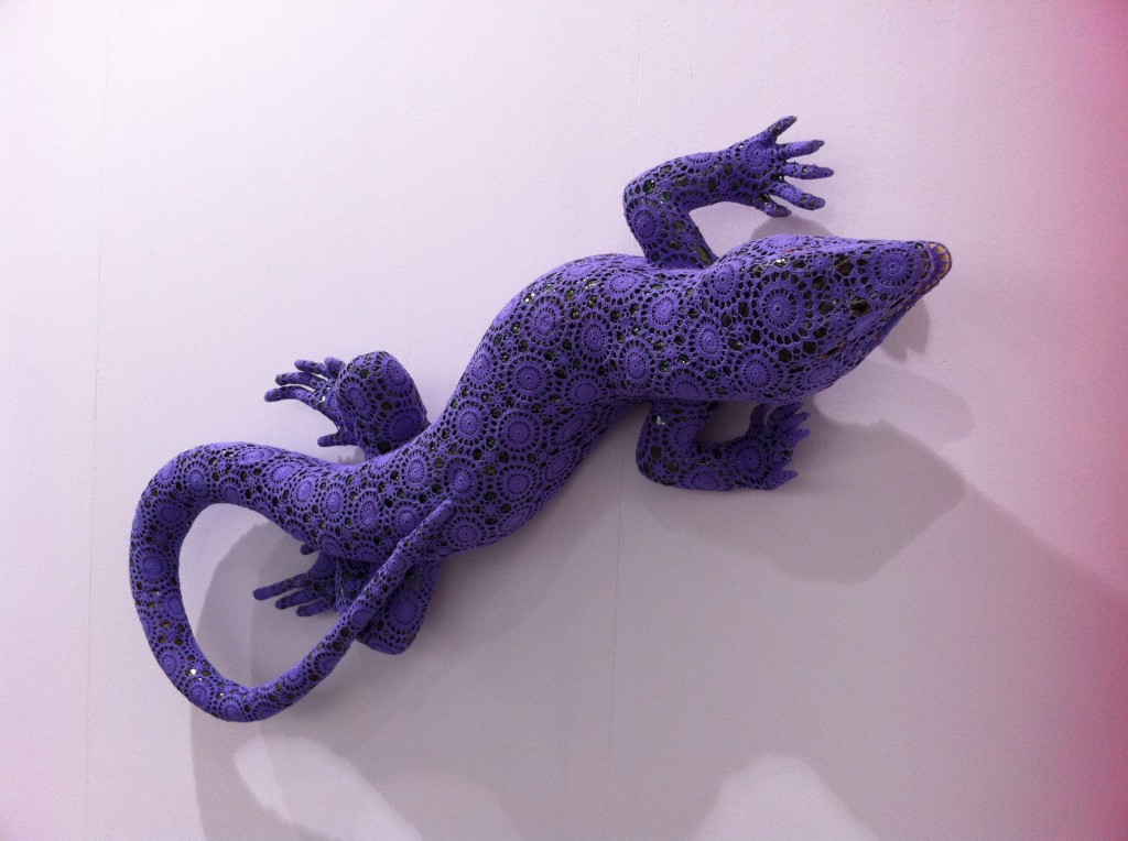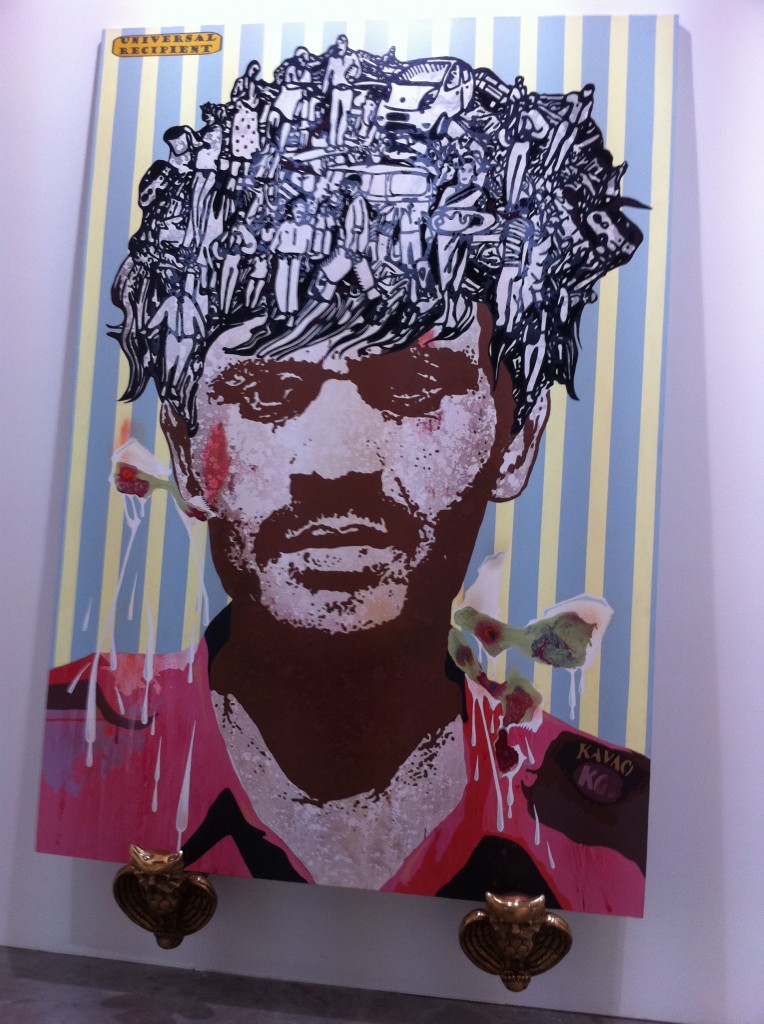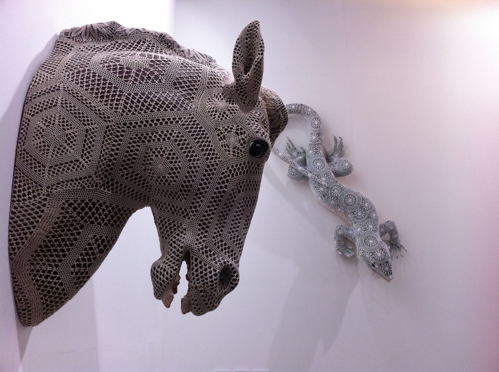 The powerhouse galleries like White Cube, Victoria Miro, and Marlborough opted for sedate pieces from their stable of artists. Galerie Perrotin and Haunch of Venison chose well, featuring artists the market could easily relate to. Japanese artist Mr. featured prominently in Perrotin’s space, while Haunch of Venison showed paintings from Indian artist Jittash Kallat, beautiful collages from Tibetan Gonkar Gyatso, and wonderful lace-covered porcelain animals from Portuguese Joanna Vasconcelos. While these don’t count as Vasconcelos’ most important work, I totally loved the pieces her gallery showed. I hope they bring her bigger pieces next time.