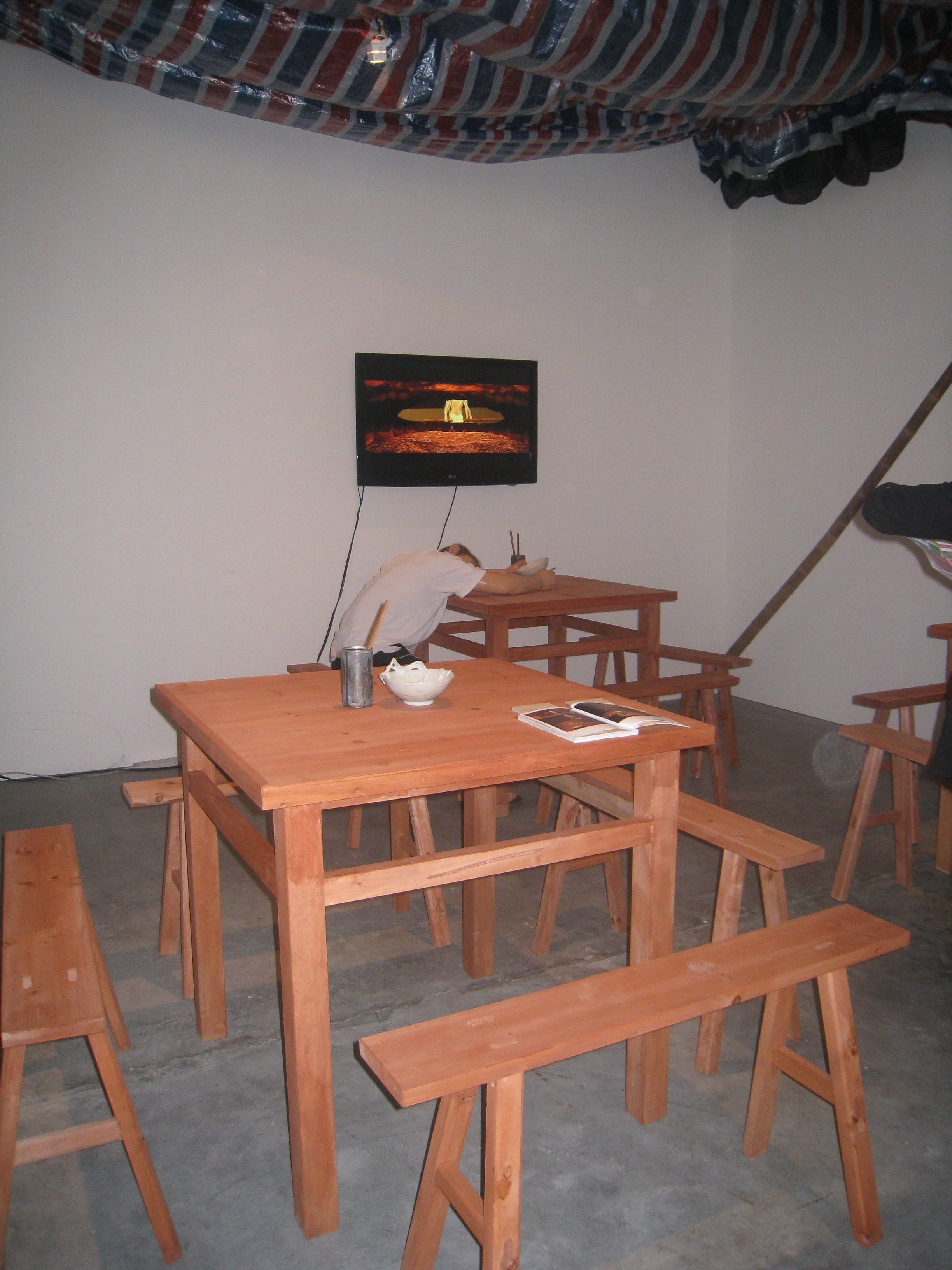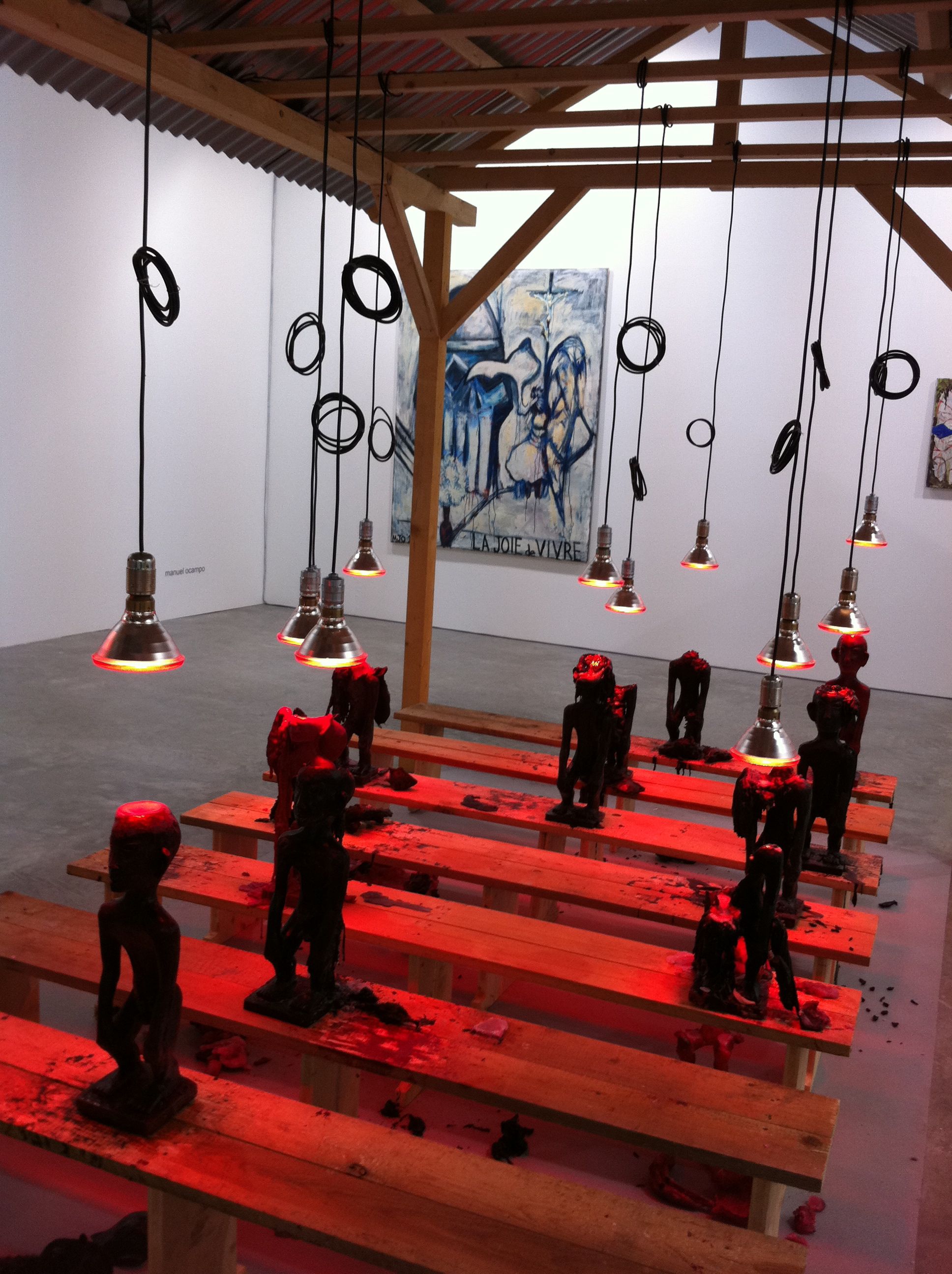 Gaston Damag traveled from his base in France to reprise one of his pieces from 2003, originally shown at UP Vargas Museum. His Ifugao heritage, always inherent in his art, again played a large part in this work. For Conversion 2 at the Galerie Zimmermann Krachtowill space, he took inspiration from the church perched atop his hometown in the Mountain Province in Northern Philippines. Gaston set rice gods, bululs, made from paraffin on rows of rough wooden pews. Heated lamps dangling from the ceiling of the reconstructed chapel made the wax figures slowly melt, distorting them, allowing them to return to their original state, ready to be reformed.