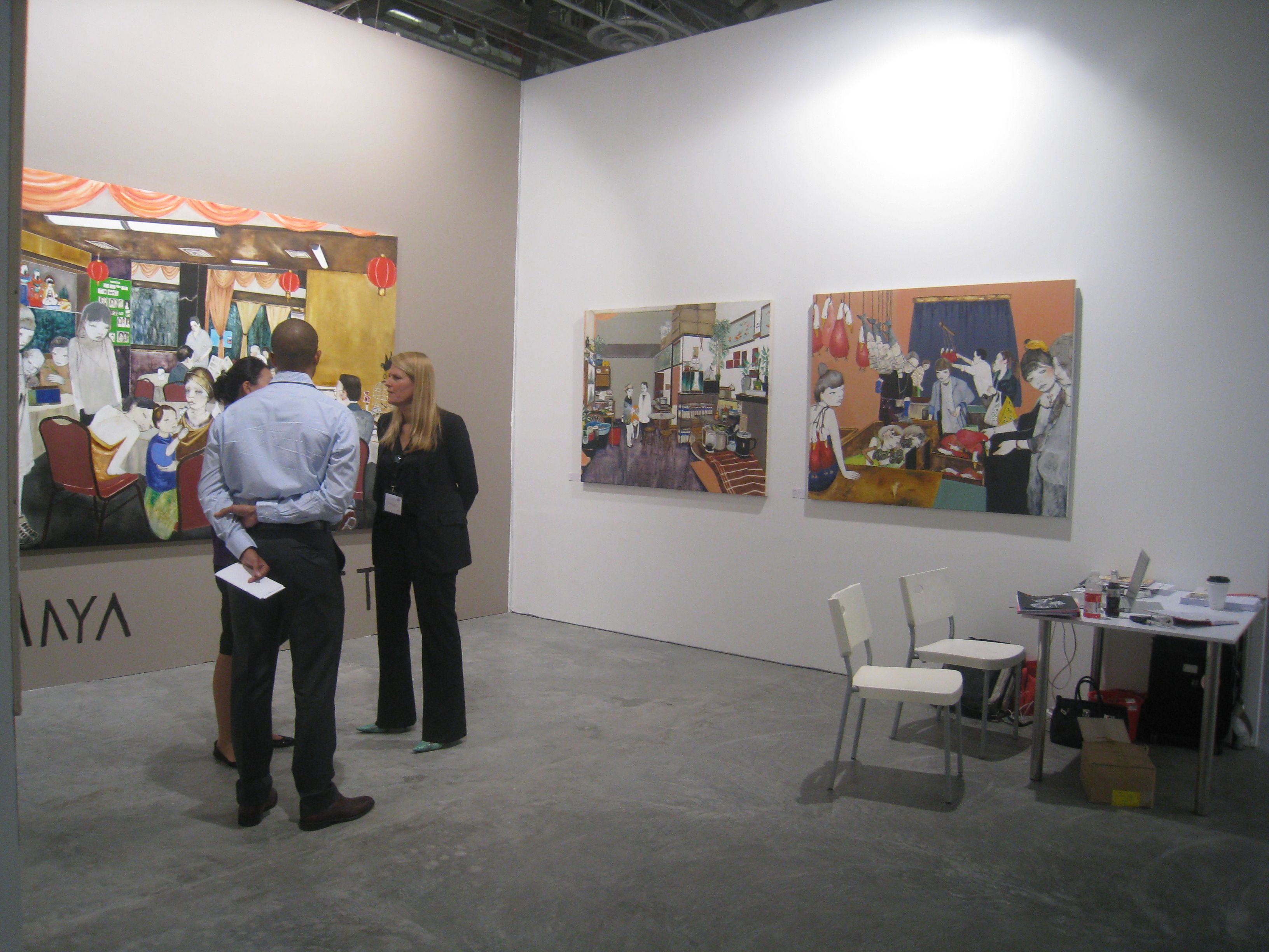 Viewing Rodel, Daisuke Miyatsu, a member of Art Stage Singapore's exclusive Collectors Club greets Yumie Wada of Wada Fine Arts