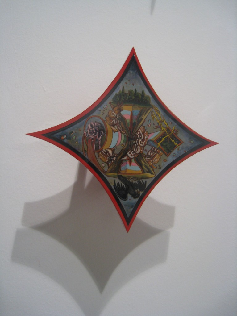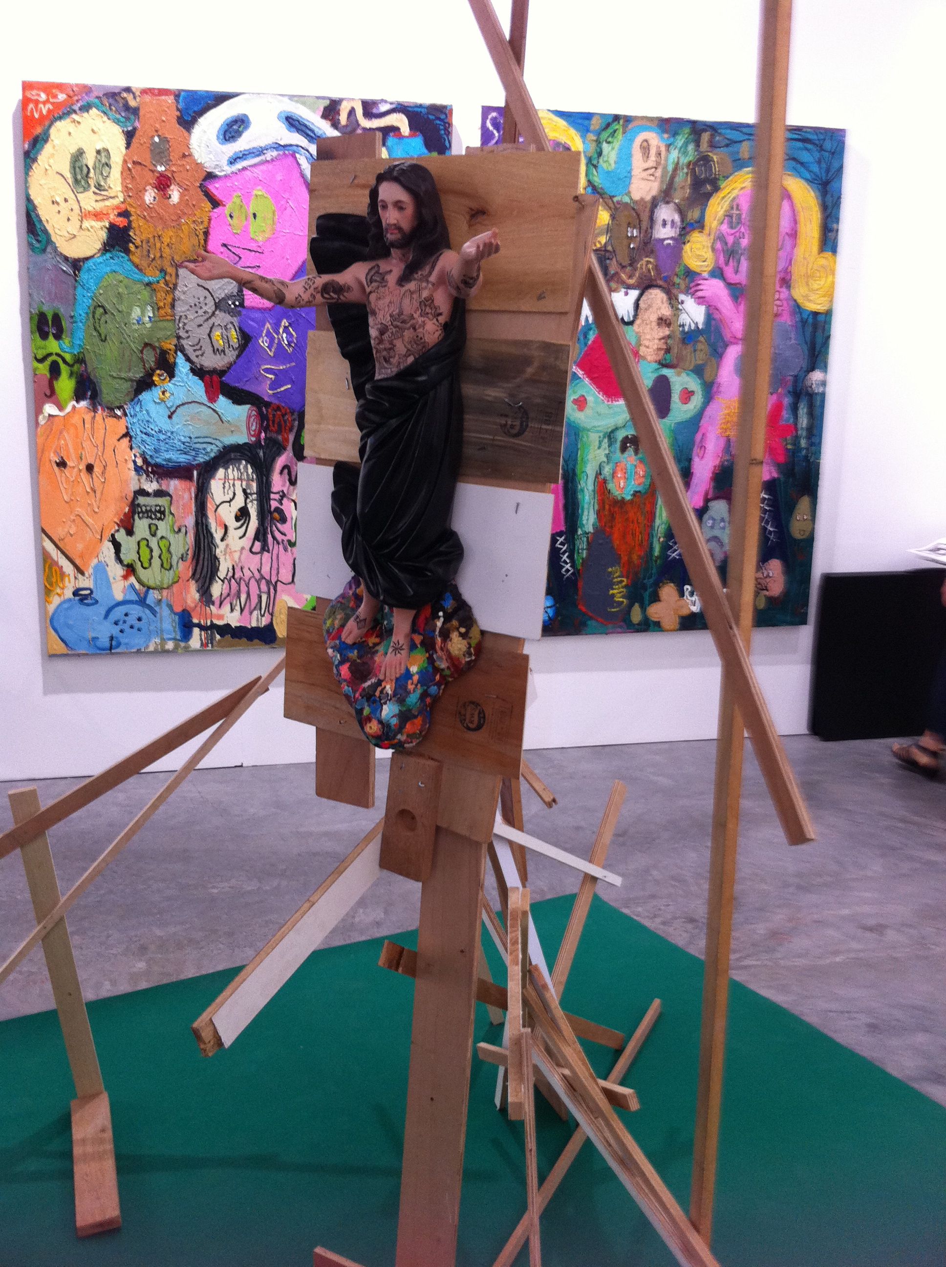 Manuel Ocampo complemented Gaston’s piece with his painted interpretations of church windows mounted on the walls of the space.