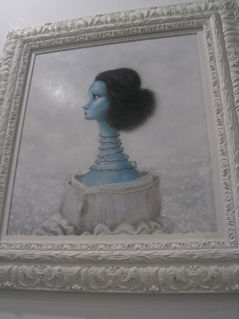The silverlens crew stayed busy from the get-go. Patty Eustaquio delivered another beauty from her Cloud Country series, a lovely painting of a dead bird morphing into a pink bloom, while the consistently good Mariano Ching had two drawings and a wall-bound assemblage from cut and painted steel. Luis Lorenzana framed his portraits of wide-eyed fantastic creatures in white carved wood, while Frankie Callaghan’s luminous photographs occupied one whole wall.