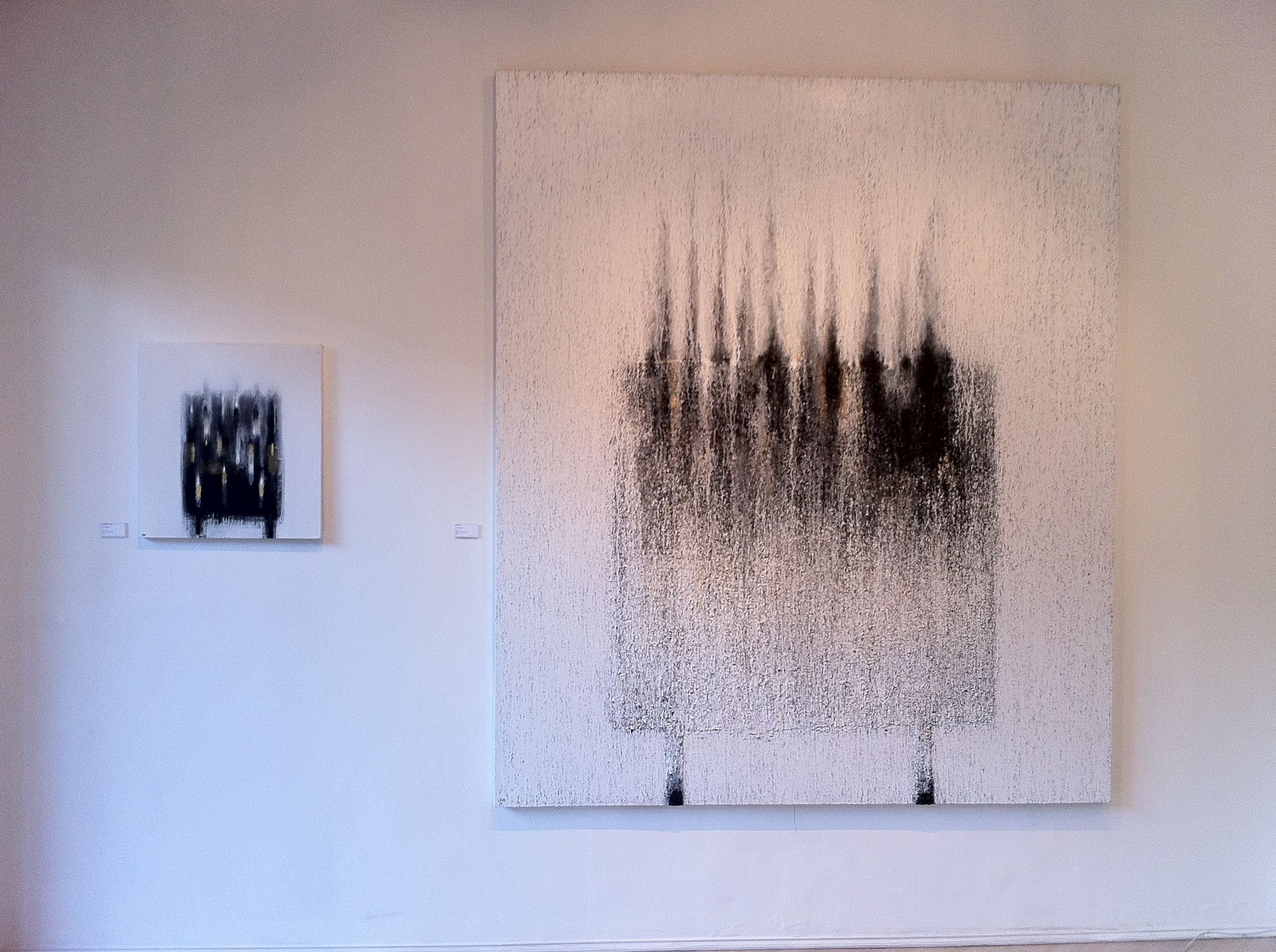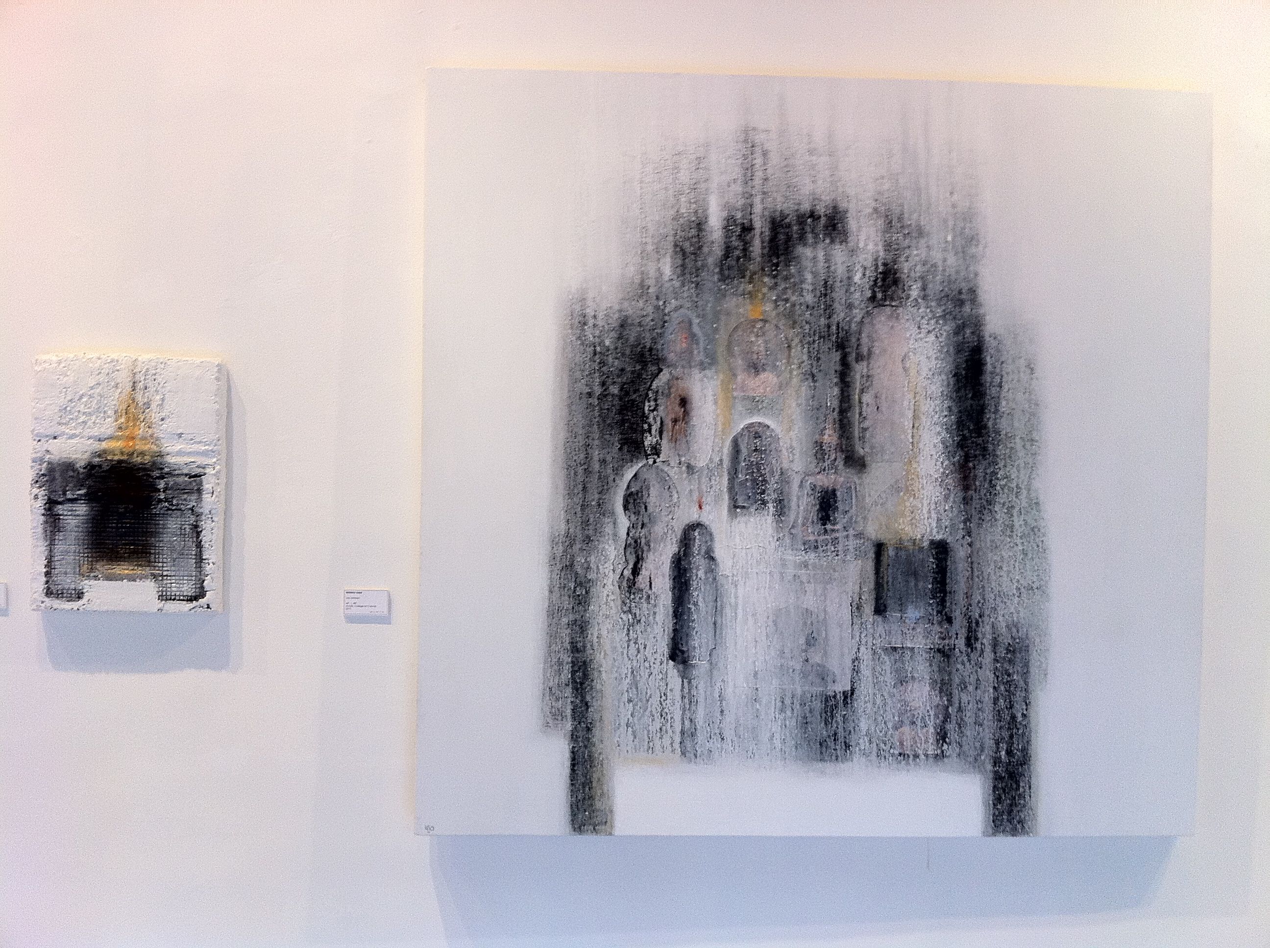 Lao calls this exhibit Soot, referring to the deliberate brushes of black acrylic, graphite, or charcoal powder that appear like burnt portions on several of his canvases. Newer to my eyes are the two pieces where he collaged images of Buddha, incorporating them to appear as surprising details apparent only upon close inspection. Quite an extensive addition to his body of work, Lao has brought out 21 paintings in various sizes, from a substantial 213×213 cm (7x 7ft) to the extremely manageable 38×28 cm (15×11 inches). Seeing them arrayed on the gallery’s walls, one can’t but marvel at the timelessness of Lao’s work.