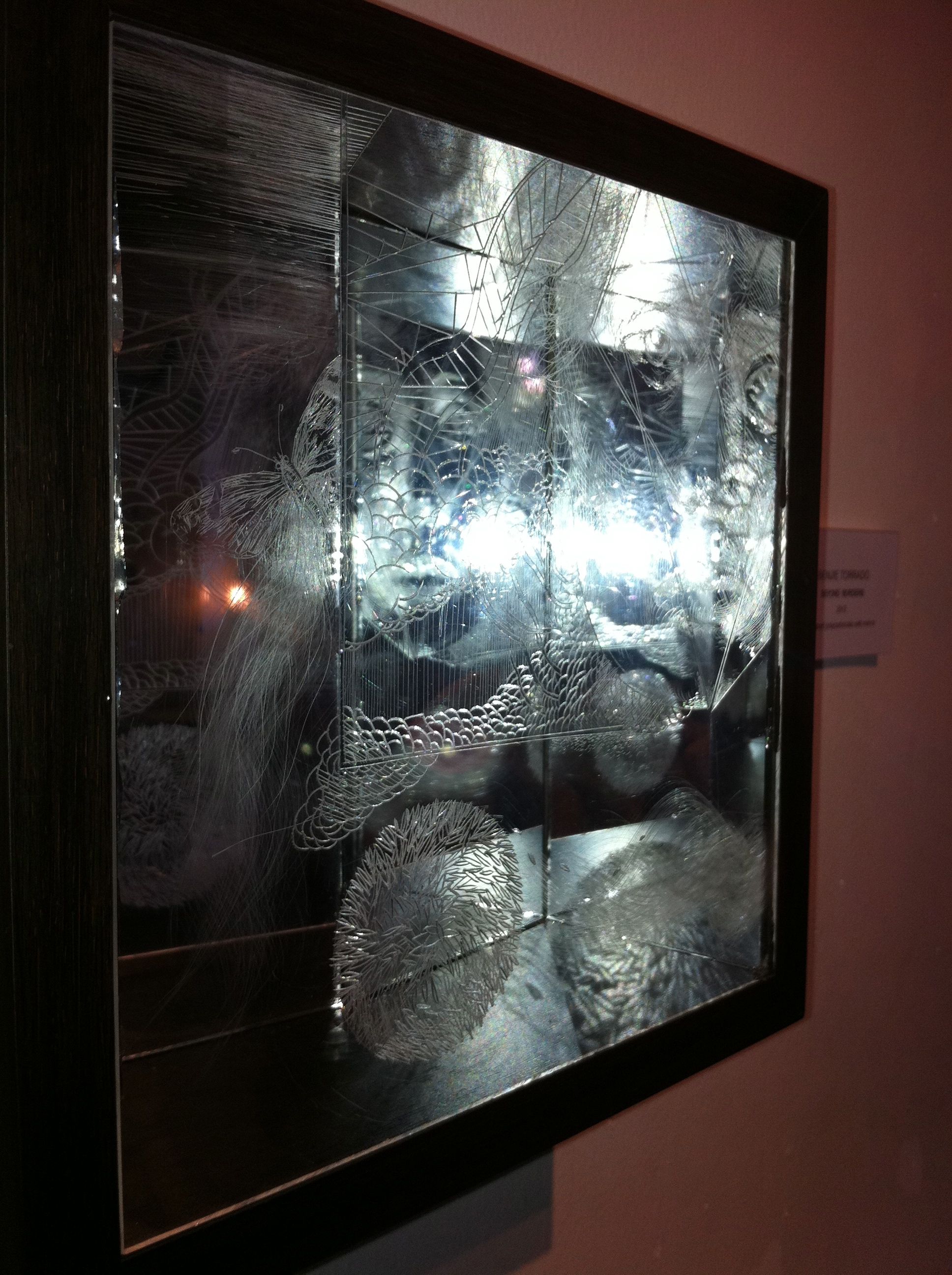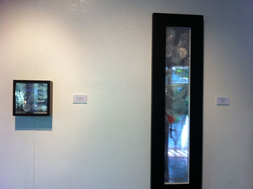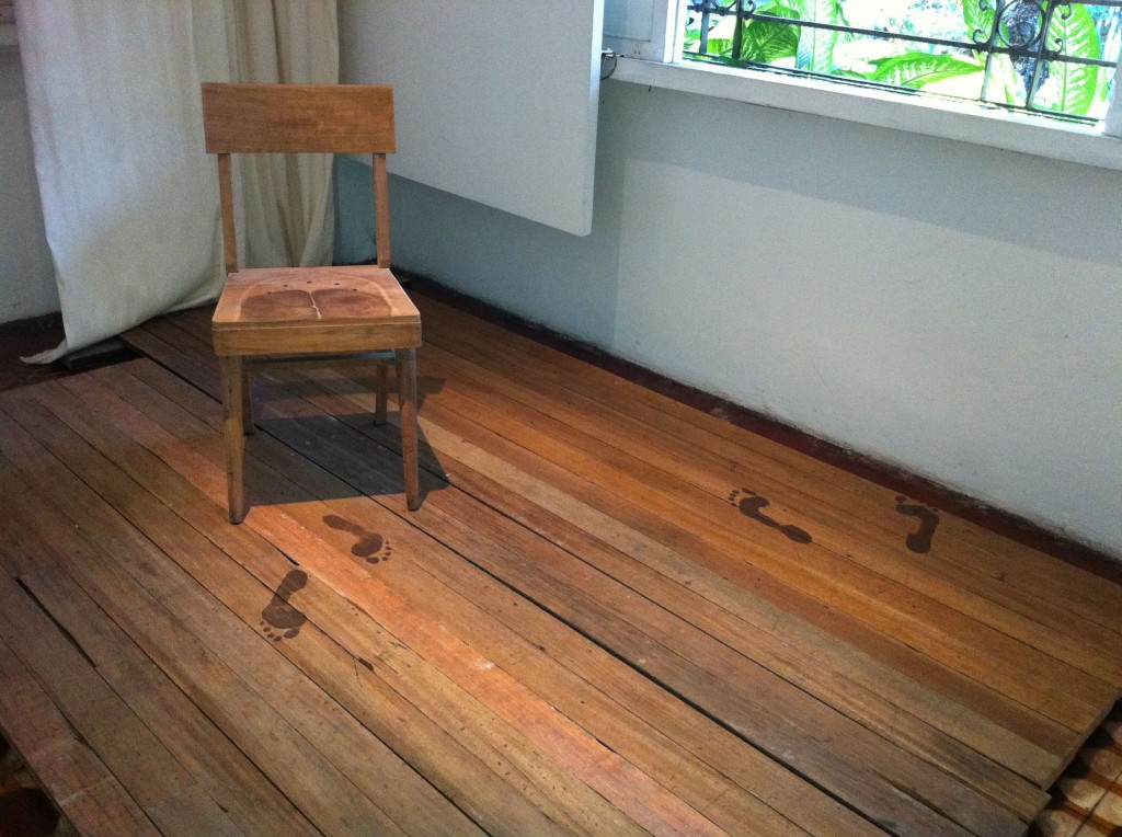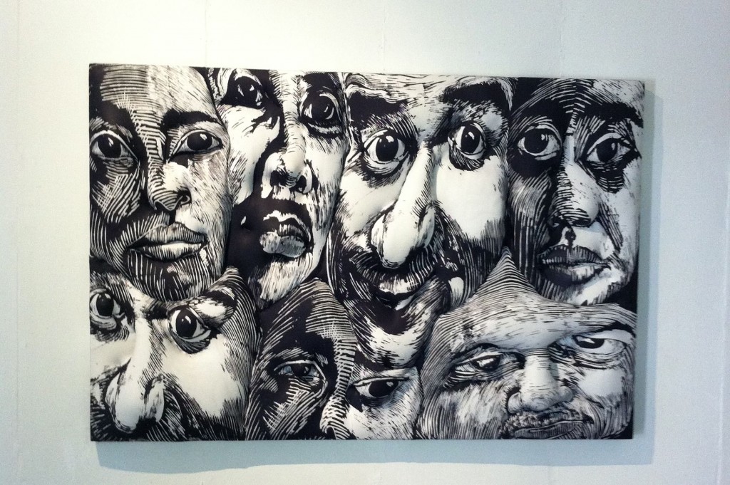 In the ground floor, Ambie Abaño and Benjie Torrado Cabrera catch one’s attention first. Ambie has brought out another edition of her rubbercut faces on spandex, Seeing You Seeing Me 3, an iteration of her 2006 Philip Morris Philippine Art Awards winner. Her installation, July, stands across it. Ambie’s second piece hints at a presence, at someone who has just left. We see imprints on a single wooden chair and footprints on the wooden slats beneath. Nearby, Benjie’s etched acrylic panels benefit from the mirrors he has provided as backing; they frame and reflect his engravings and turn them into an infinite swirl of patterns.