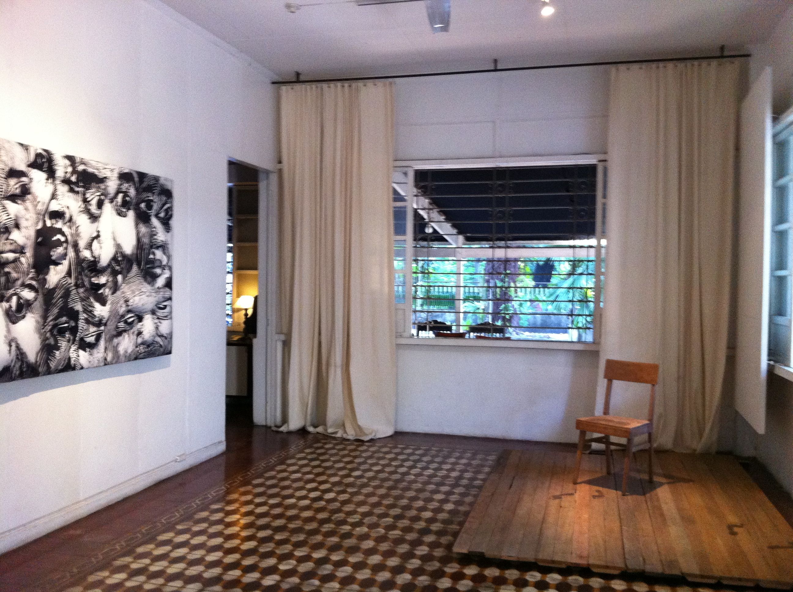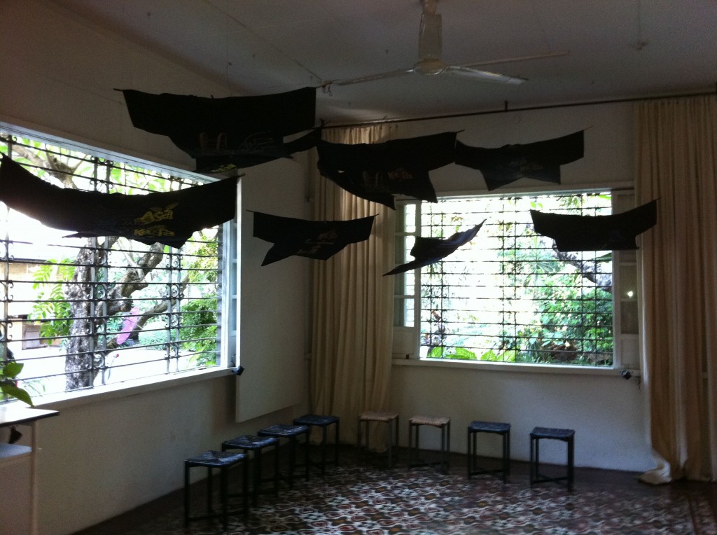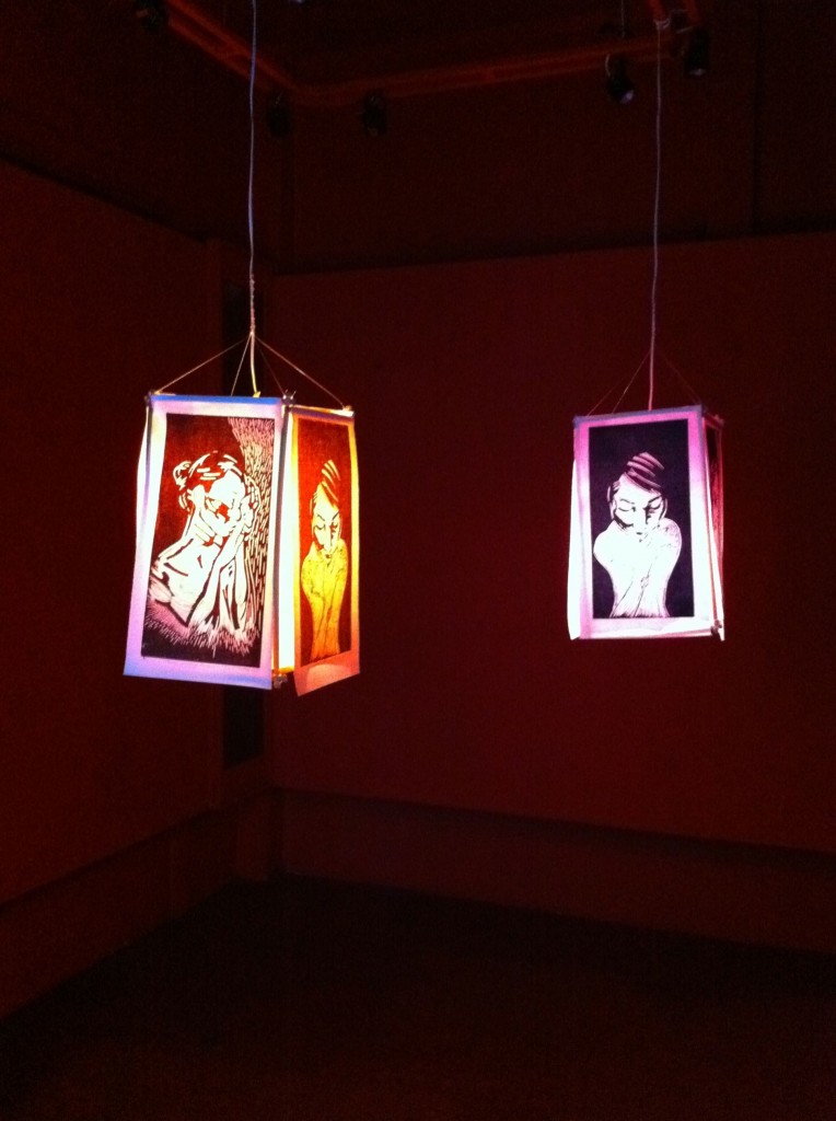 A flock of Chong Ardivilla’s printed tees hang from the ceiling in the other side of the room, recalling bats in flight. Inside the ground floor’s red alcove, Anna Austria’s has lit two lanterns made from rice paper printed with female forms.