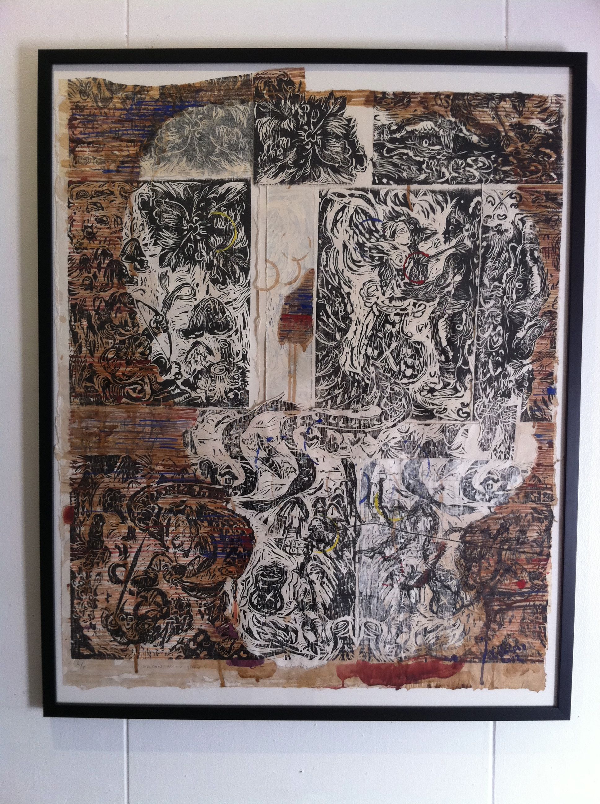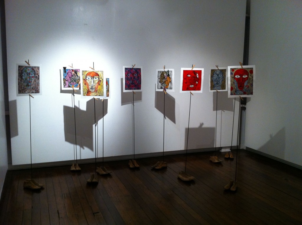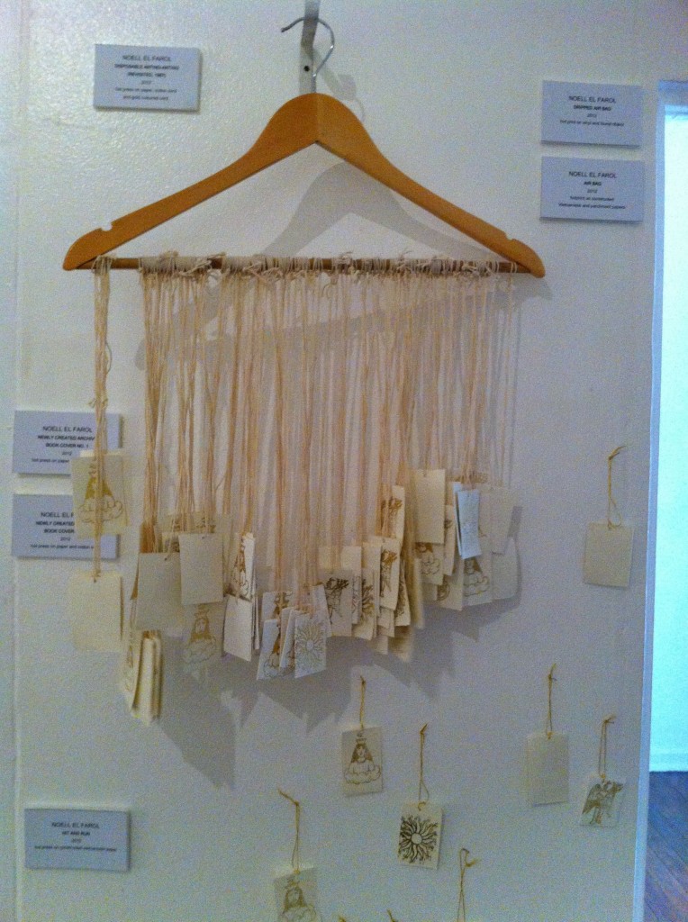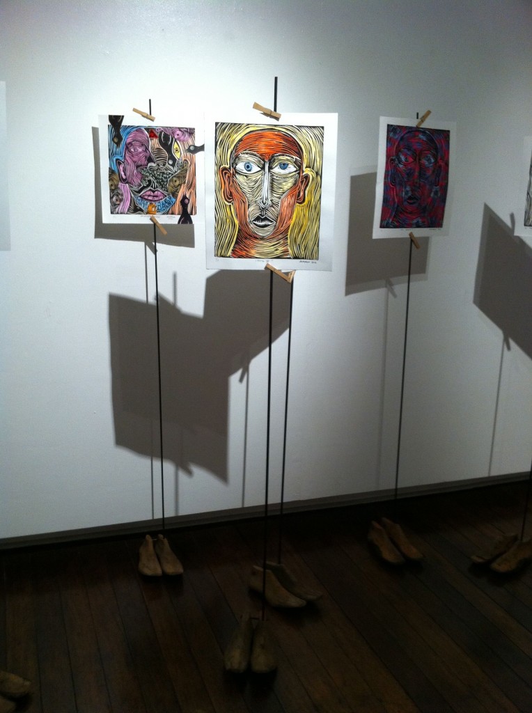 I found the most interesting works in the second floor’s main exhibit area, those of Noell El Farol and Angelo Magno. Noell put together a whole range of pieces. The ones I liked made use of museum postcards that seemed like they had been splattered with paint, an effect achieved through metallic prints. Angelo’s stood out for the innovative way he showcased his rubbercuts, creating free-standing pieces by attaching them onto metal poles supported by wooden shoe lasts.