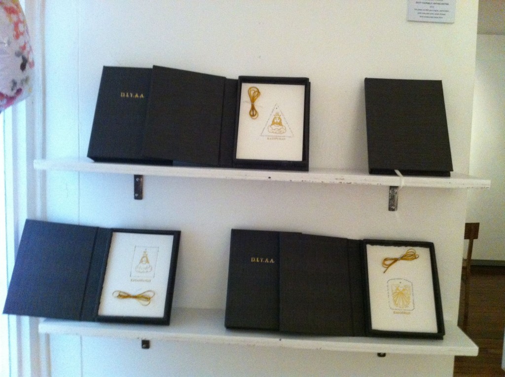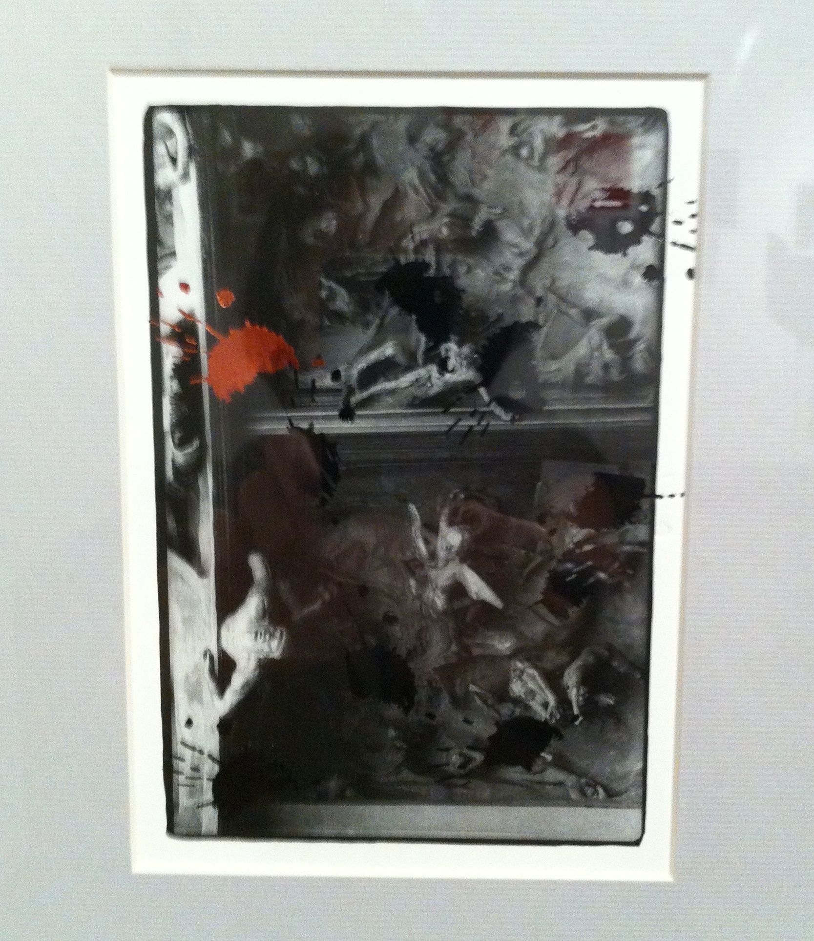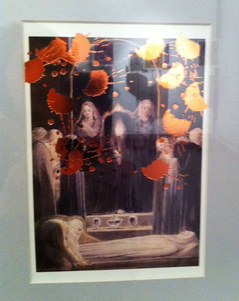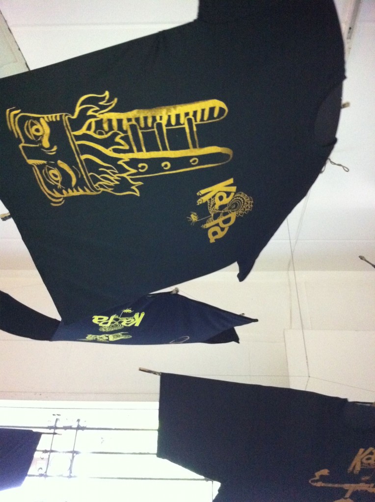 I found the most interesting works in the second floor’s main exhibit area, those of Noell El Farol and Angelo Magno. Noell put together a whole range of pieces. The ones I liked made use of museum postcards that seemed like they had been splattered with paint, an effect achieved through metallic prints. Angelo’s stood out for the innovative way he showcased his rubbercuts, creating free-standing pieces by attaching them onto metal poles supported by wooden shoe lasts.