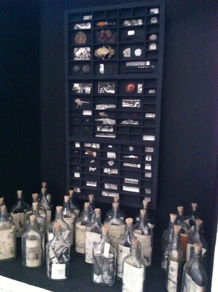 Pandy Aviado takes over the niche halfway up the stairs to display printed parchment sealed inside clear bottles. He has arranged them to stand before an assemblage of etchings and found objects. In the upstairs hallway, Joey Cobcobo’s woodcuts fill up the walls.