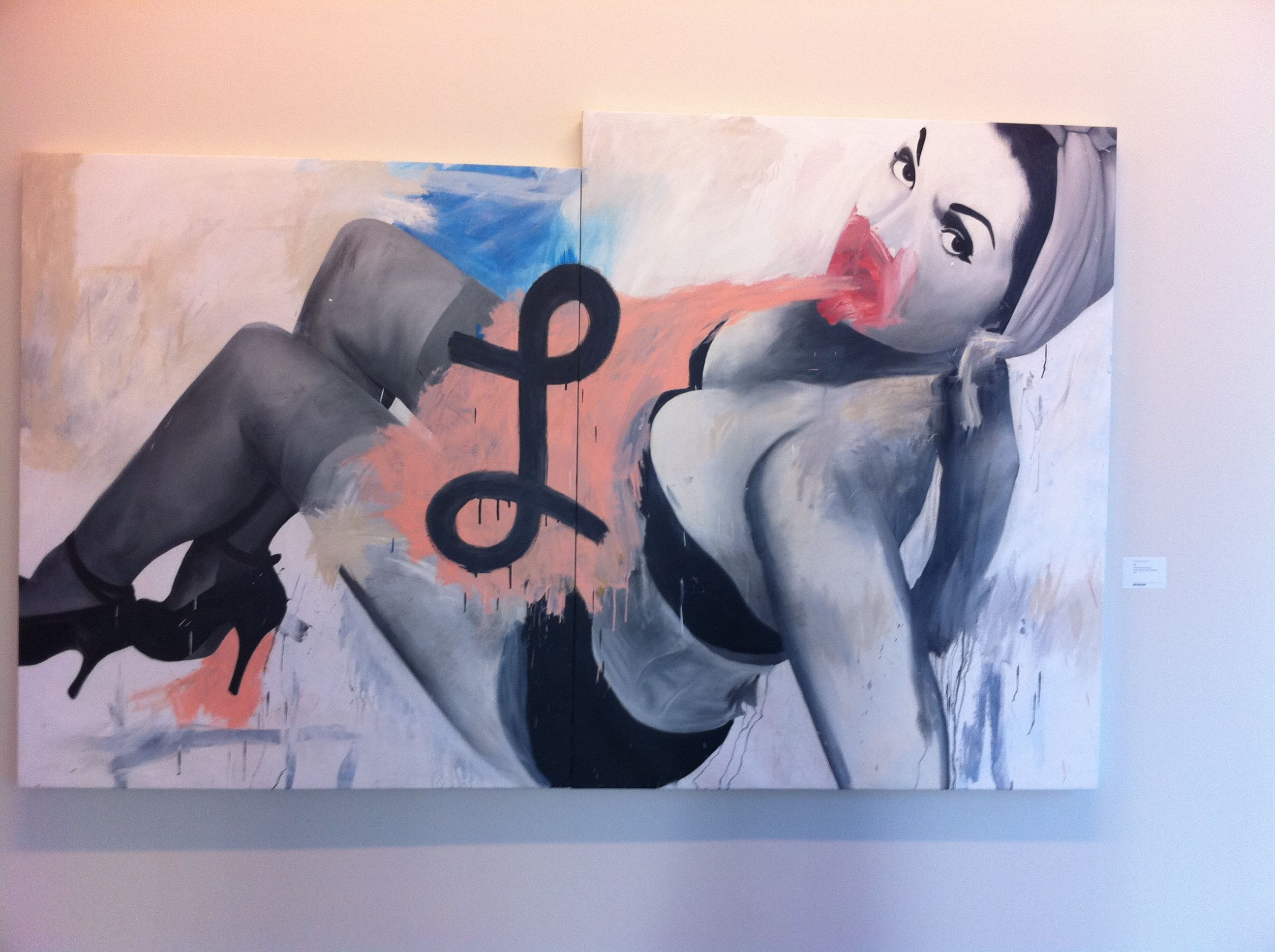 At Maculangan has made his name as one of our more successful commercial photographers. What I did not realize until now is that he actually majored in Painting at the University of Sto. Tomas. He returns to this medium with oil and beeswax renditions of pin-ups from the 1940s. He has de-glamorized these women with his menacing impressions of them in black and white, smeared here and there with the occasional splotch of color.