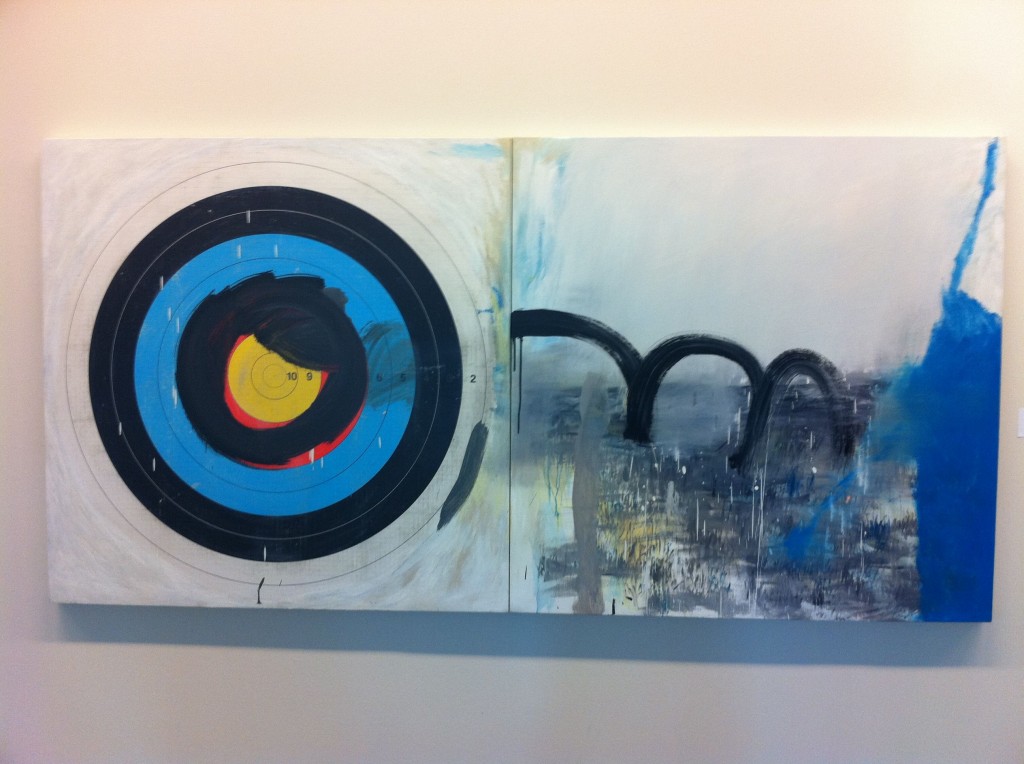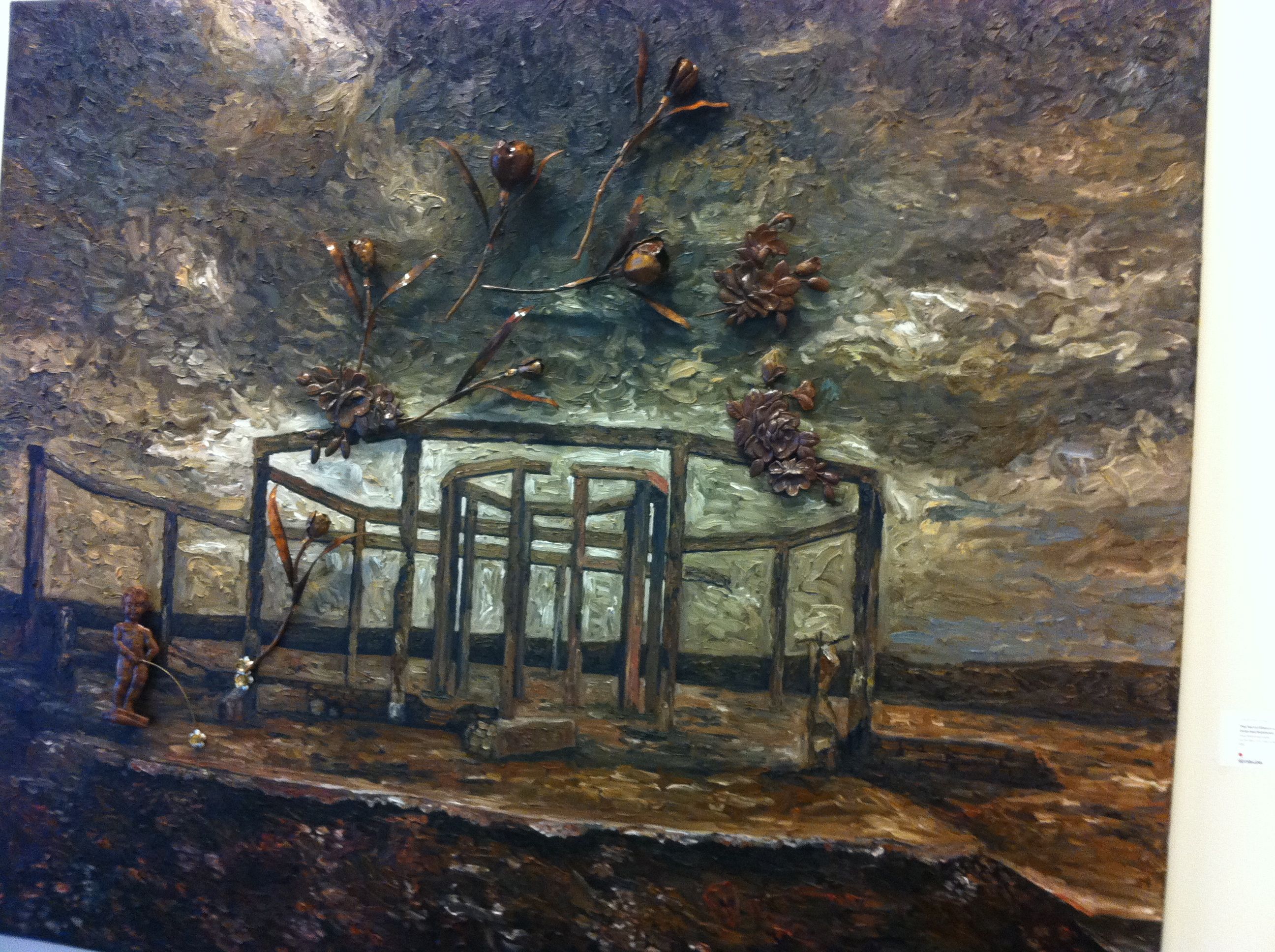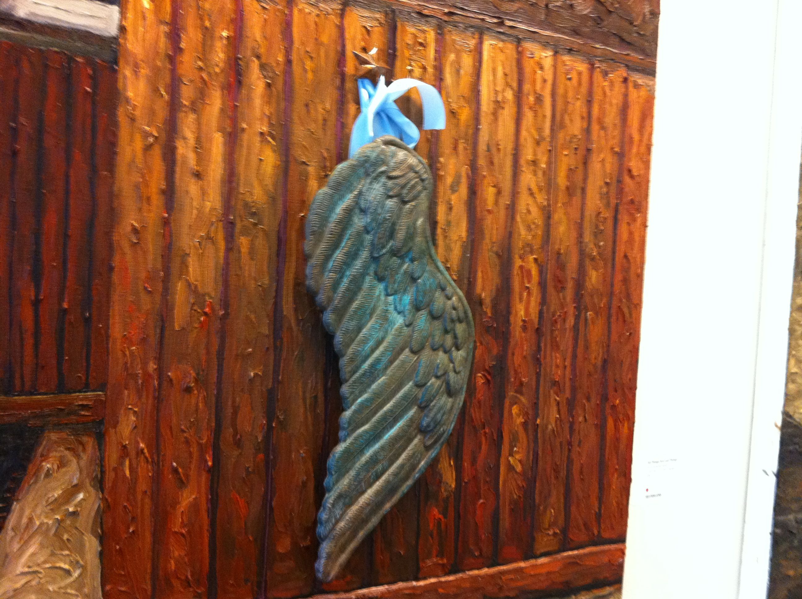 They hang side by side with Jonathan Ching’s paintings, thick dabs of paint depicting subjects also taken from familiar photographs. Jon incorporates commissioned copper objects to embellish his paintings. I remember when he first experimented with this device, some three years ago now. Here we experience it expanded, polished, and turned into his visual signature.
