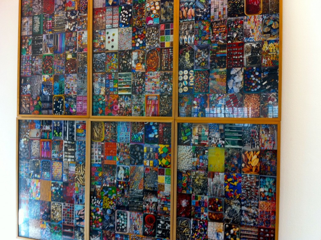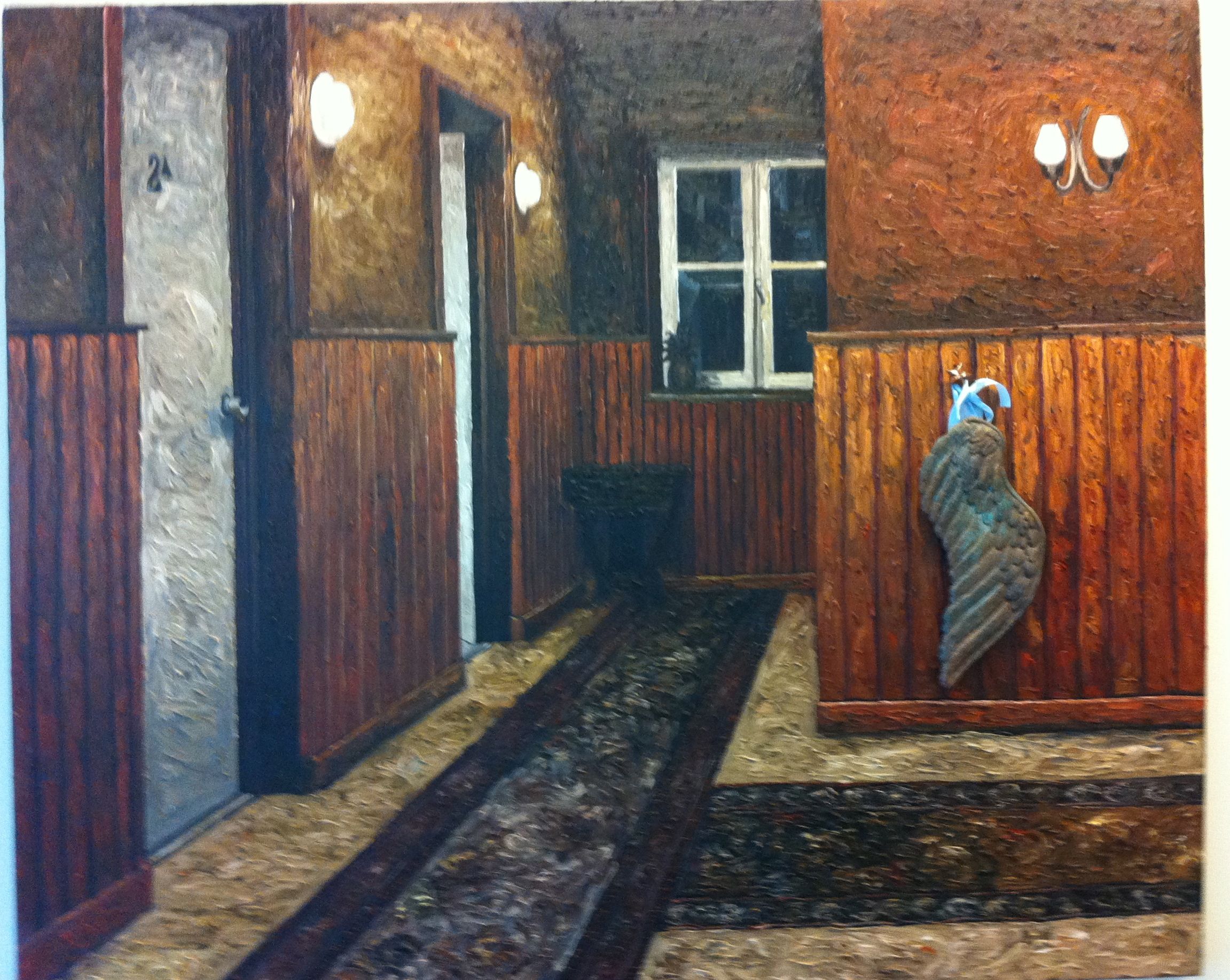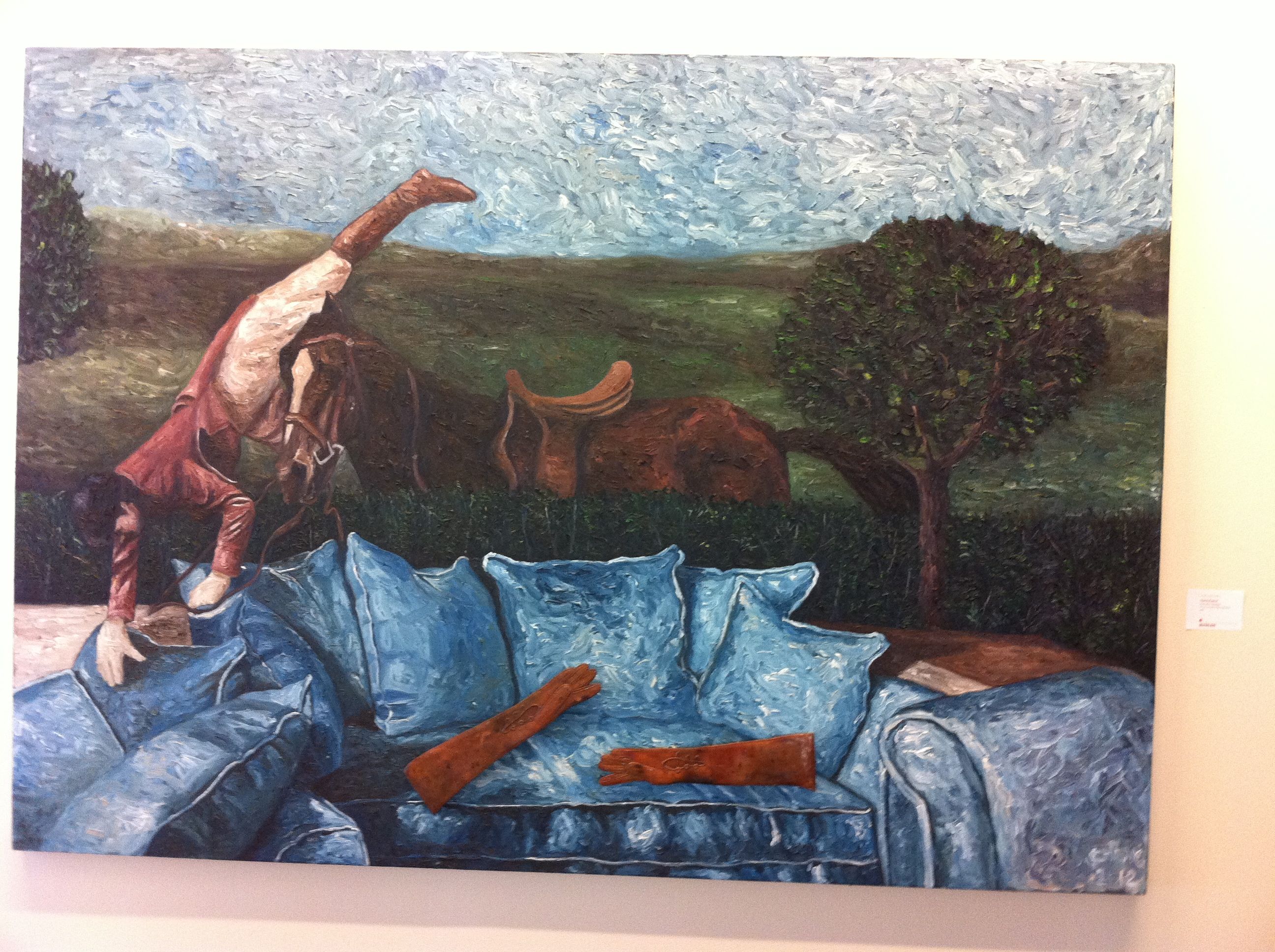 They hang side by side with Jonathan Ching’s paintings, thick dabs of paint depicting subjects also taken from familiar photographs. Jon incorporates commissioned copper objects to embellish his paintings. I remember when he first experimented with this device, some three years ago now. Here we experience it expanded, polished, and turned into his visual signature.