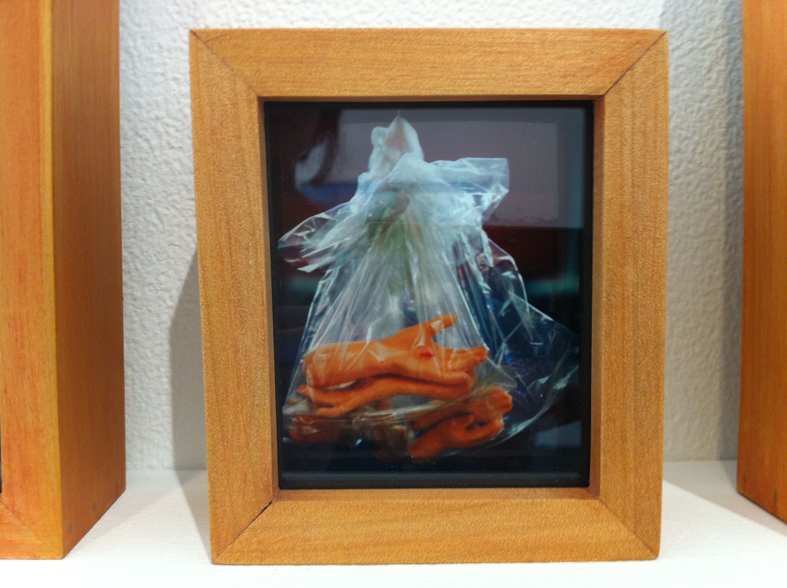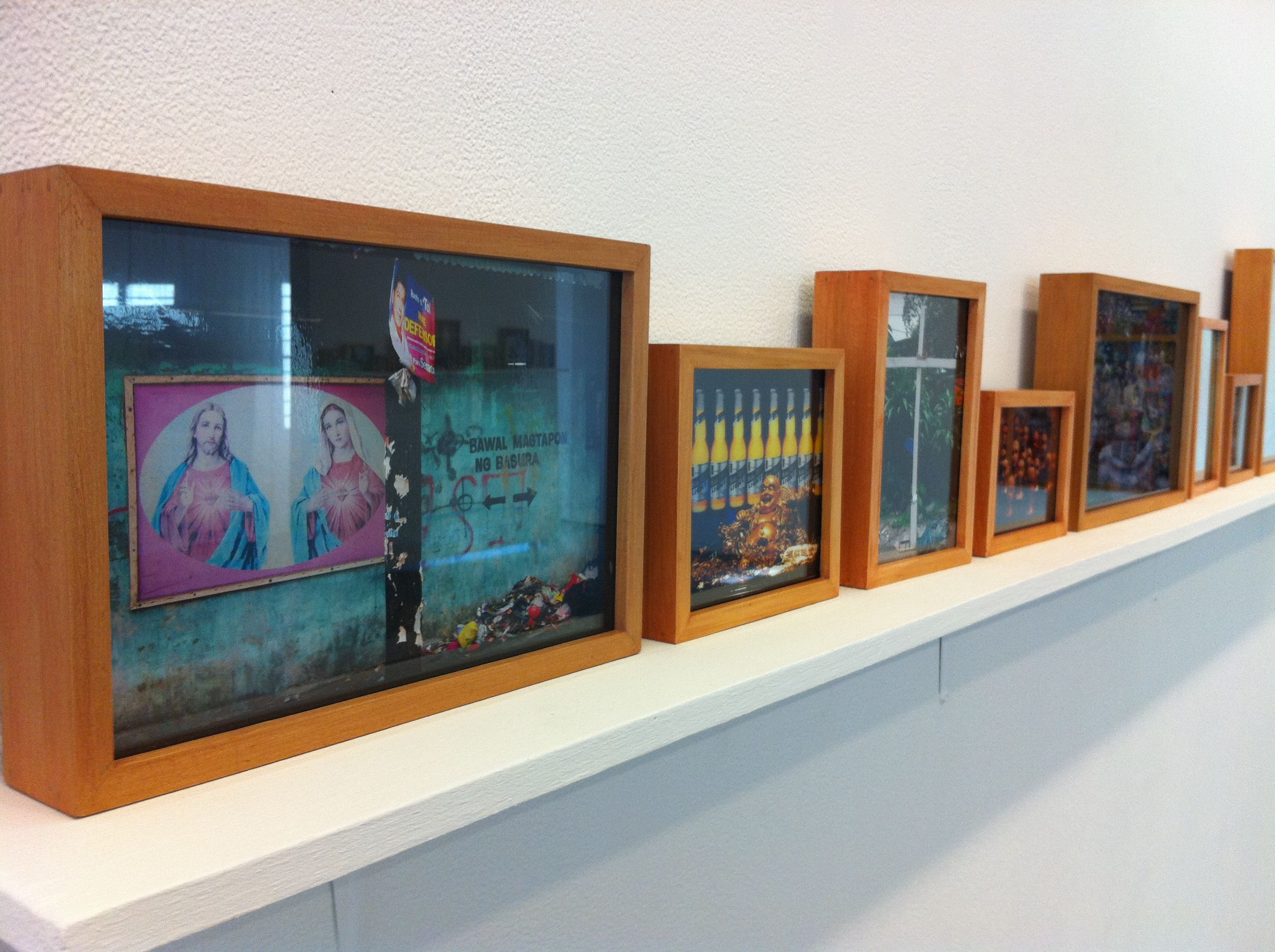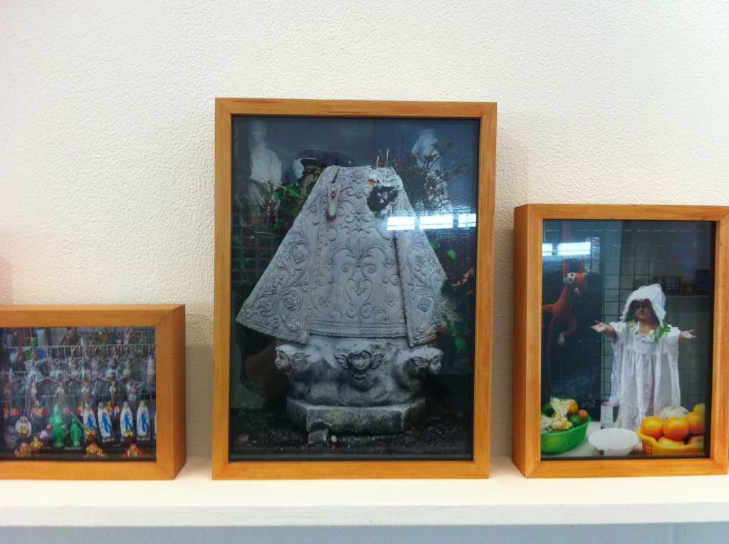 This familiarity with Manila likewise flavors her Inventory series, a group of photographs of knick-knacks for sale, trinkets amassed in colored plastic baskets that we first saw in her 2010 solo Waste Not Want Not at Finale Art Gallery. Beliefs I and II are two groups of ten framed photographs displayed on shelves. They showcase objects of faith, mostly Catholic symbols of which our city is rife, in not quite pristine conditions.