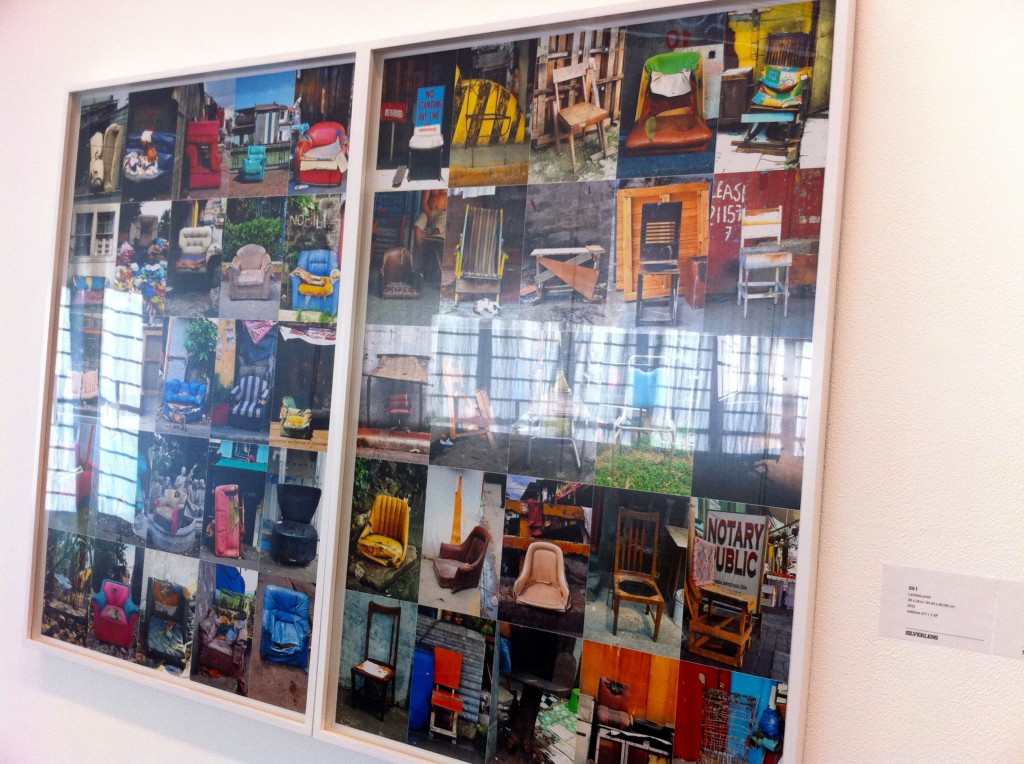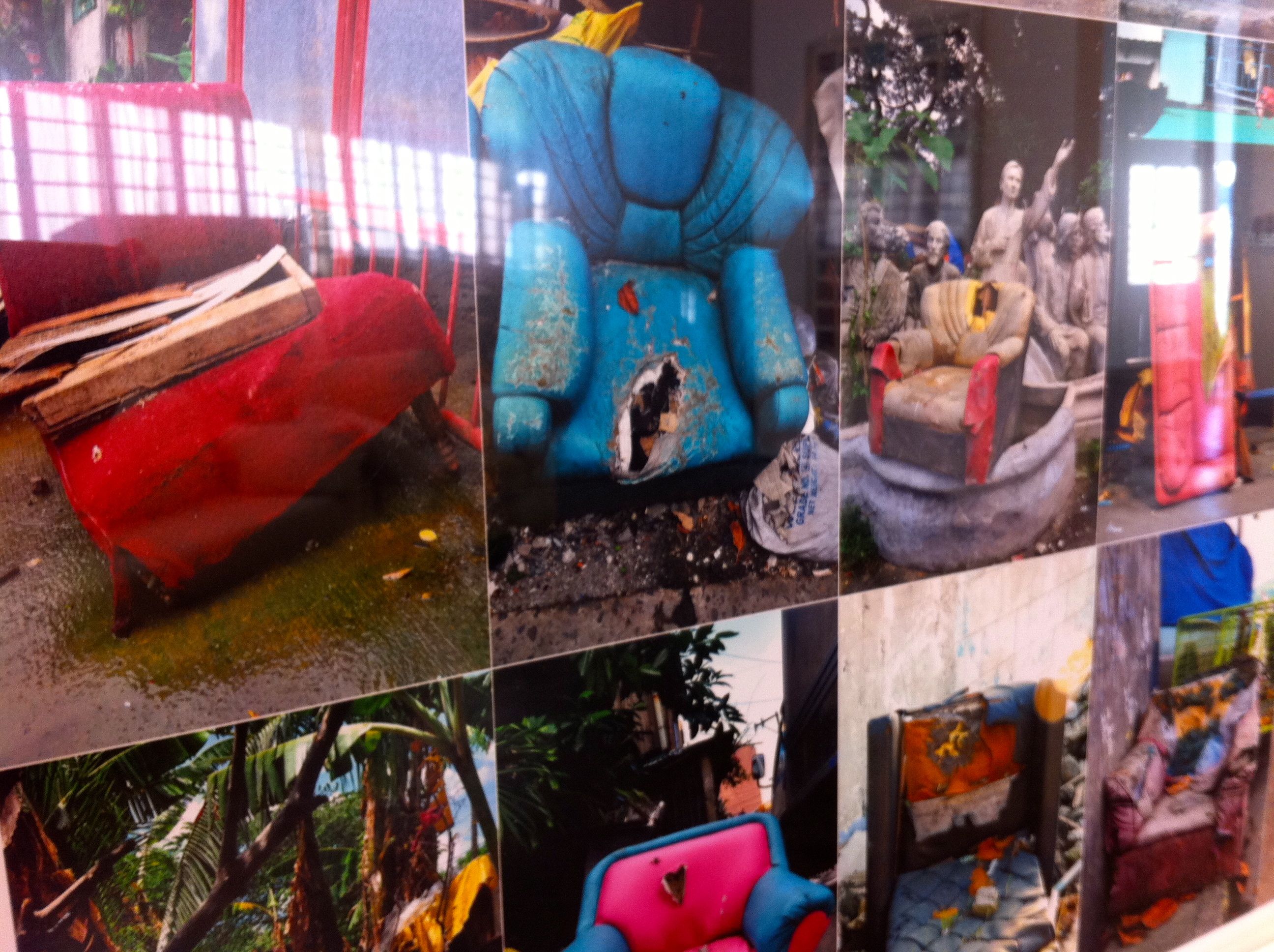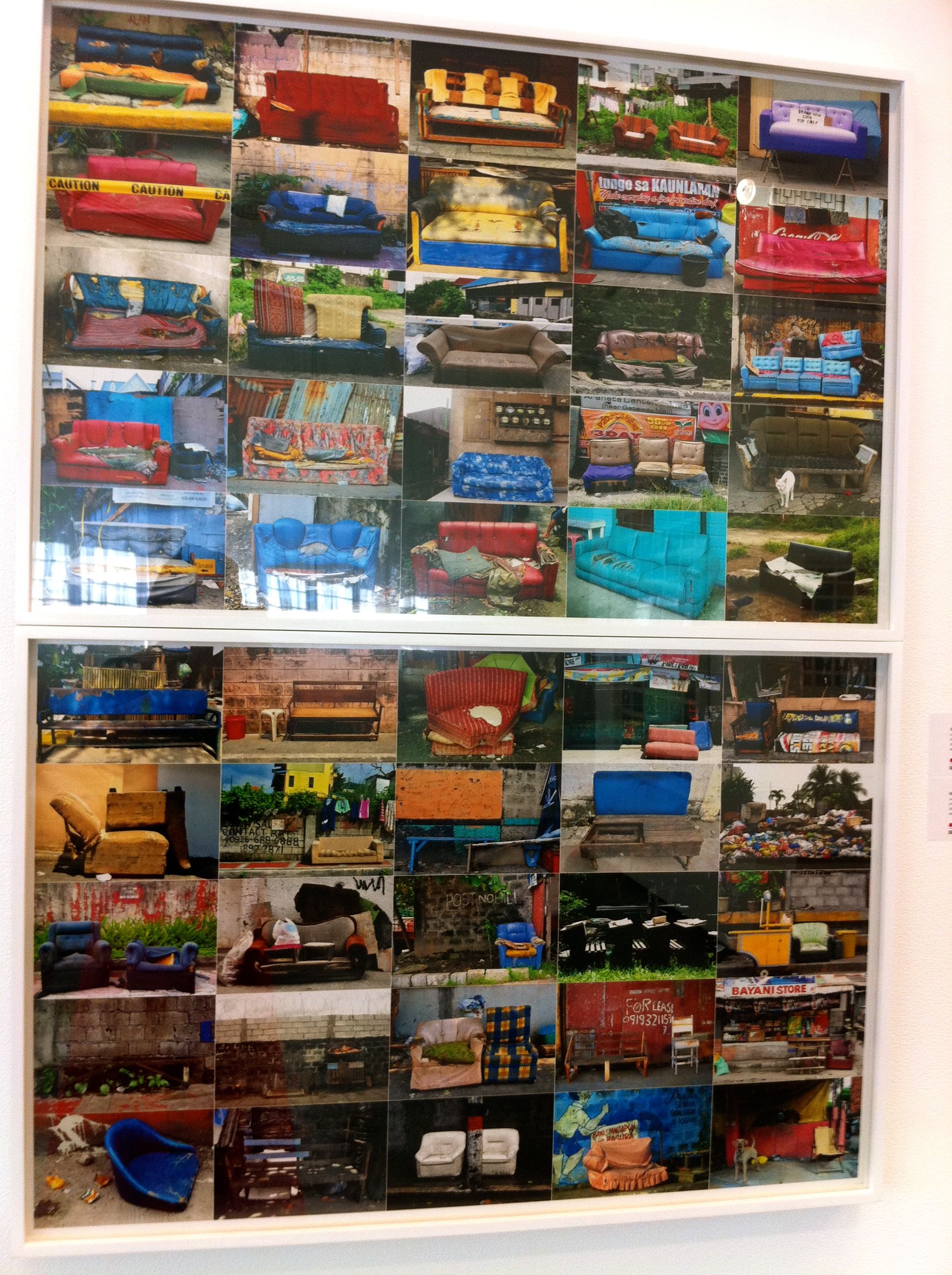 In this show, MM reconfigures colored photographs from a trove encompassing ten years of work. Among them, a wonderful series she calls Sit, a collection of photographs of used couches and armchairs. Abandoned on roadsides, or gouged with their springs exposed, some with their floral upholstery set against grimy concrete walls, or standing awkwardly on three wooden legs, MM’s chairs chronicle the seedy side of the city. Study the background detail of the images in Sit I and Sit II, and you realize that they could have only come from the environs of Metro Manila.