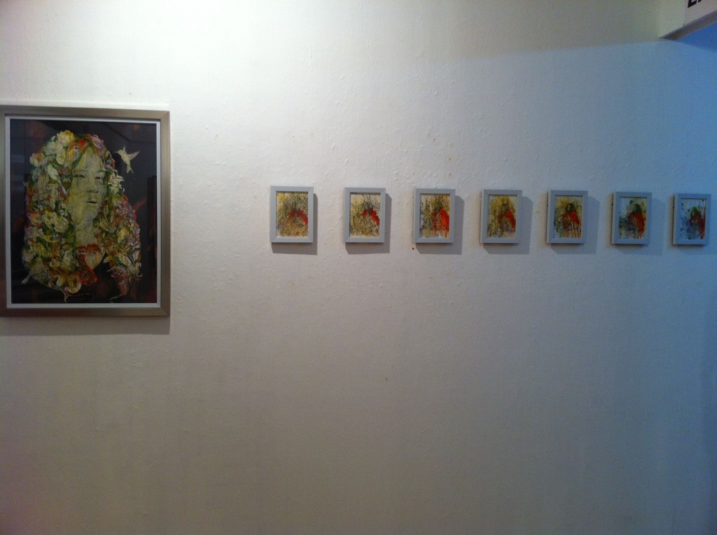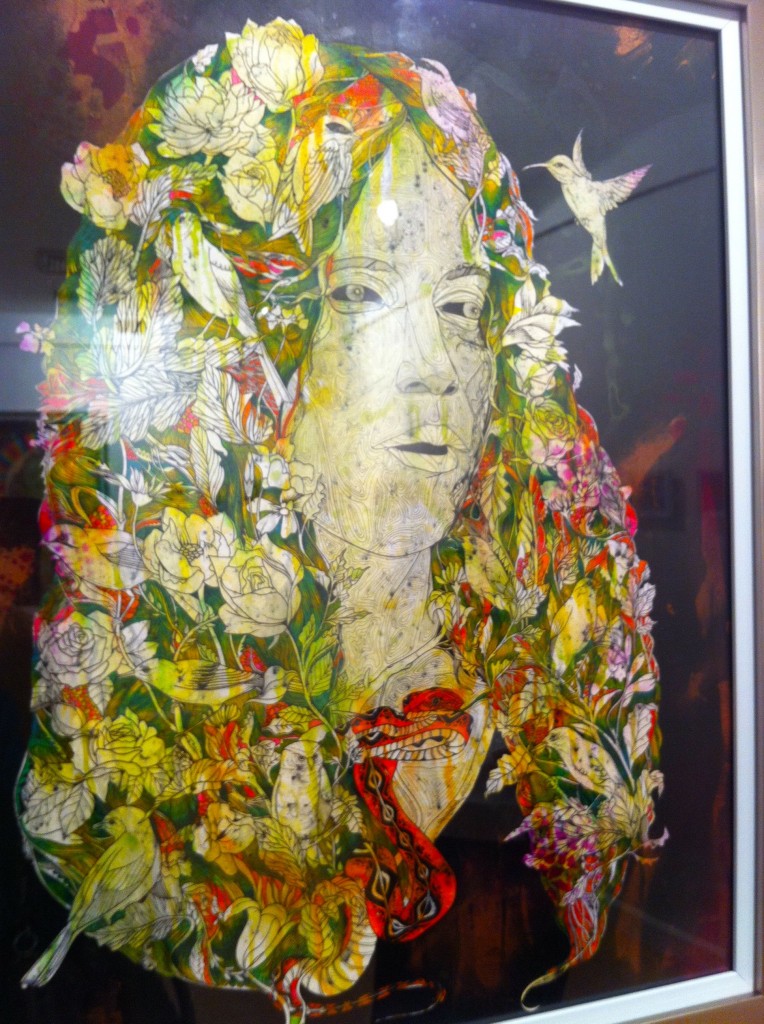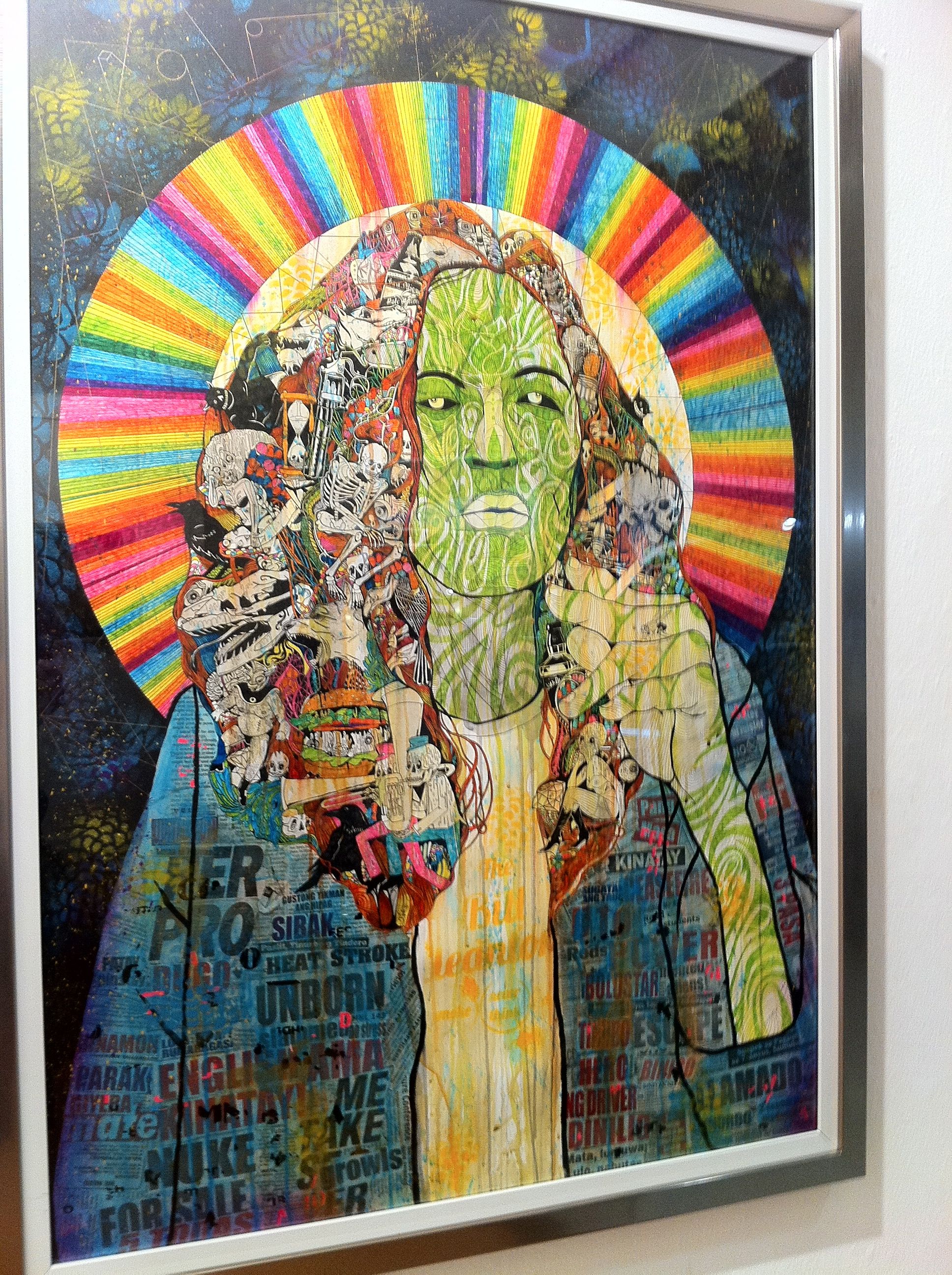 Homo Execessum (Man of Excess) hangs at the gallery’s extreme right. It is the exhibit’s largest piece, and also its best. Epjey has used ink, spray paint, acrylic, and collaged newspapers to depict the quintessential rock star. Allusions to earthly concerns— beer bottles, skulls, an occasional hourglass—are heaped together to form the rocker’s obligatory shoulder length mane, set off by a corona of rainbows. Epjey has piled on patterns and vivid colors to complete a really cool piece.