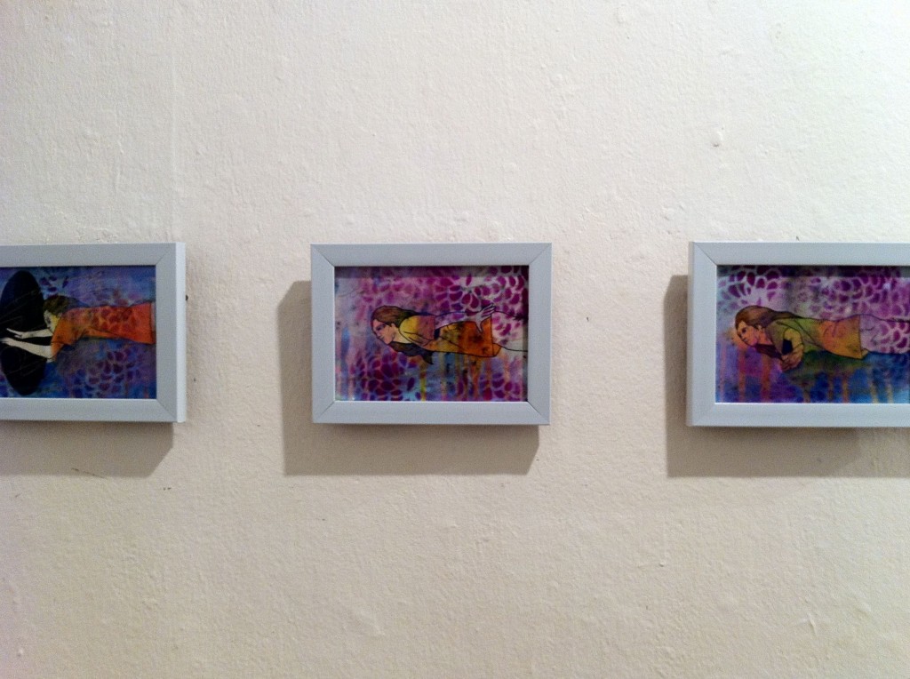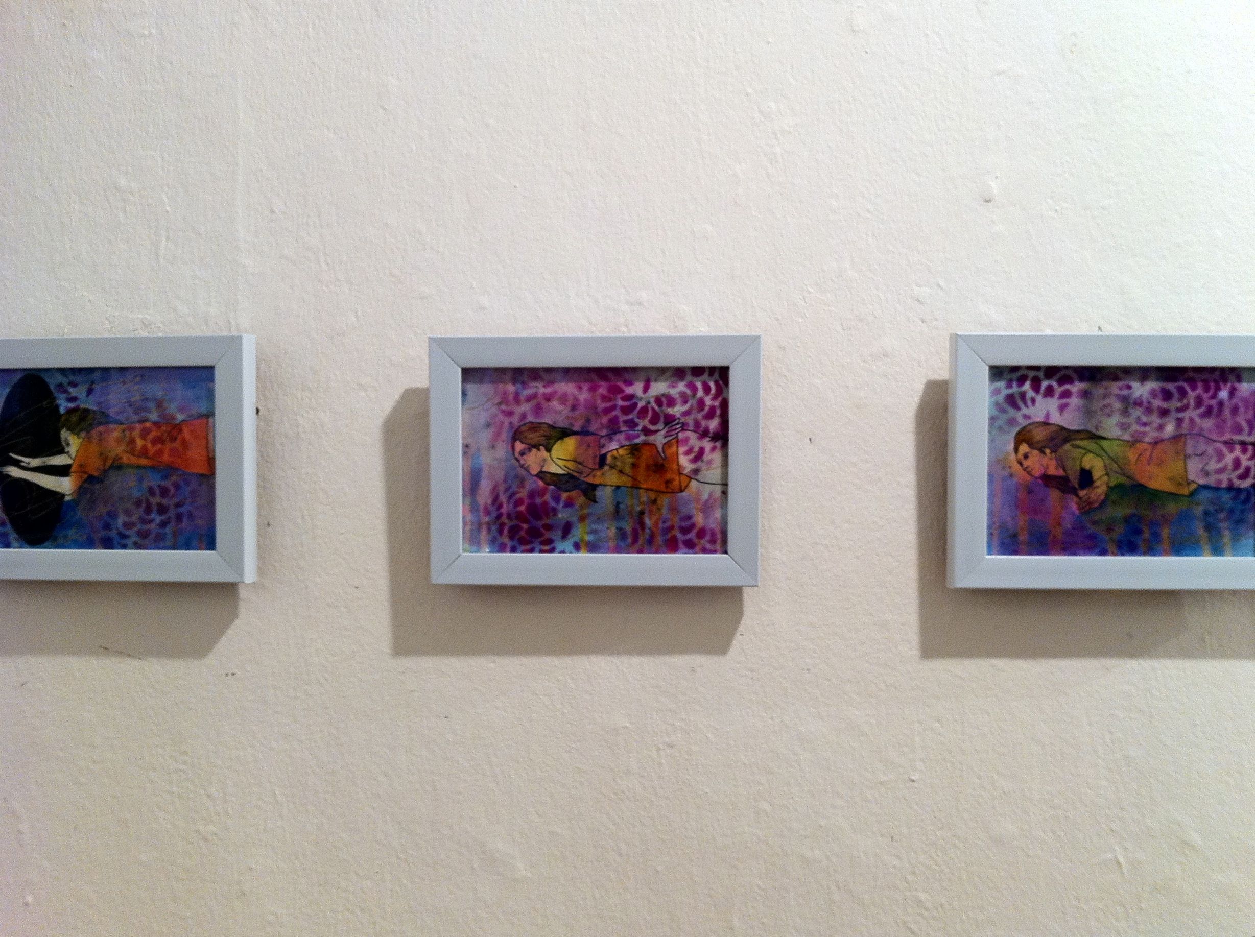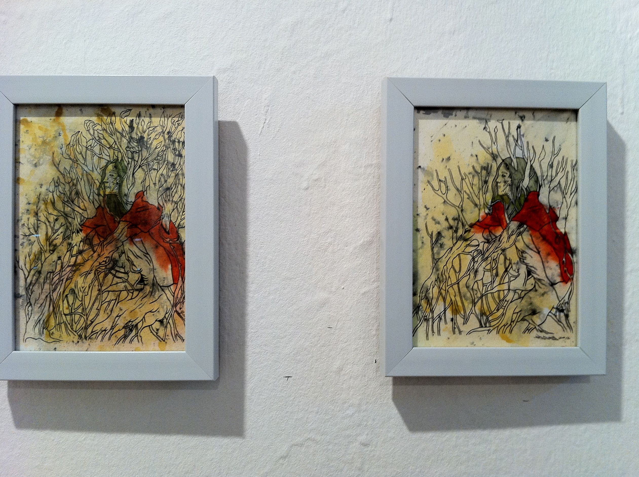 The thirty postcard-sized drawings that make up the Shift series bridge the wall space between the two larger pieces. They let us in on the man’s transformation. Each piece progresses from the one before it, like animation stills.