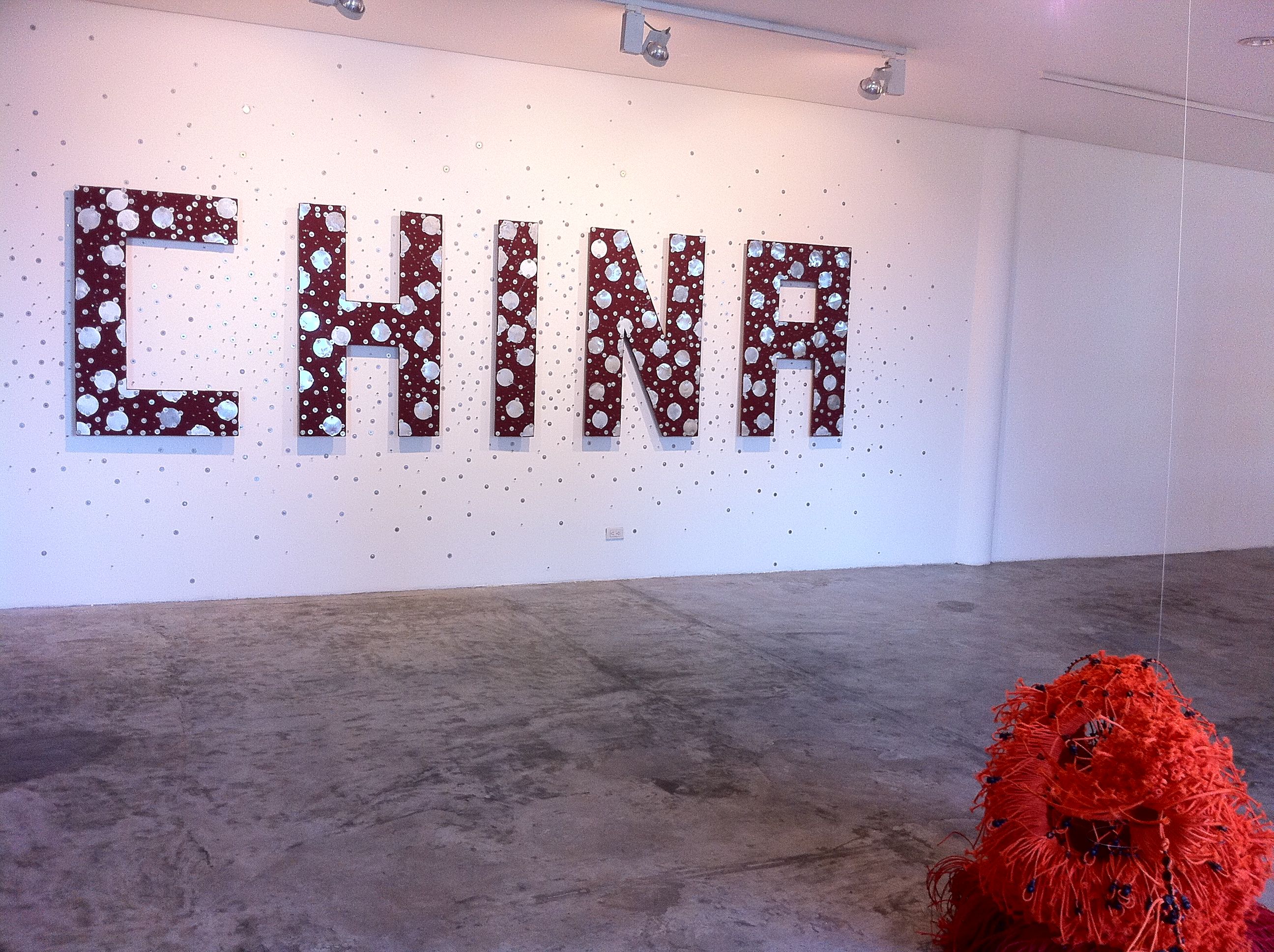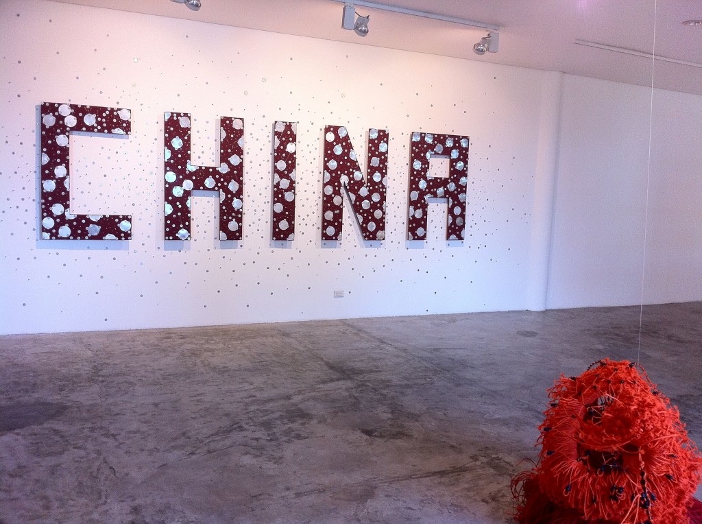 Mac Valdezco, as always, delivered a winner.  Her Orange 524.558 demonstrates yet again how ordinary materials come alive in her hands.  Cords and cord pulls, assembled with glue, come together as a climbing parasitic plant, easily the show’s standout.  Across it, up on the gallery’s long wall, the word CHINA has been spelled out in suede-covered letters embellished with chrome metal discs, screws, and washers.  Johnny Alcazaren calls this Protect Me From What I Want To Eat.  A dig at the suspect components that make it into food processed in China?