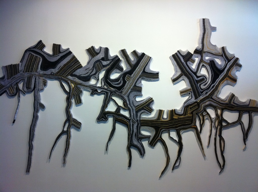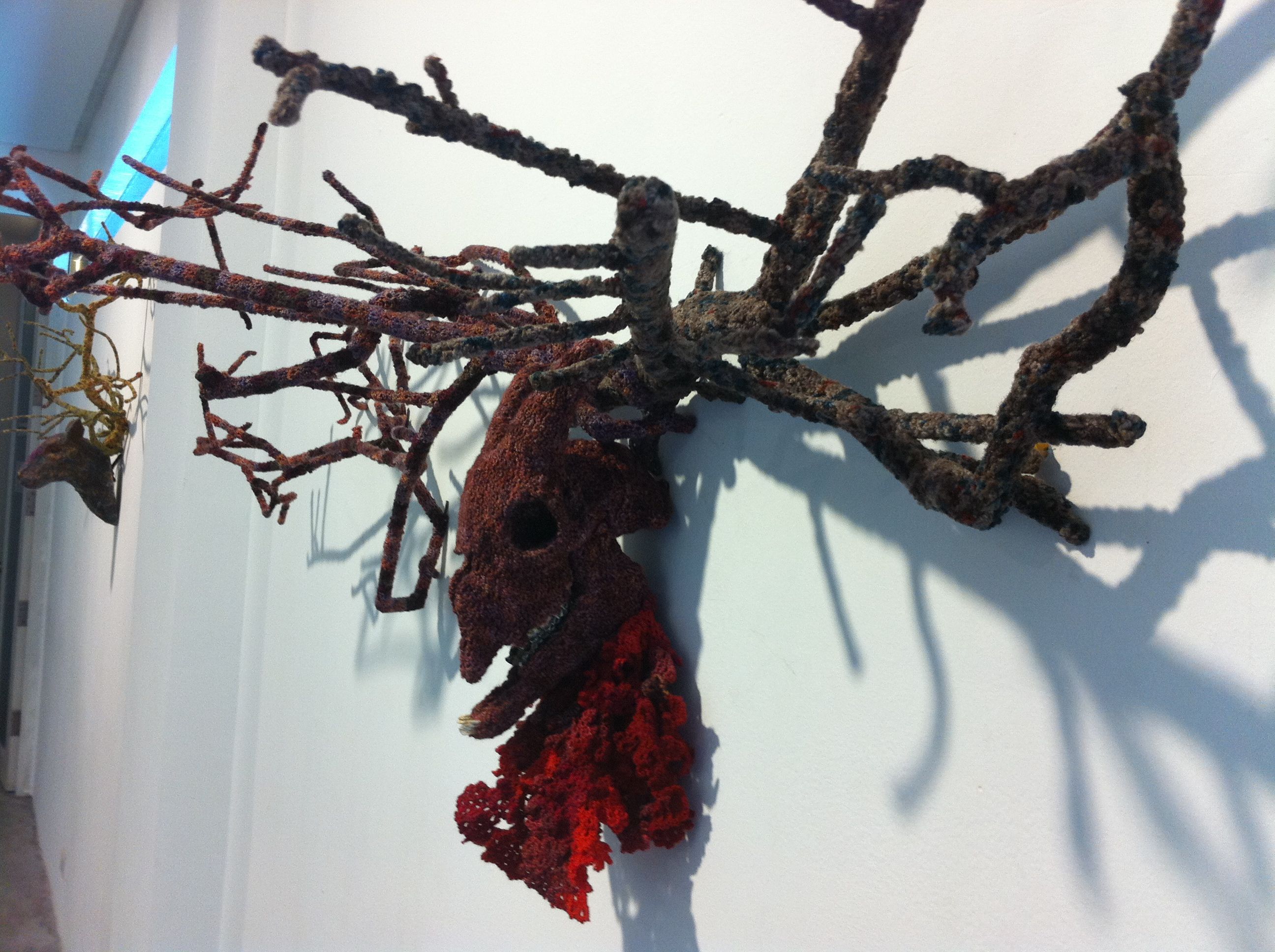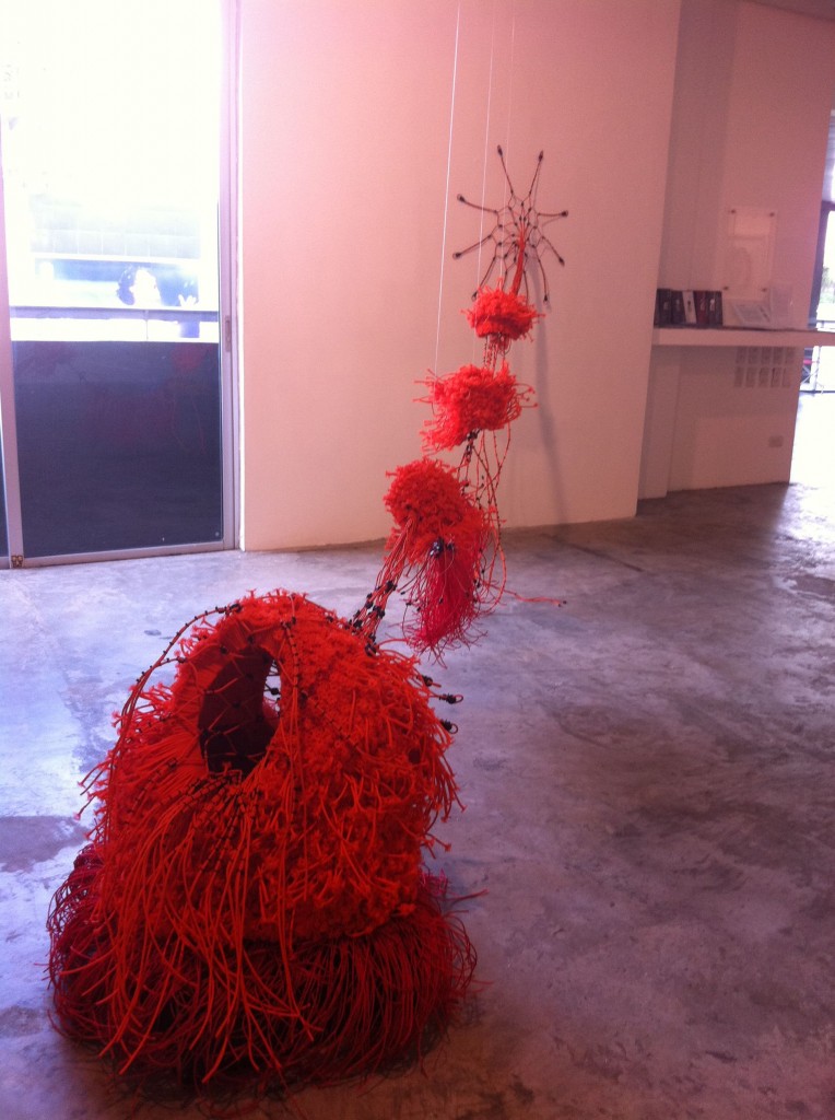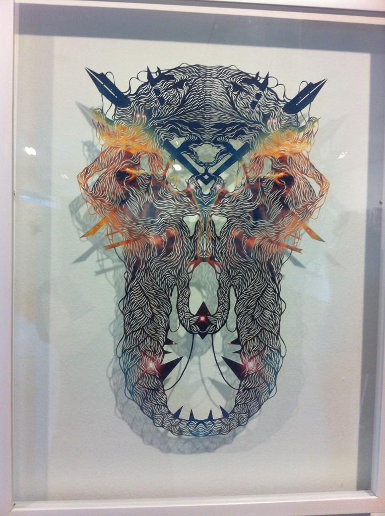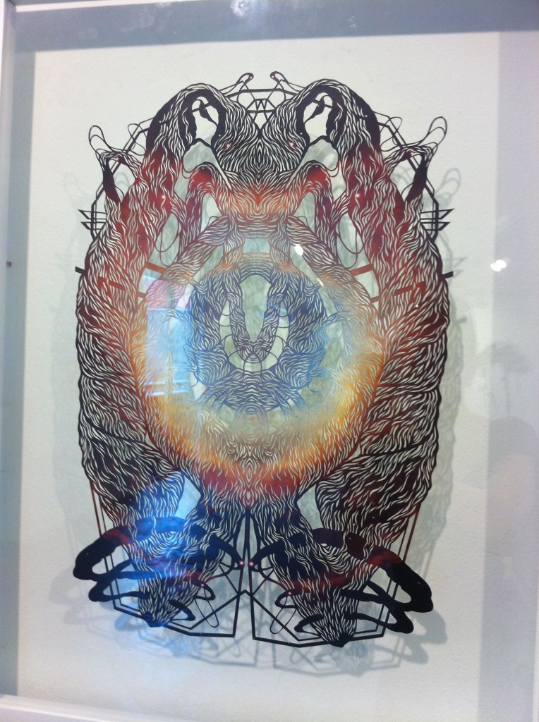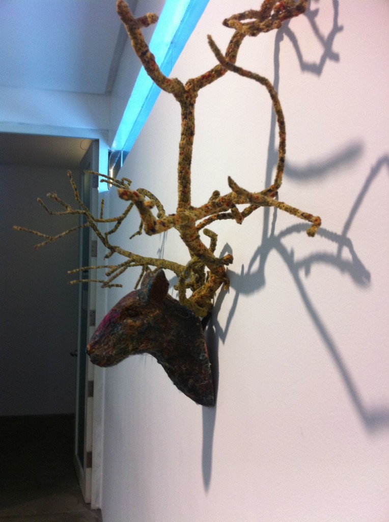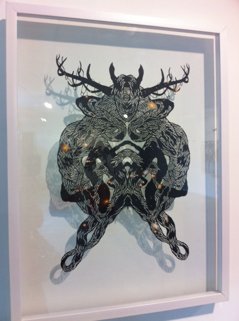 Eugene Jarque’s polymorph took over one wall, a pattern he put together from strips of Velcro. Geraldine covered animal skulls and elaborate branches in crocheted thread and tatting to illustrate Another Life Of A Tree 1 and 2.  The wall closest to the entrance has been devoted to Ryan Villamael’s Stellar, framed paper pieces sourced from magazine photos of the solar system, cut by hand into intricate filigreed forms.  Beside them, his Big Bang, from layers of cut felt, dominated and dwarfed the four Stellar pieces.