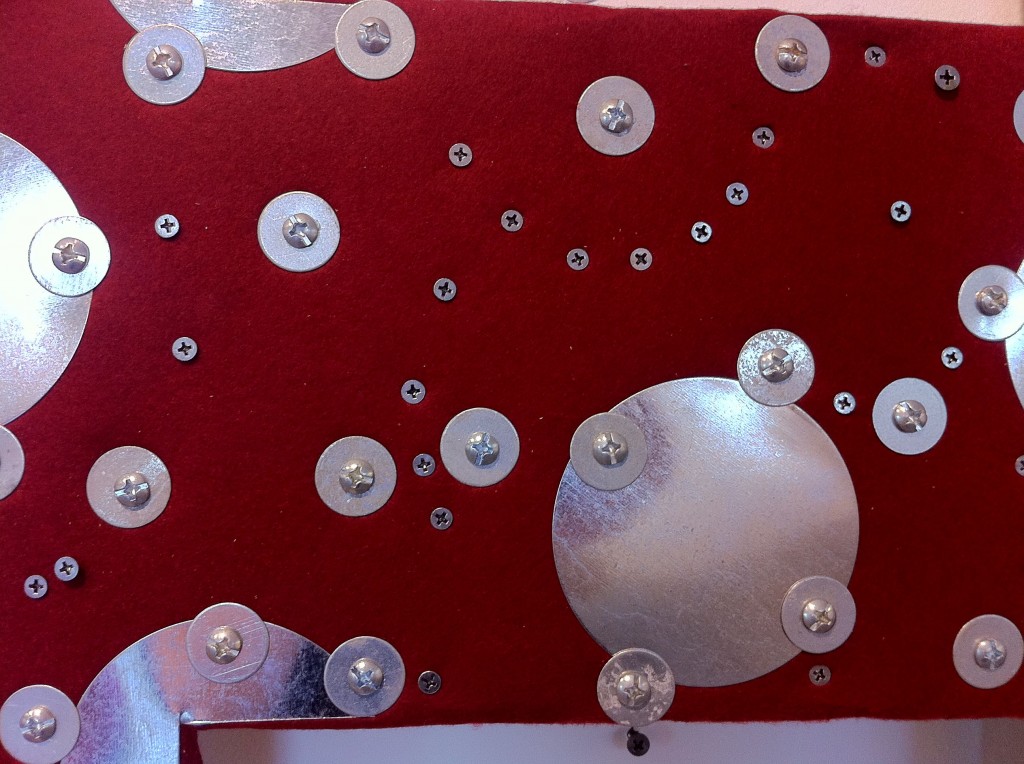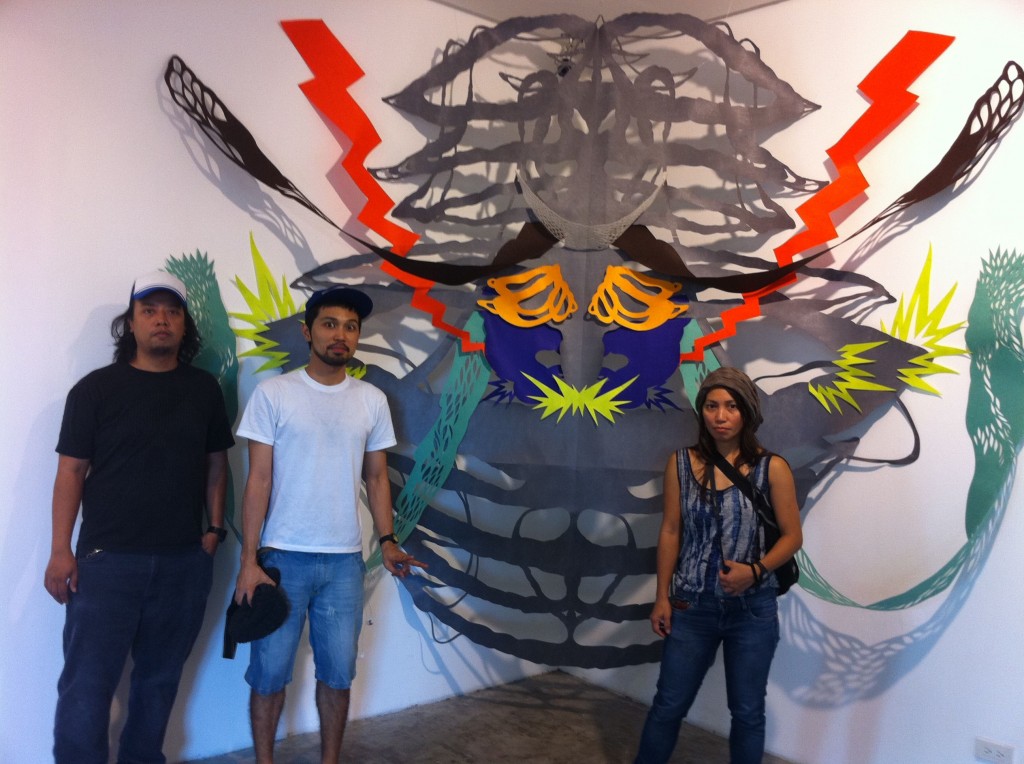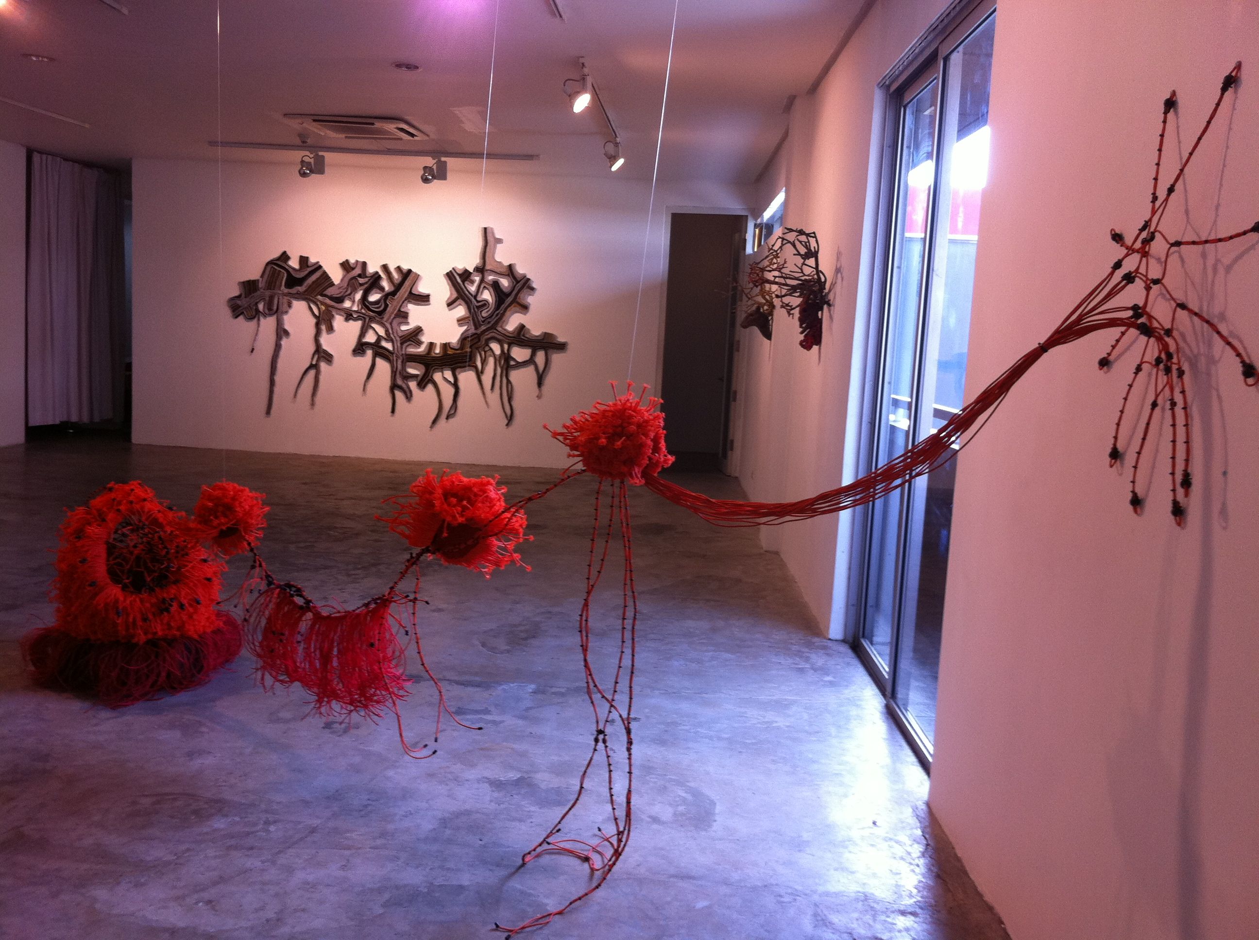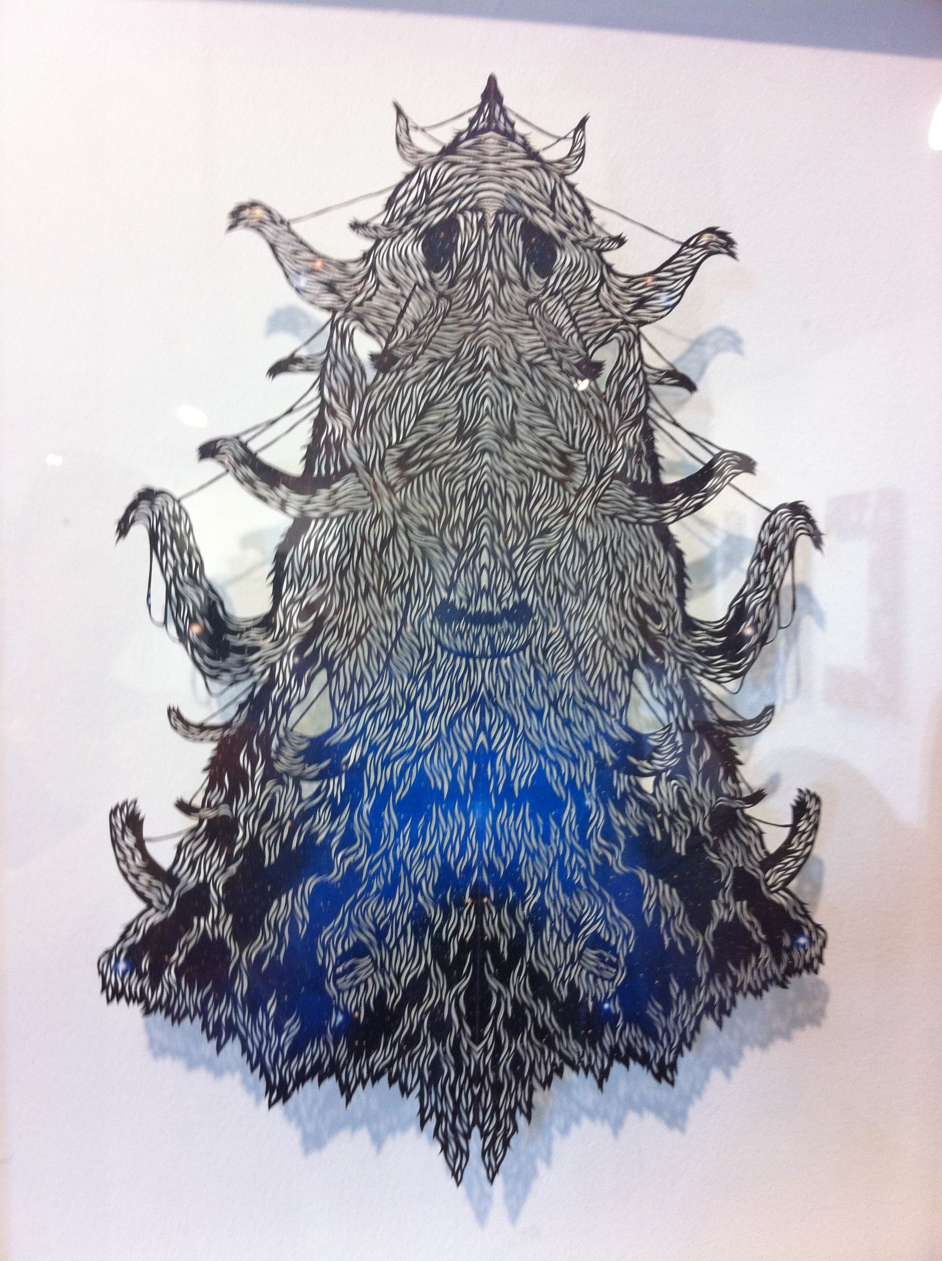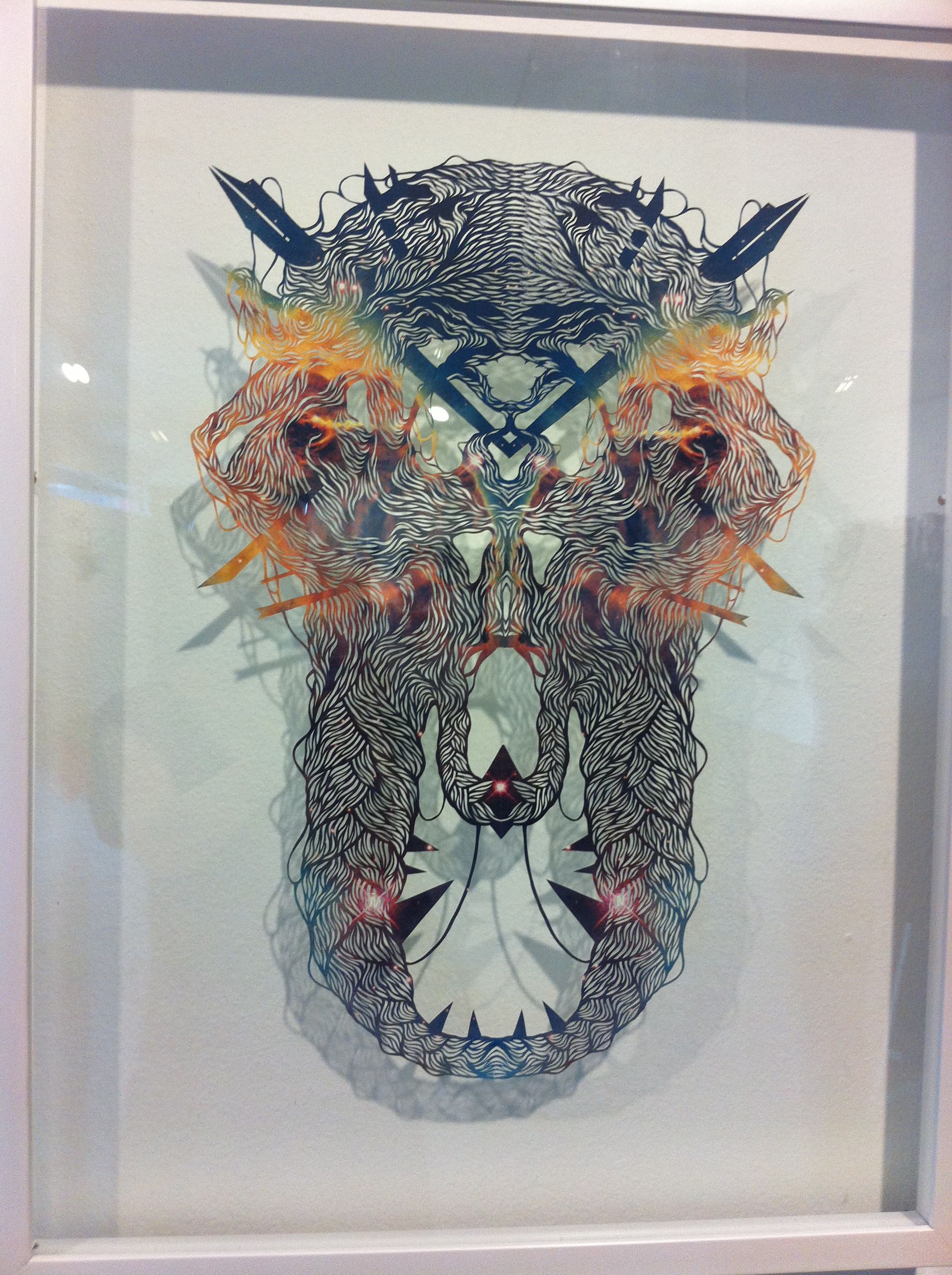 Eugene Jarque’s polymorph took over one wall, a pattern he put together from strips of Velcro. Geraldine covered animal skulls and elaborate branches in crocheted thread and tatting to illustrate Another Life Of A Tree 1 and 2.  The wall closest to the entrance has been devoted to Ryan Villamael’s Stellar, framed paper pieces sourced from magazine photos of the solar system, cut by hand into intricate filigreed forms.  Beside them, his Big Bang, from layers of cut felt, dominated and dwarfed the four Stellar pieces.