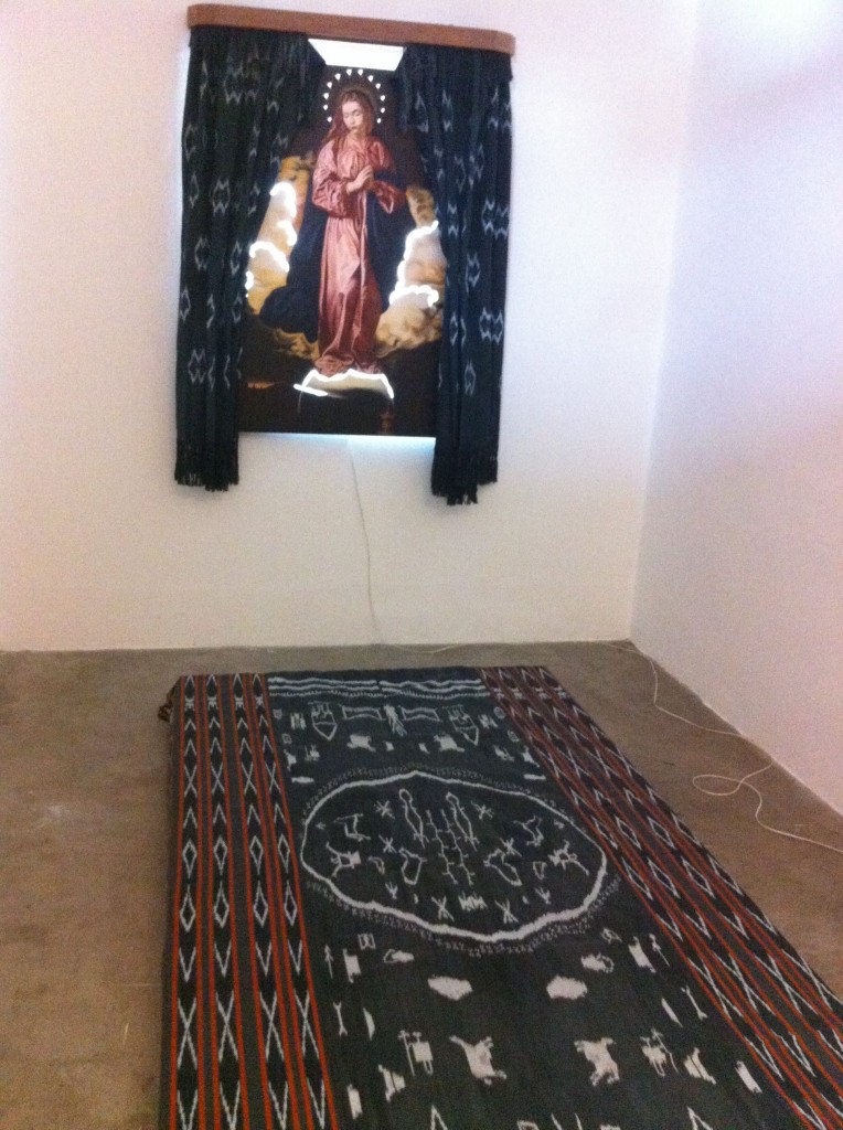 Mike Muñoz occupied MO’s Project Room with an altar of sorts. All his recent paintings have been reworked religious images.  Tota Pulchra Es Maria combines an appropriated one of Mary with cloth woven from the Cordilleras. The bolt of fabric, handwoven and hand dyed, is a celebration of a skill proudly passed down through generations.