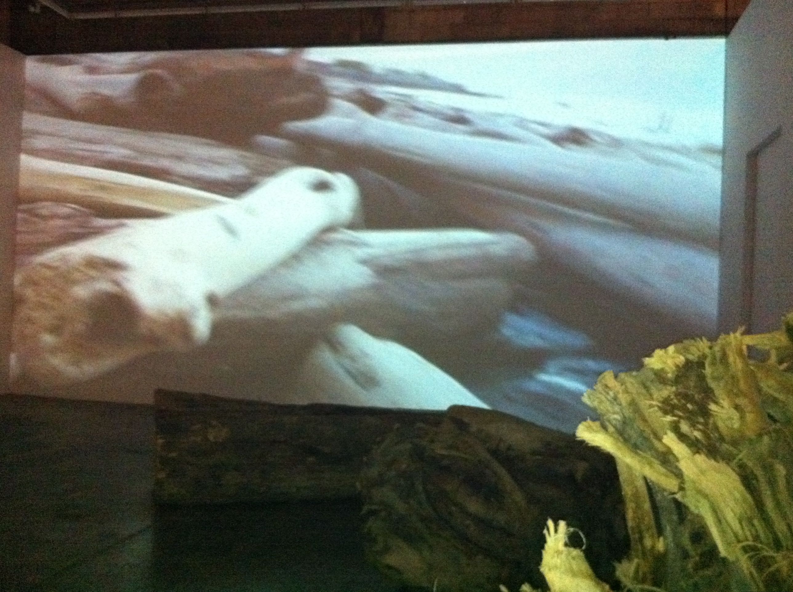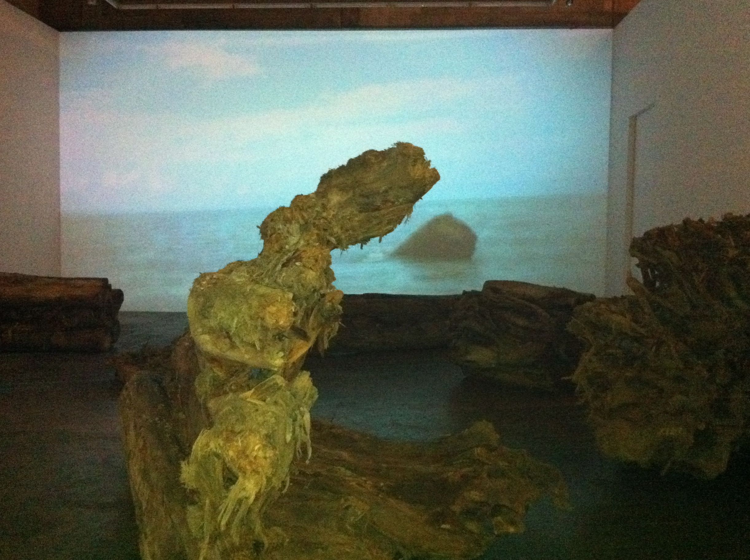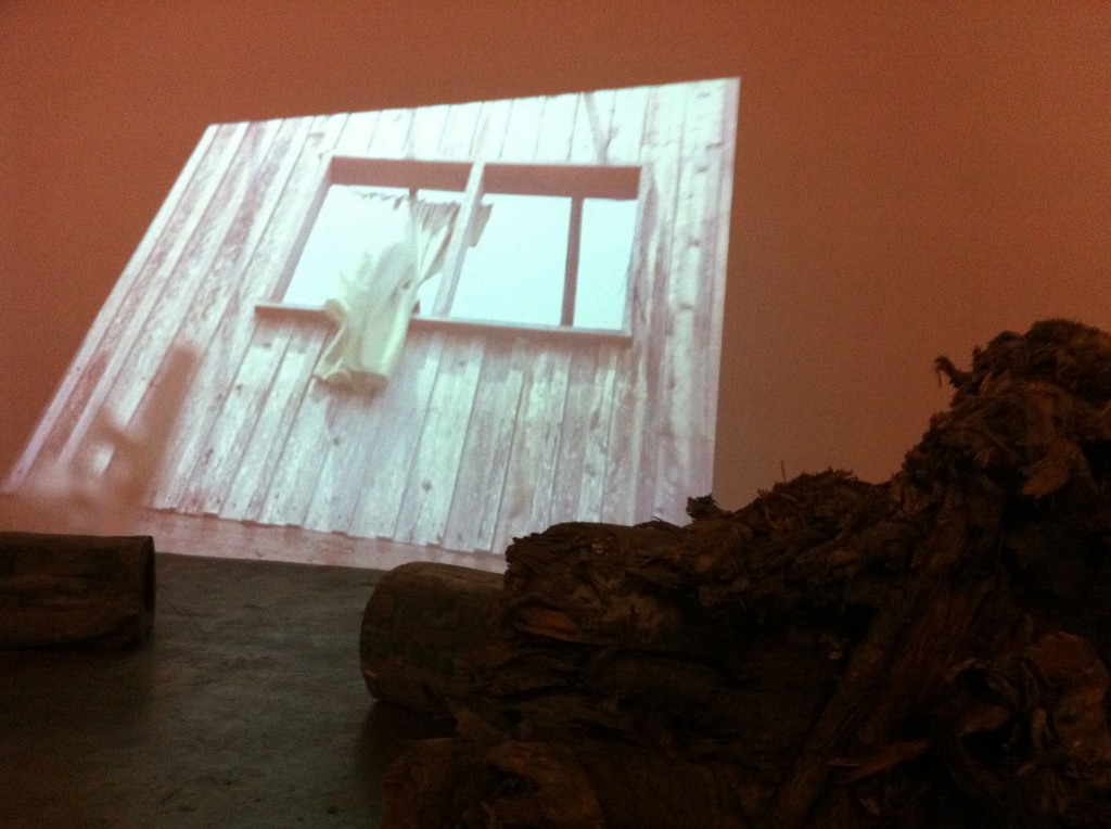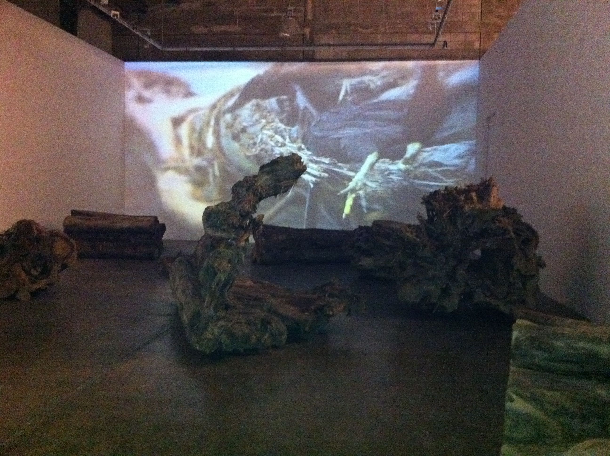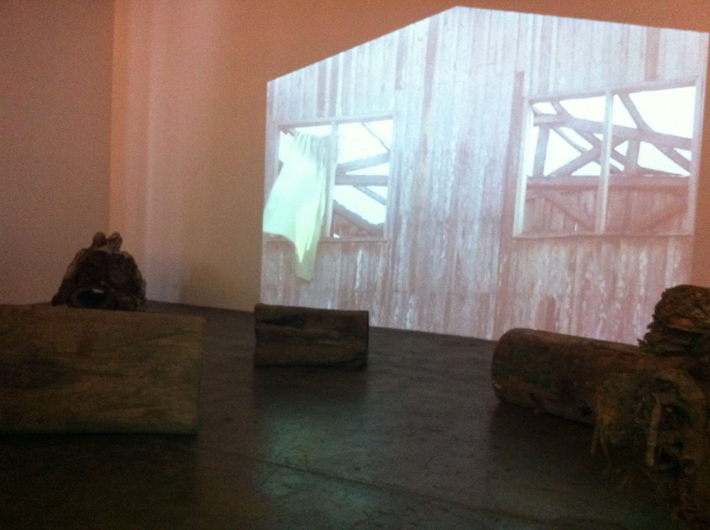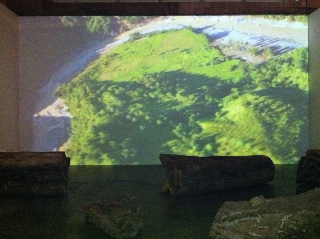 Finale’s cavernous Tall Gallery serves as the setting for Kiri’s two videos, projected the same height as the space’s walls. She scattered sections of felled trees transported from Iligan on the gallery’s floor area, providing perspective on the strength of the water that carried them away. I happened to view the exhibit alone, in almost total darkness (it would’ve perhaps been better if the light from the exhibit upstairs could have been blocked off completely), sitting on one of the massive trunks, taking in the larger than life images.