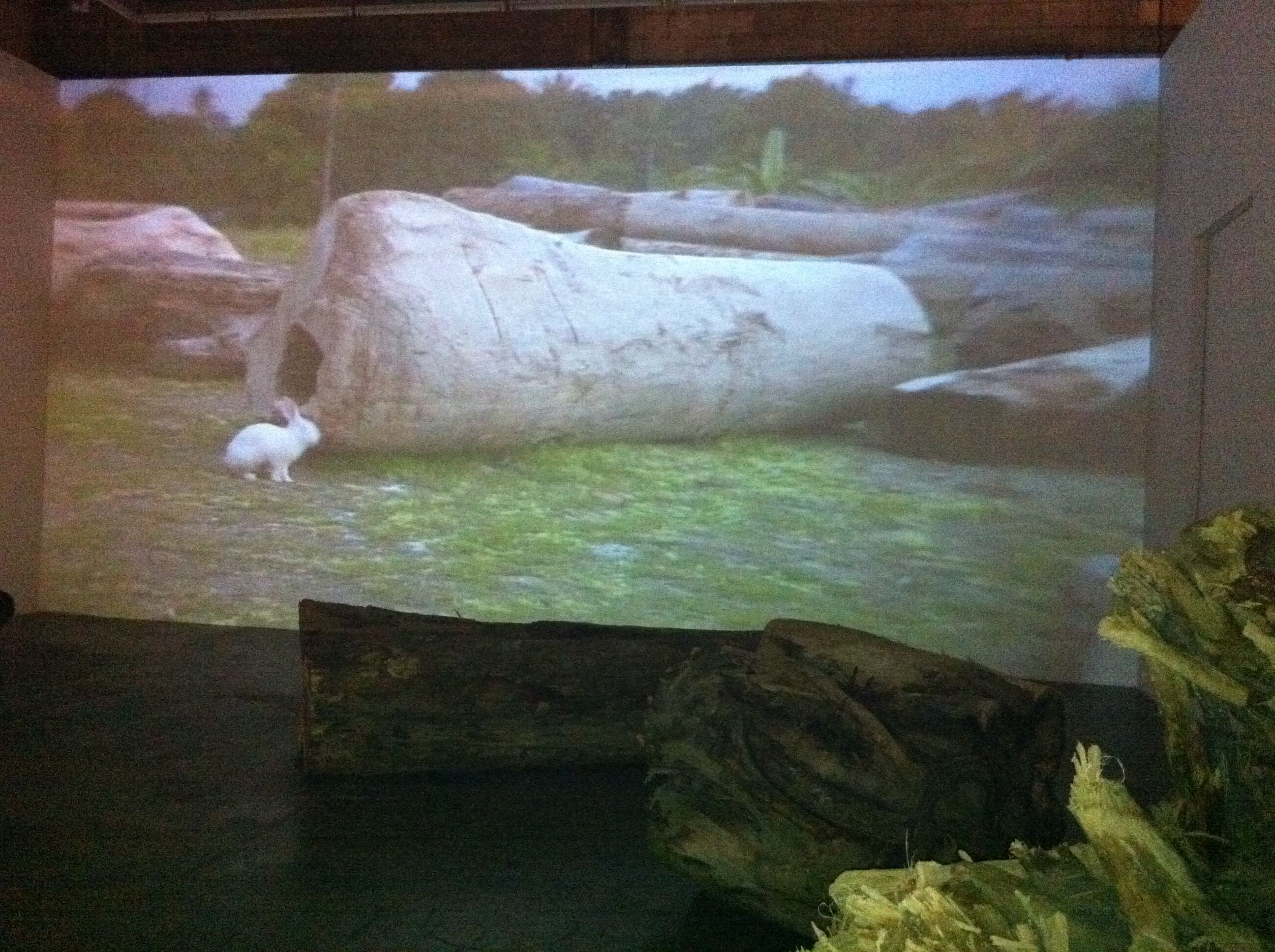 Kiri’s installation succeeds in immersing her viewers. You bob along with the log floating on waters that have calmed, watch as it is taken ashore, and understand the scale of devastation when you see it as just one of an immense pile of equally gargantuan trees that have also fallen from the typhoon. The sound of the flowing river and the waves lapping the shore of the bay accompany Kiri’s quiet but piercing reminders of the catastrophe: a dead bird entangled in a tree’s roots, an aerial view of muddy banks, an untethered goat, followed by a lone white rabbit, wandering amidst the heap of logs.