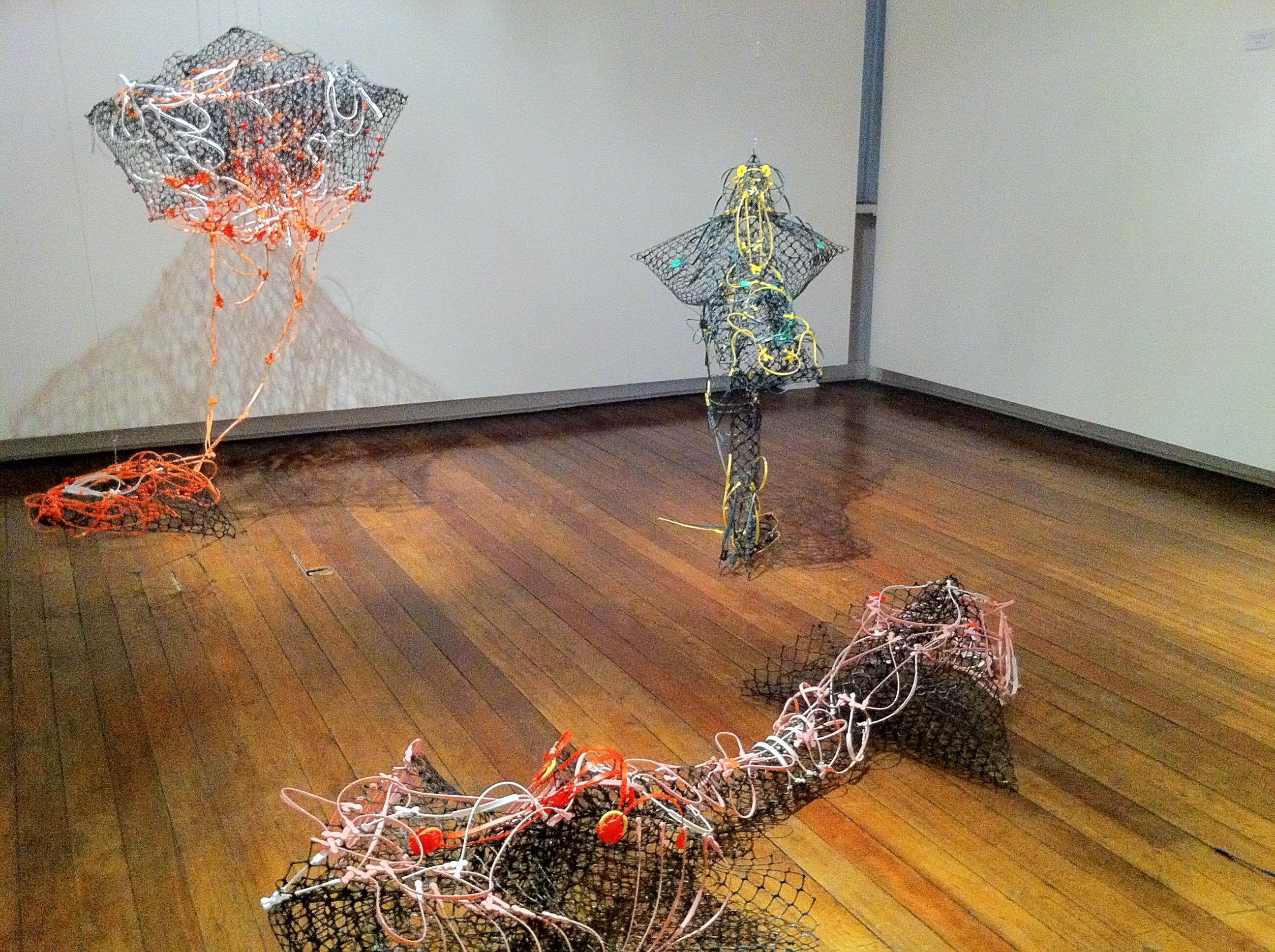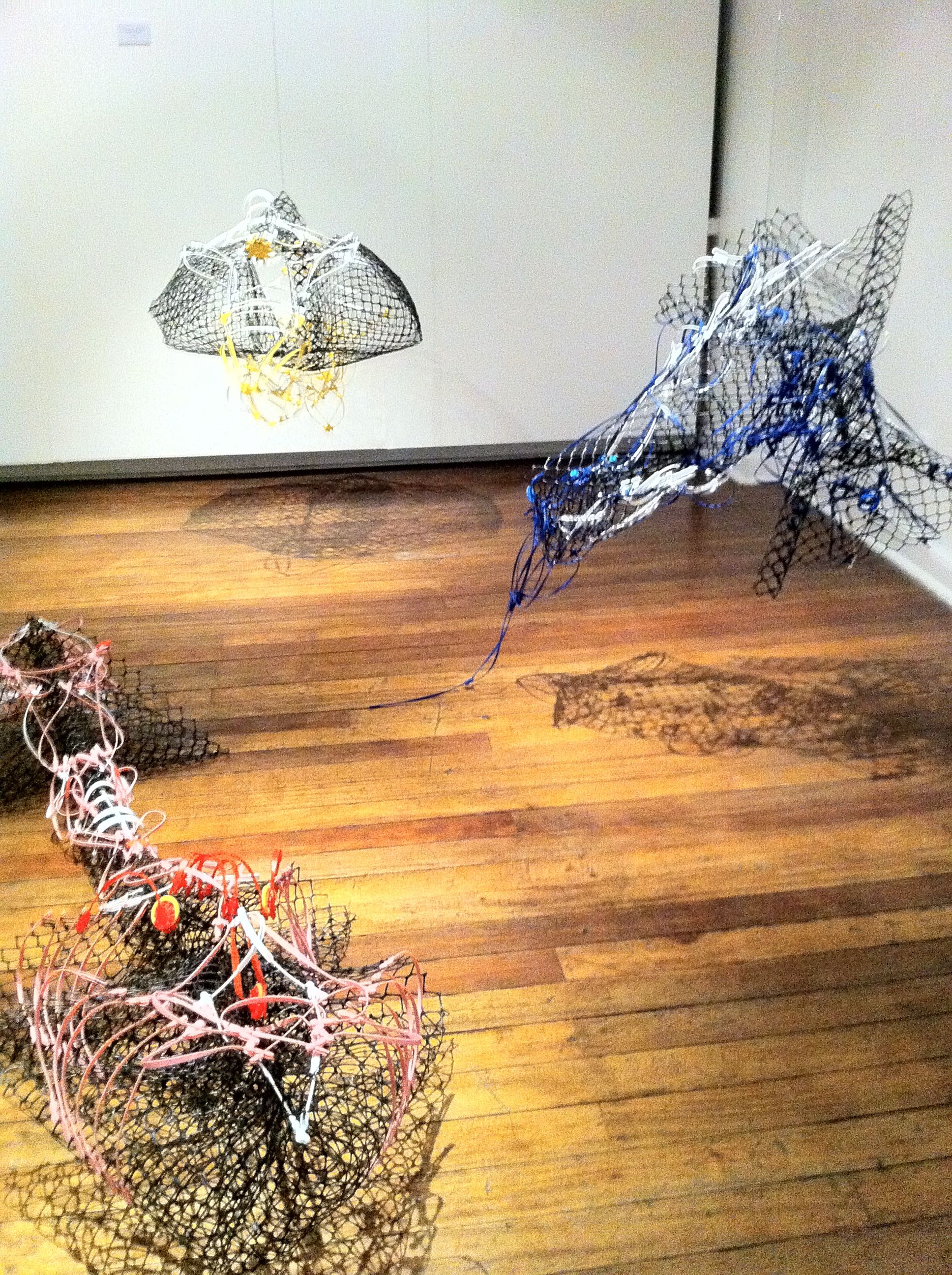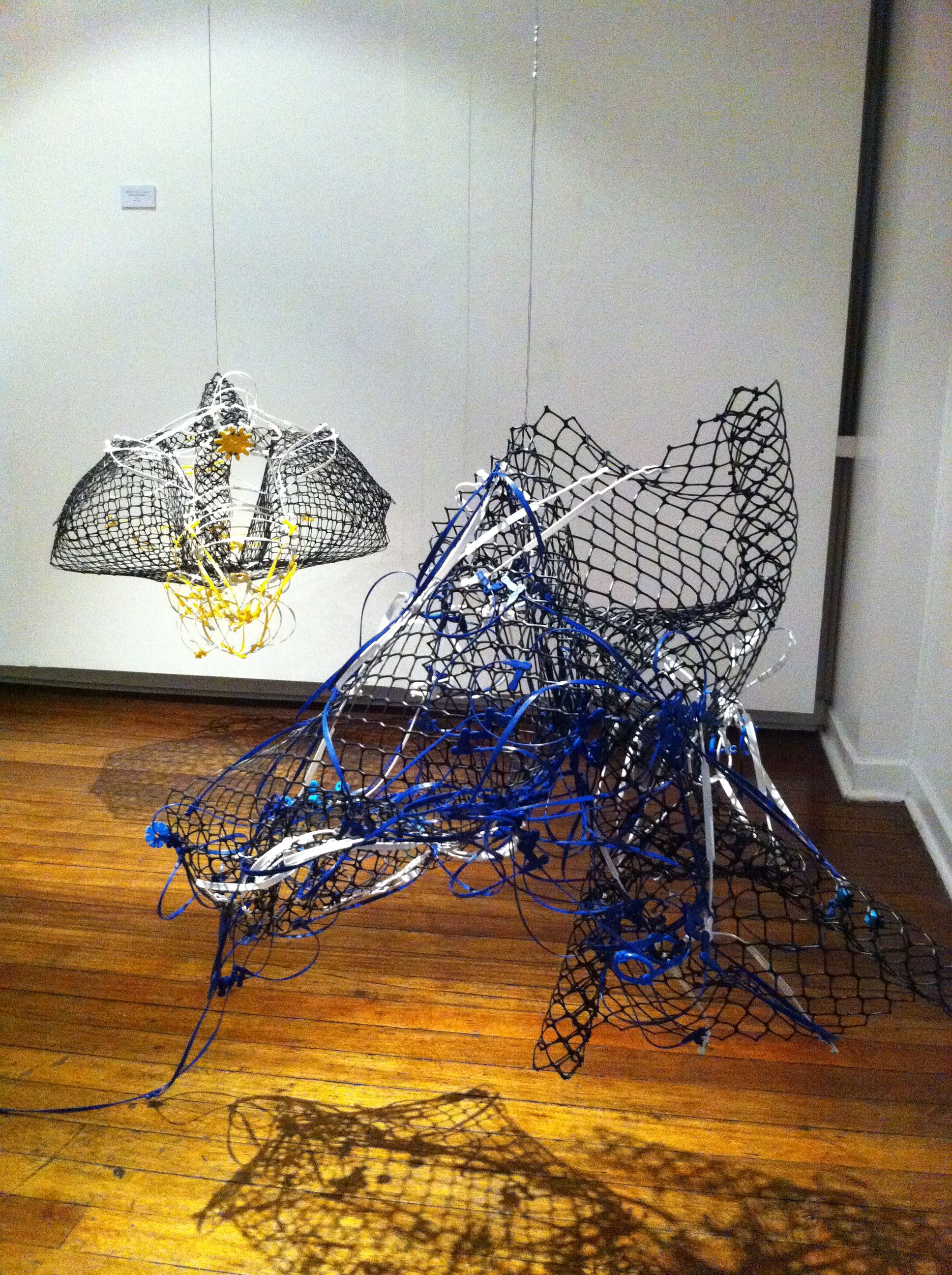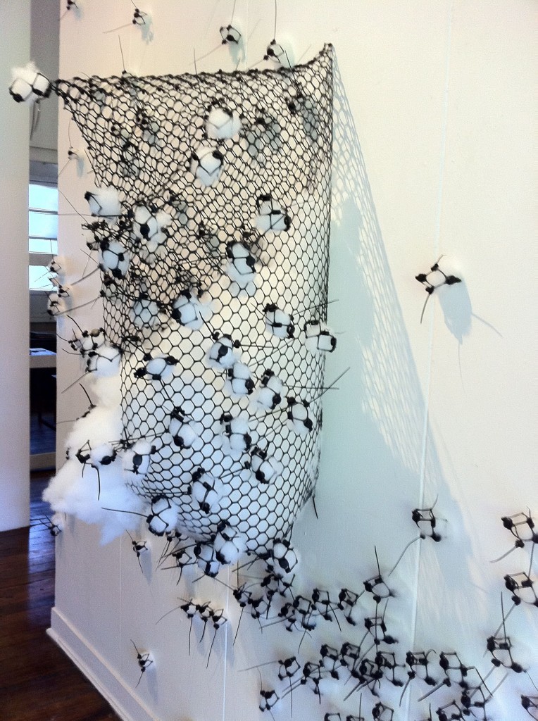 Mac let even more of her imagination loose in the gallery’s second floor. She turned black jacket stoppers and more fiberfill into an infestation of cloud gatherers: a wall of crawling insects that hoard fluffy particles into an open bag. Colored bag handles have been entwined with rolls of black plastic net for Blast Em and the Strange Passenger series, her version of space vehicles, one mother ship from which several auxiliary vehicles bay.
