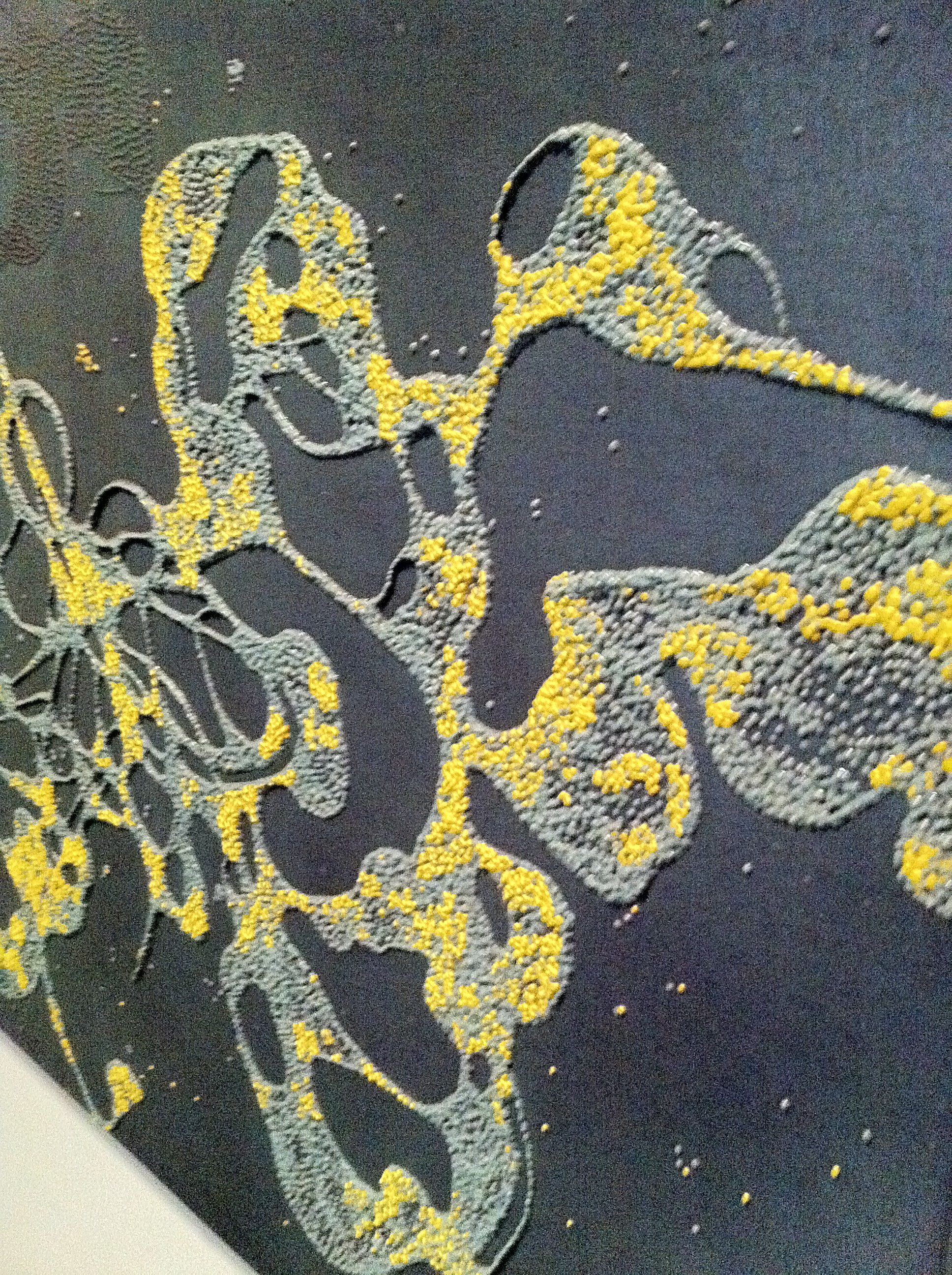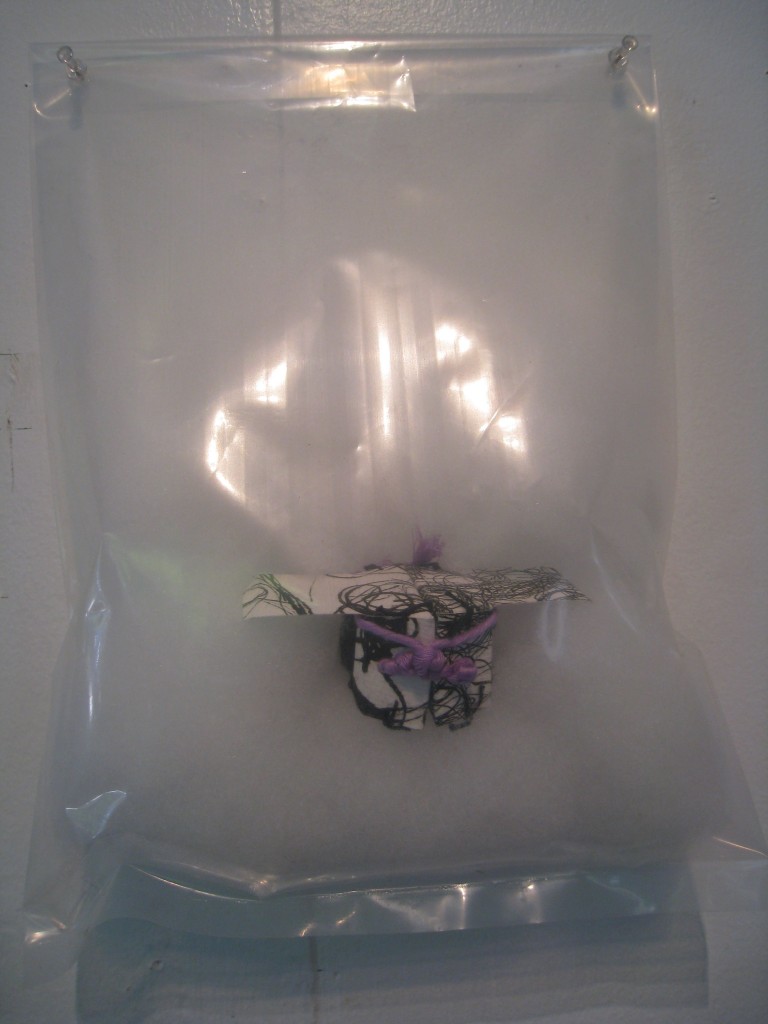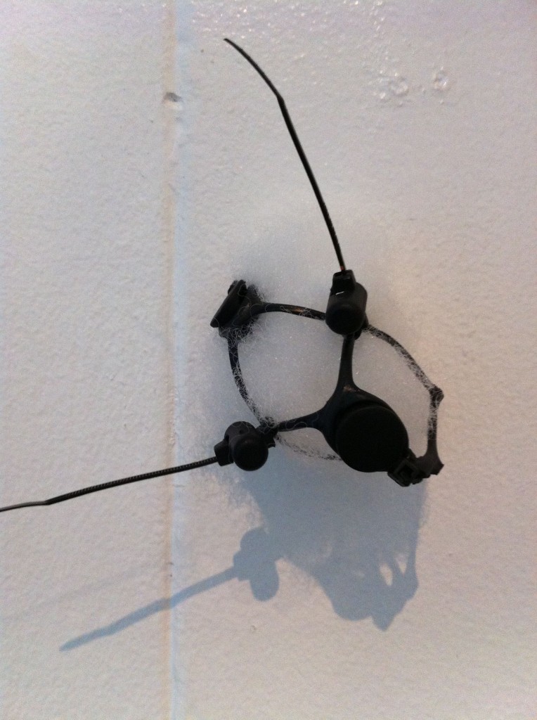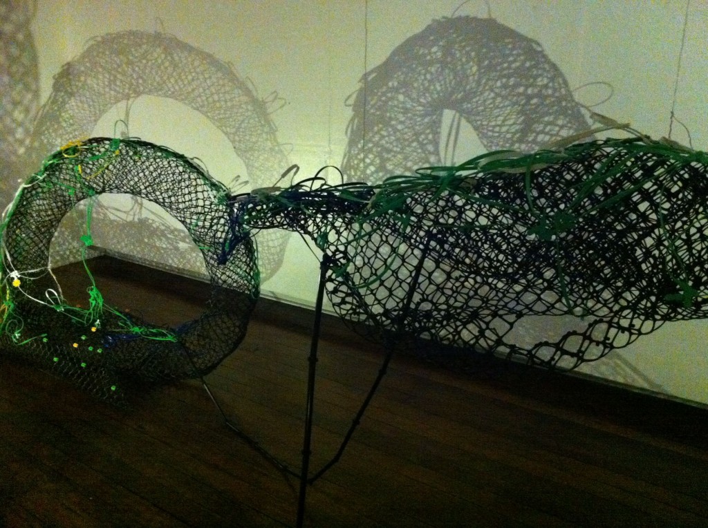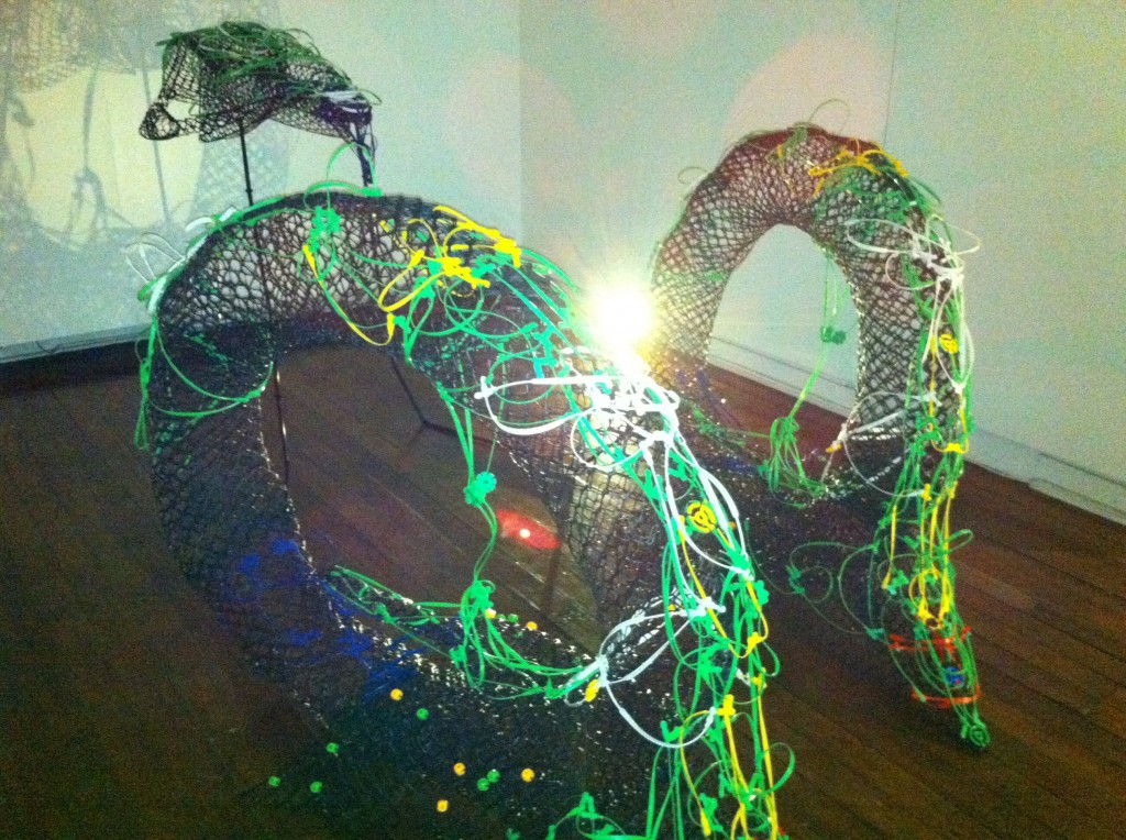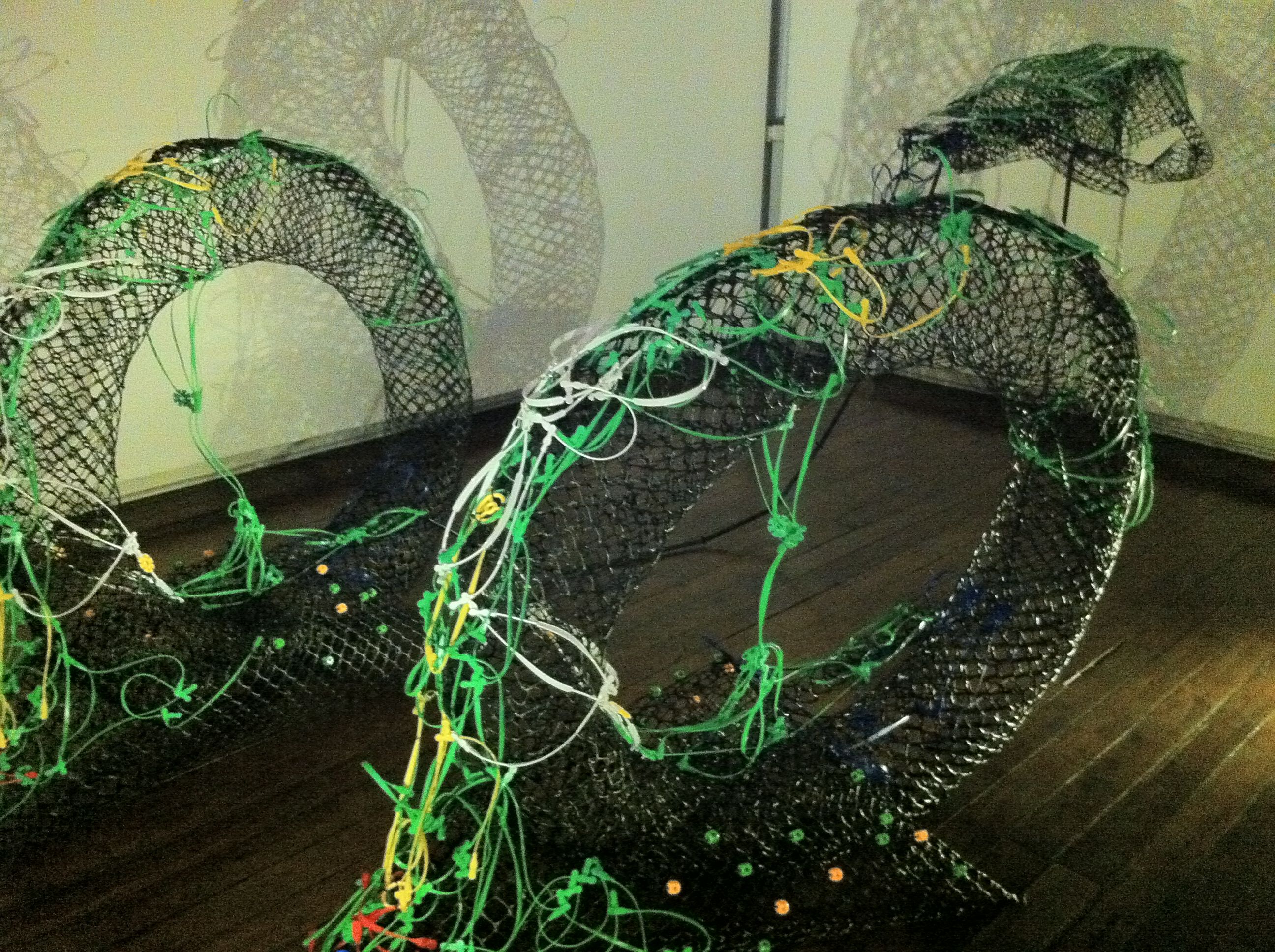 Mac let even more of her imagination loose in the gallery’s second floor. She turned black jacket stoppers and more fiberfill into an infestation of cloud gatherers: a wall of crawling insects that hoard fluffy particles into an open bag. Colored bag handles have been entwined with rolls of black plastic net for Blast Em and the Strange Passenger series, her version of space vehicles, one mother ship from which several auxiliary vehicles bay.