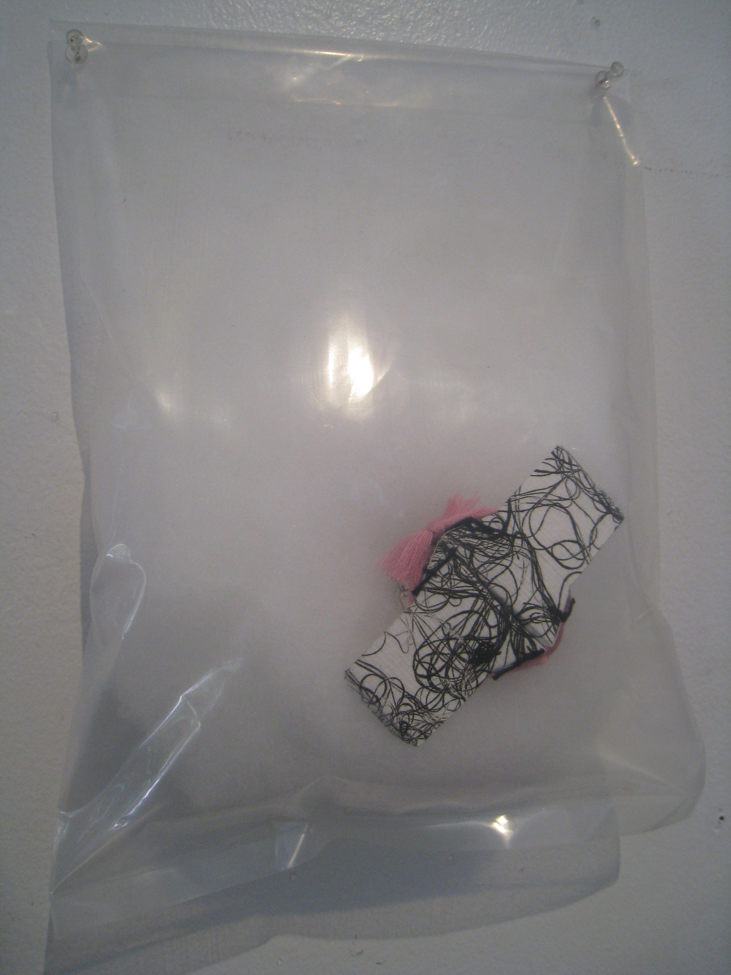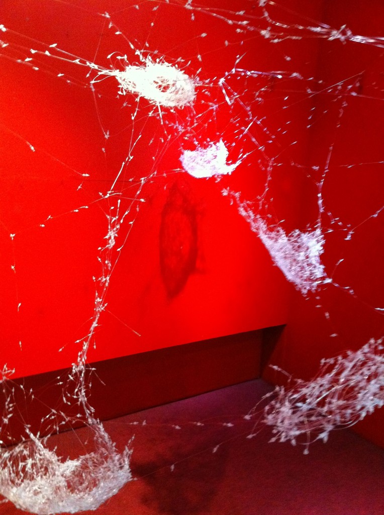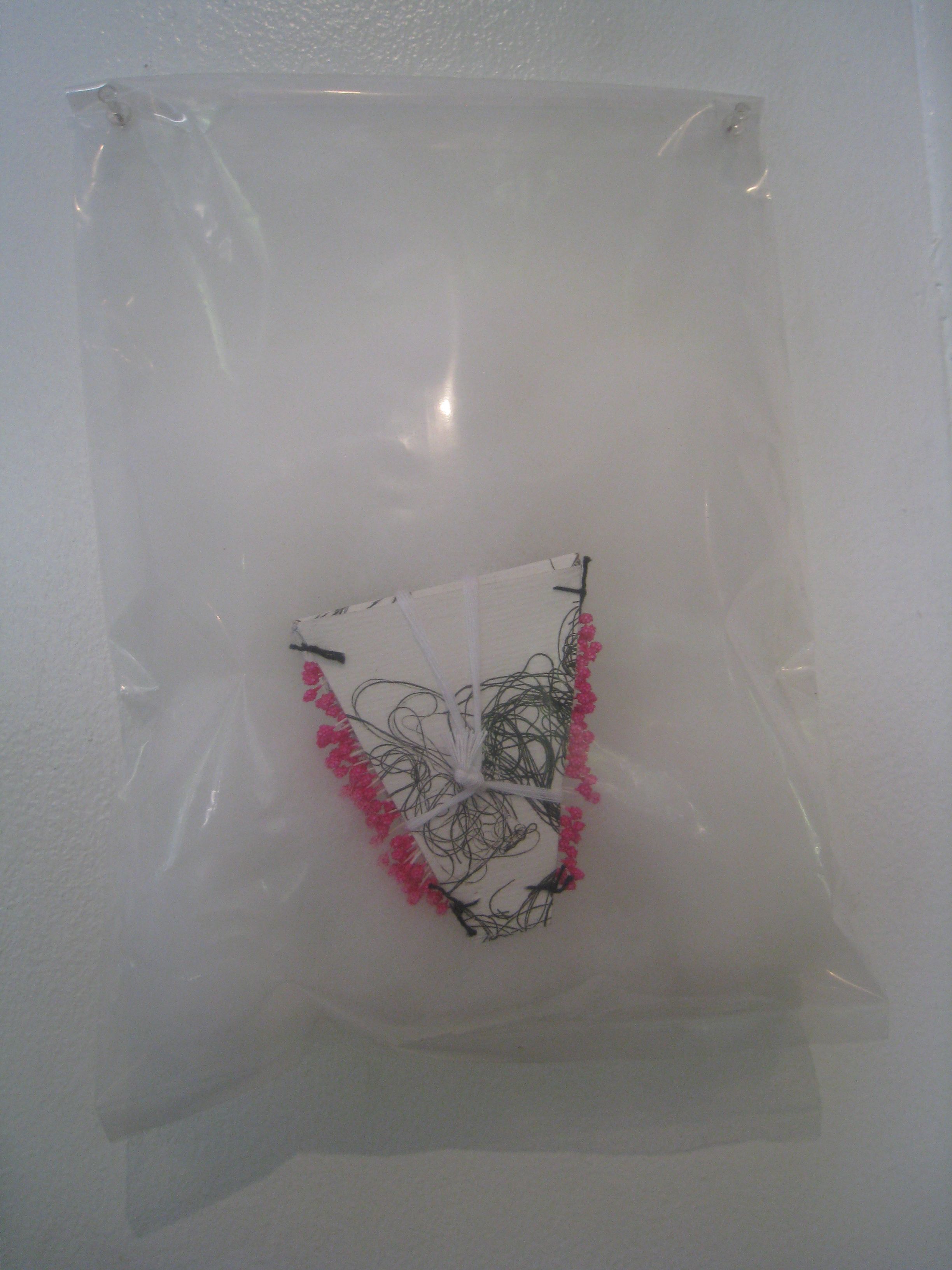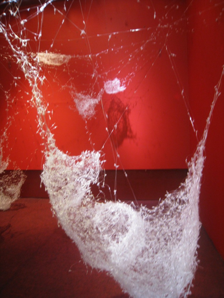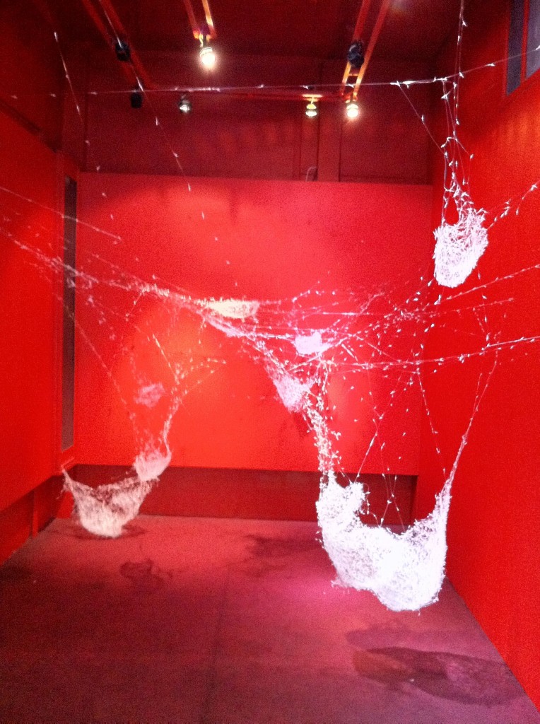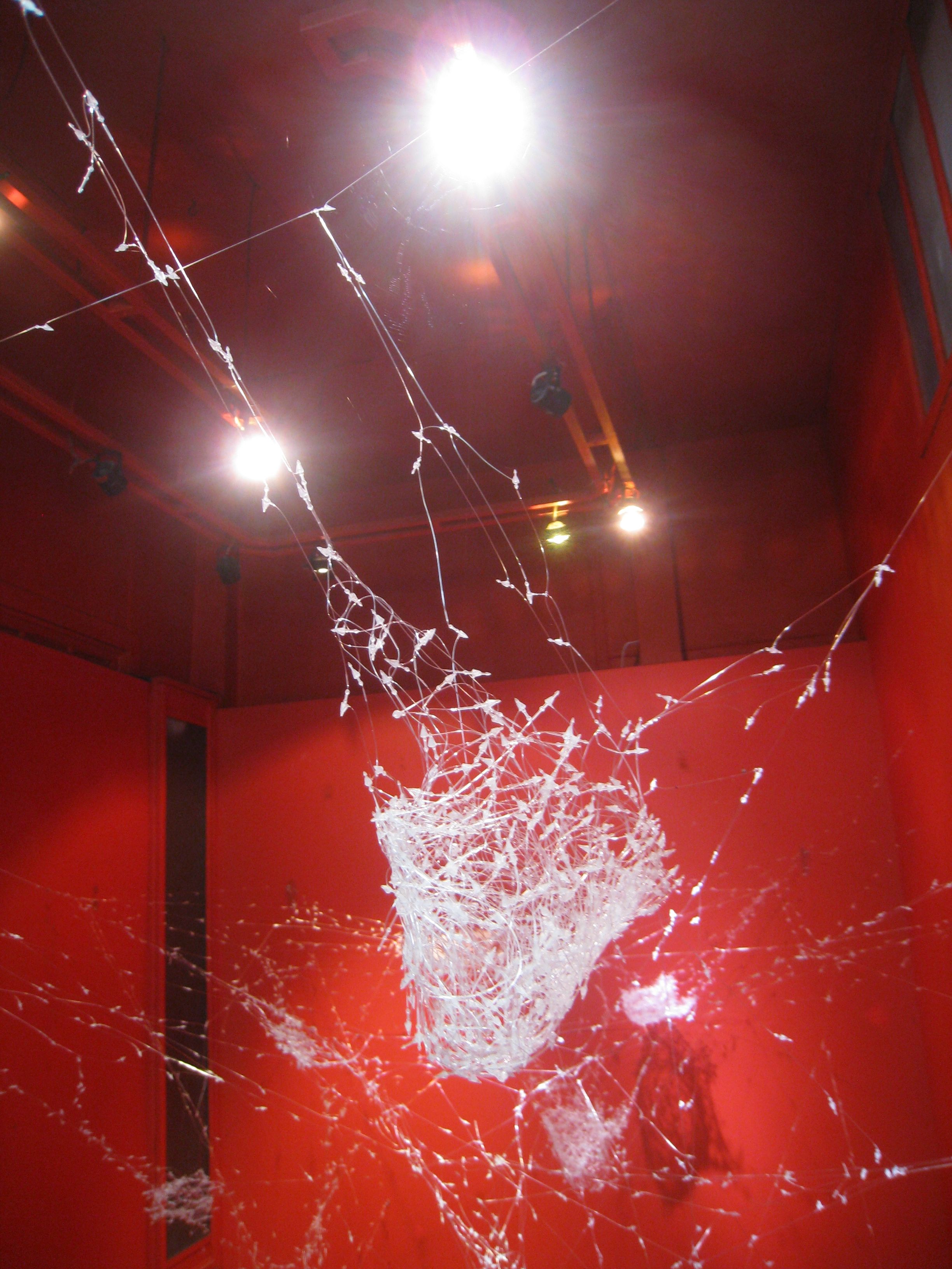 Tiny Vessels hang in a row in the ground floor hall. Enclosed in clear medium-sized plastic food bags, each vessel nestles on a fiberfill pillow. The vessels are pieces of paper folded into boxes and printed with patterns from thread. Embellished with colored pins, beads, and tassels, they resemble tiny Japanese gifts—although Mac intended for them to simulate galactic transport. The sparse installation in this main exhibit space ensures that viewers gravitate towards the bright red room in the corner. Here, thousands of clothing tag pins form Factory, a giant web–like construction suspended from the ceiling and walls, crossing the entire area.
