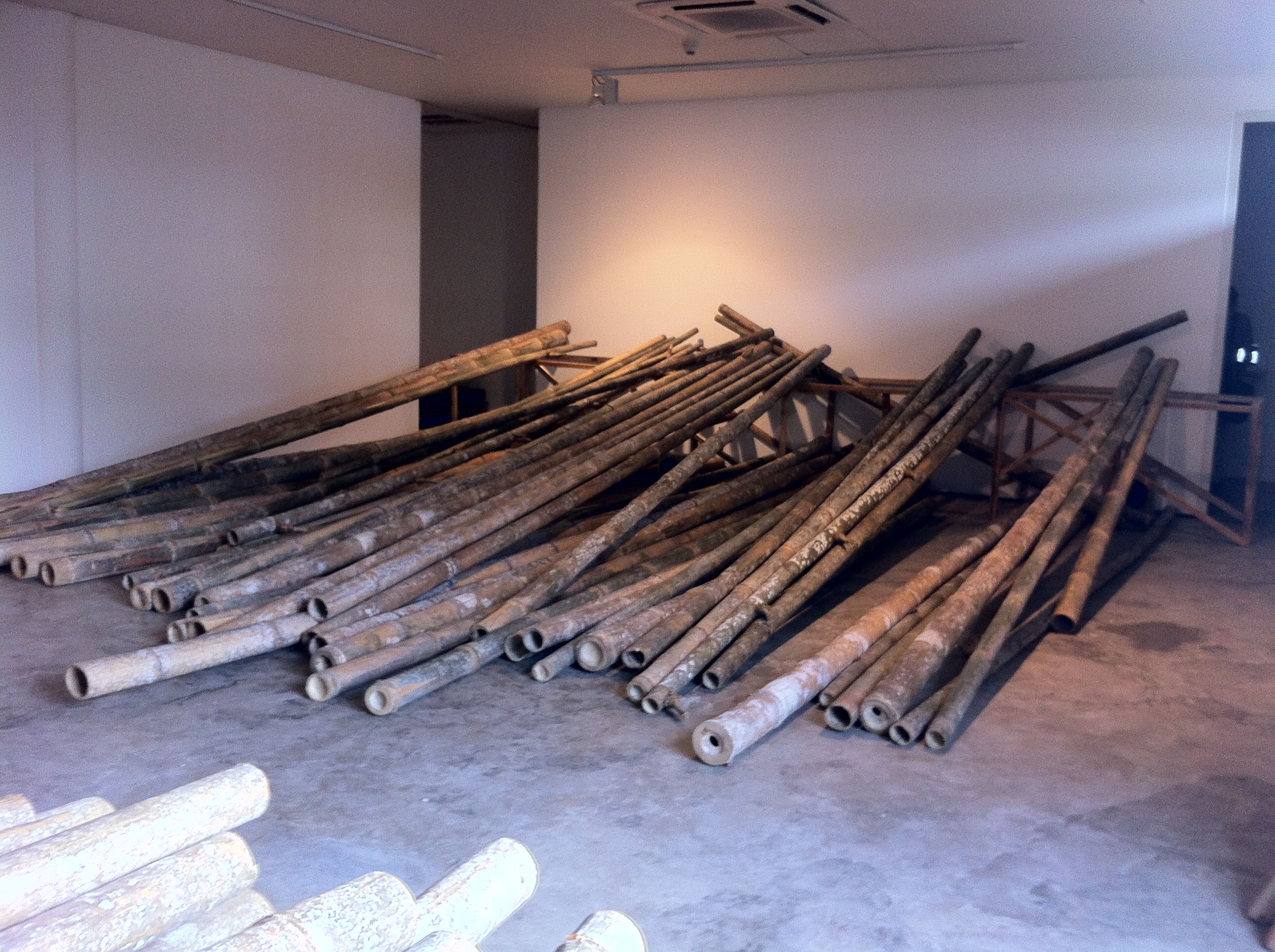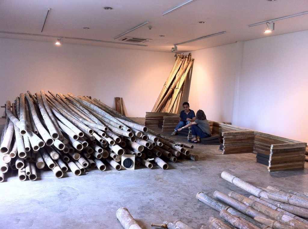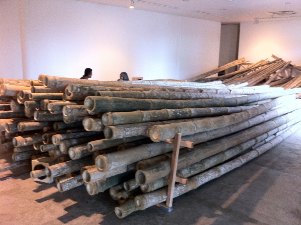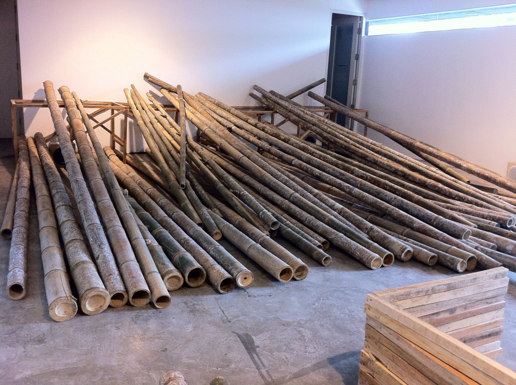 Stacks of bamboo, the thick and hefty variety used for propping up structures or serving as scaffolding, fill the gallery.  Assorted lengths of wood lean against the walls.  The whole installation resembles preparations for a construction site.