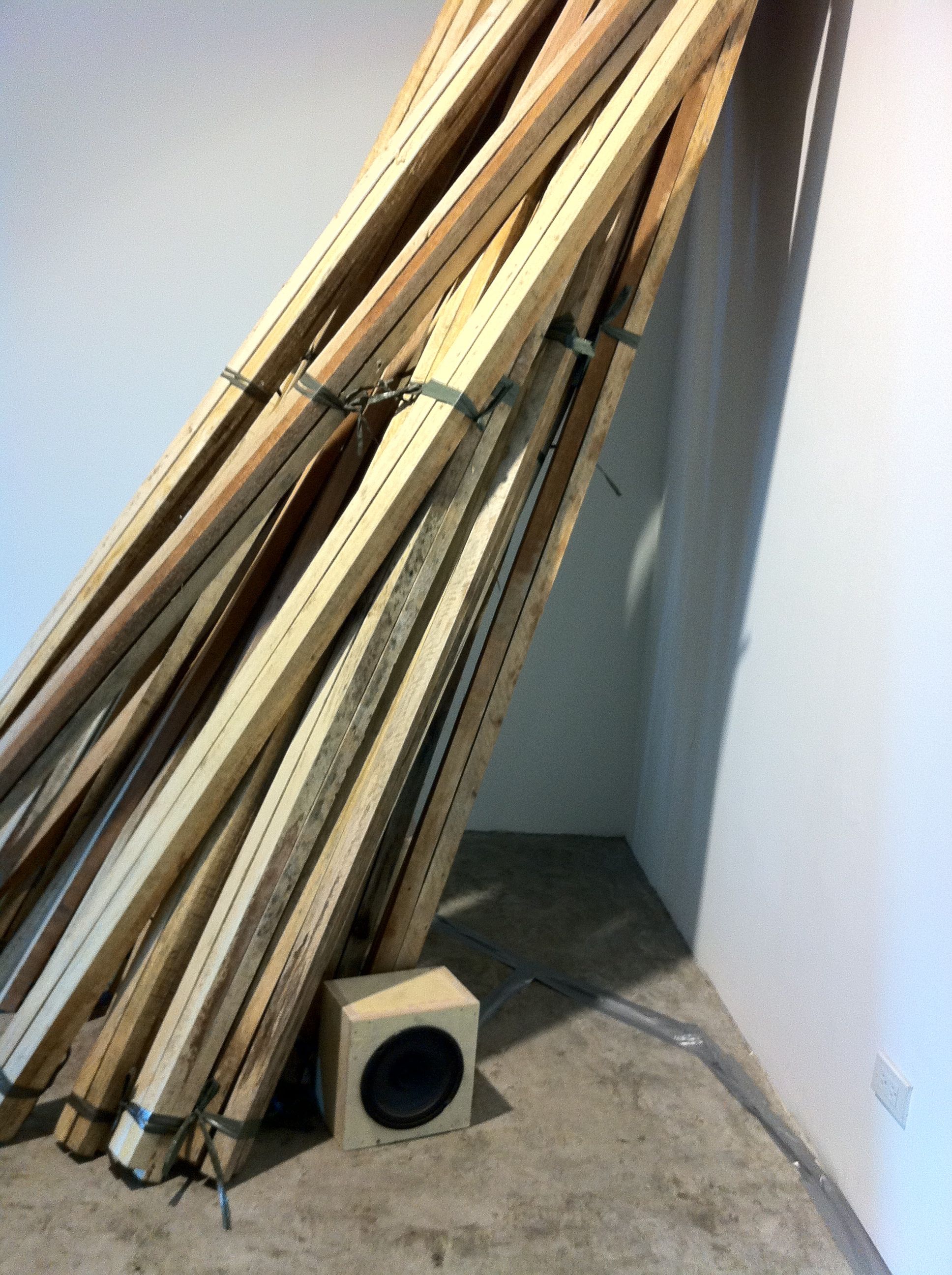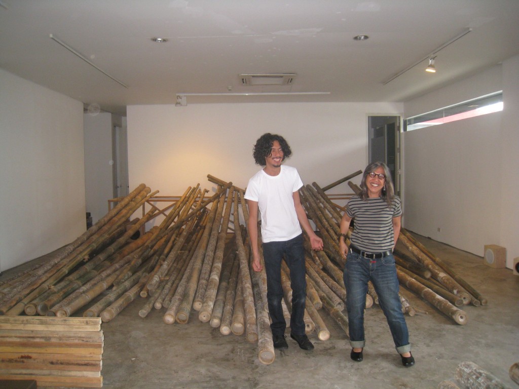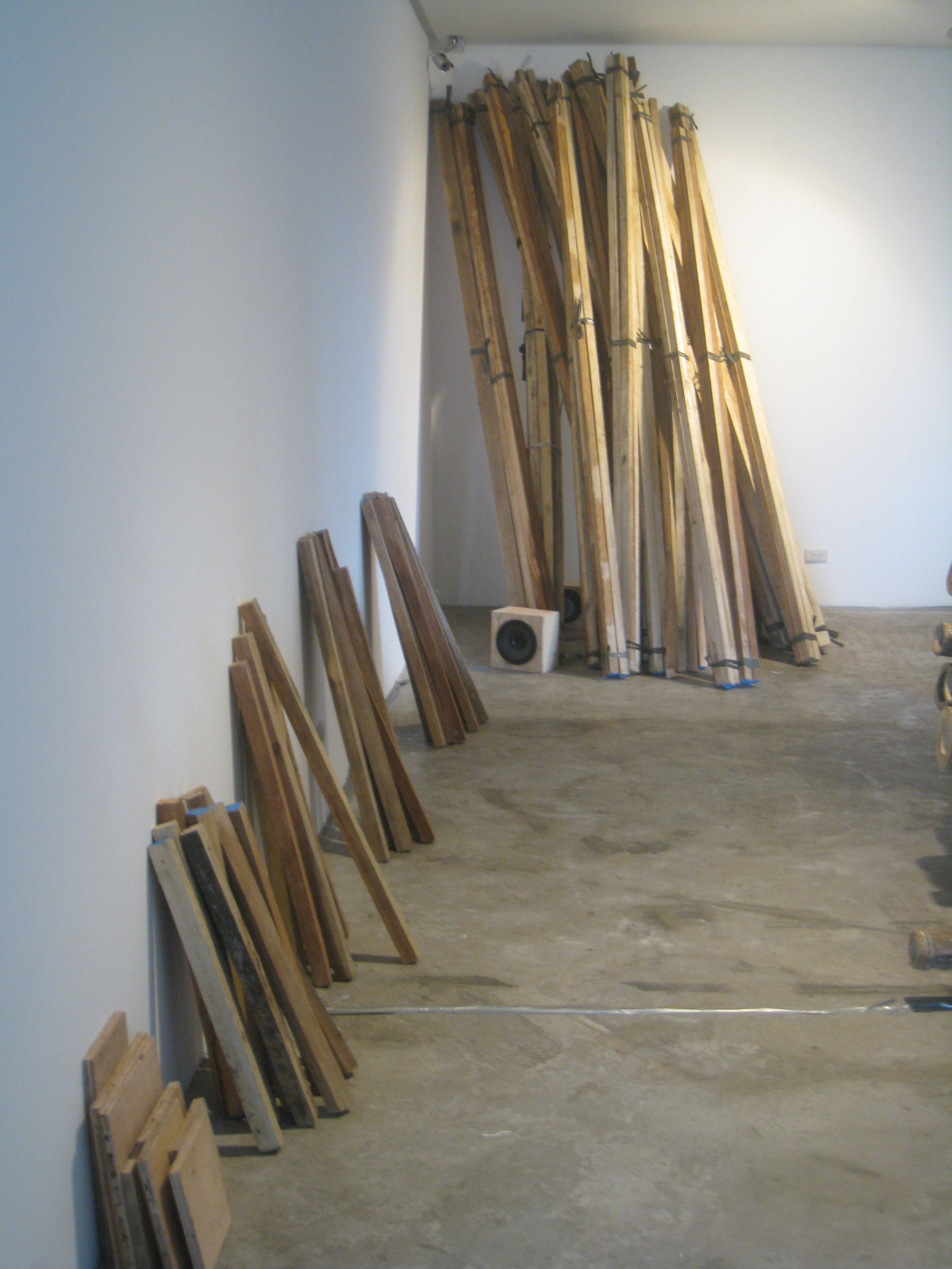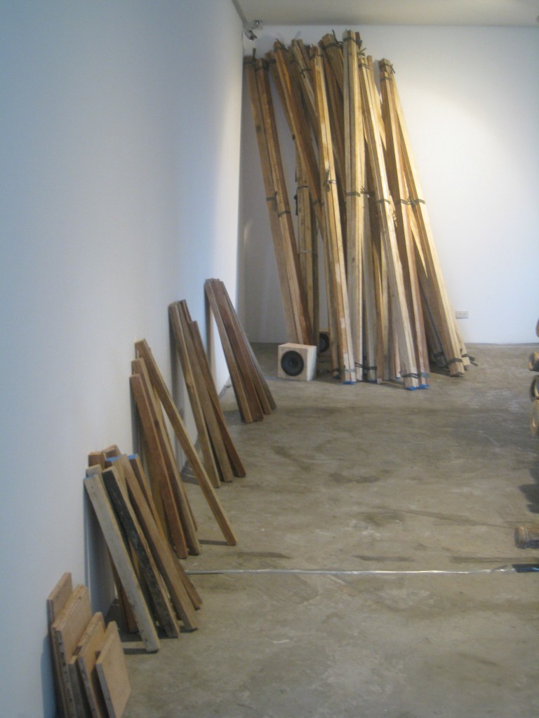 Stacks of bamboo, the thick and hefty variety used for propping up structures or serving as scaffolding, fill the gallery.  Assorted lengths of wood lean against the walls.  The whole installation resembles preparations for a construction site.