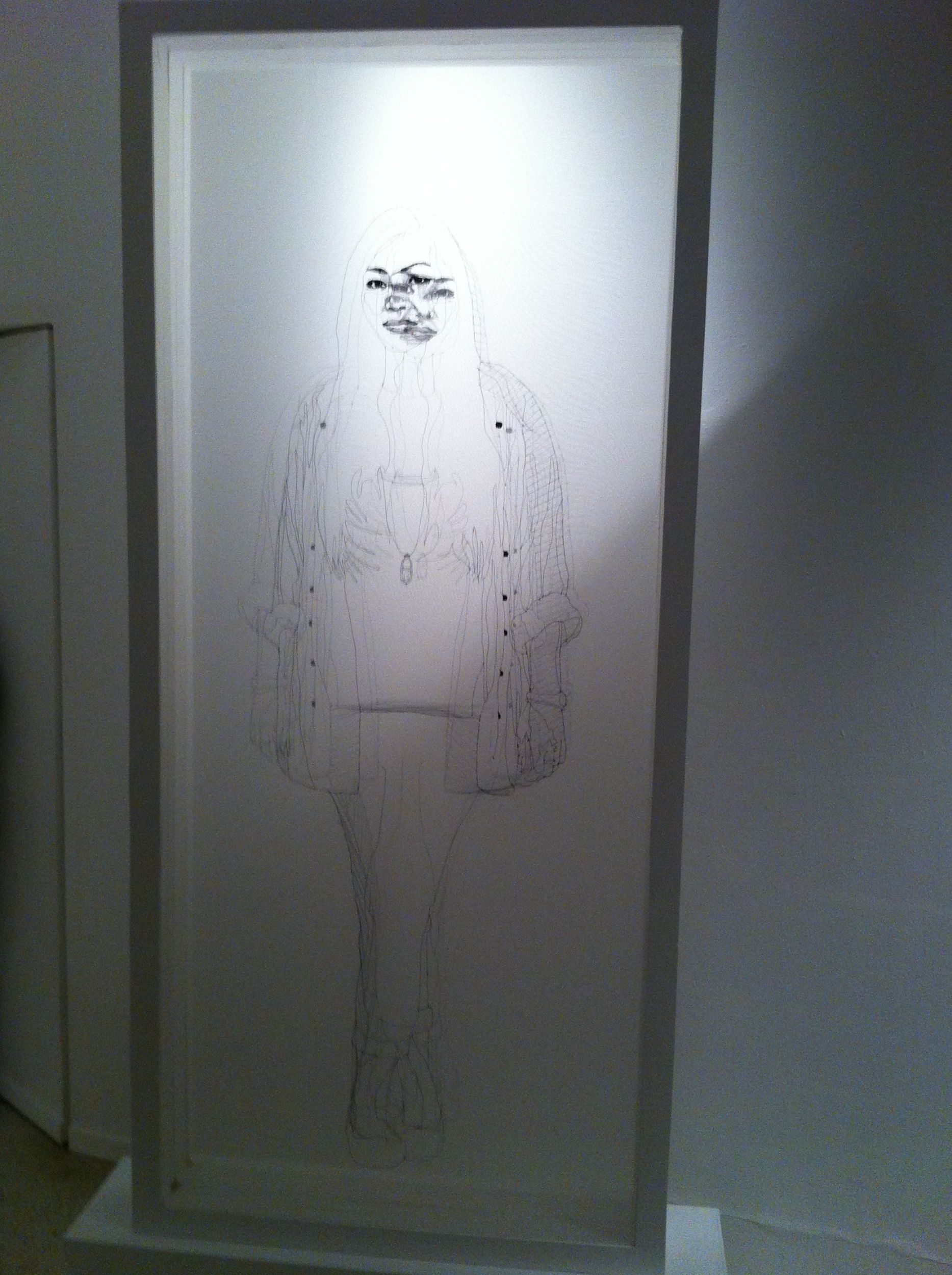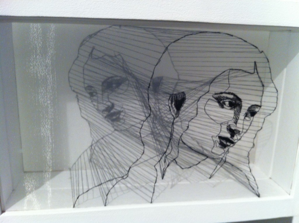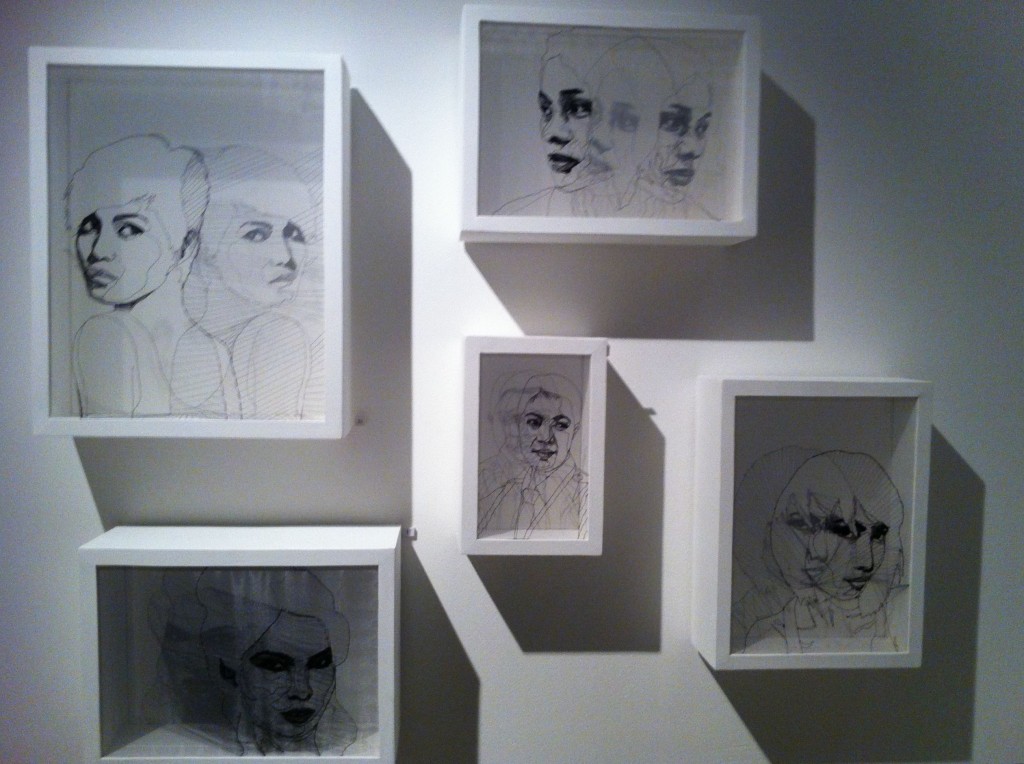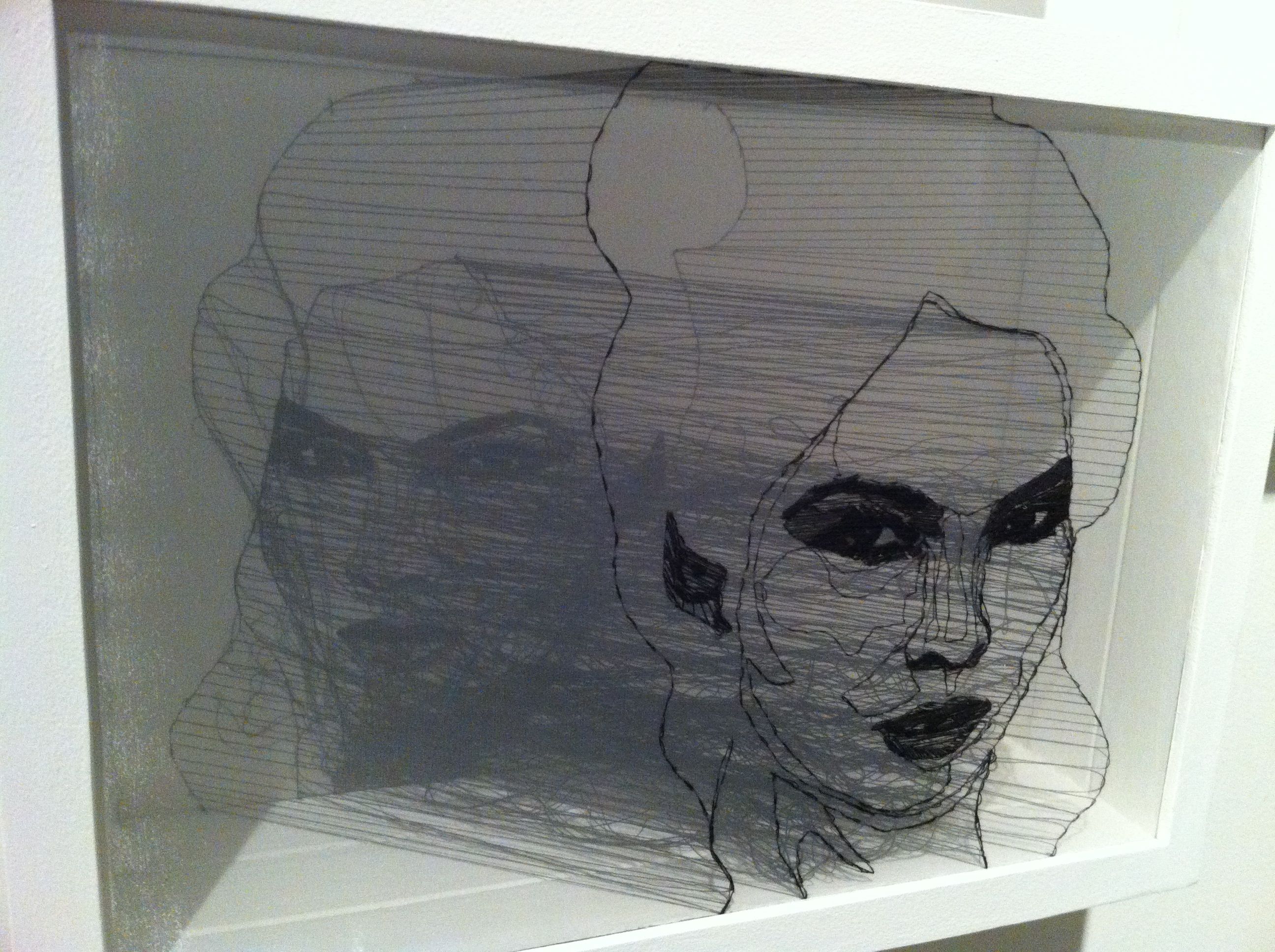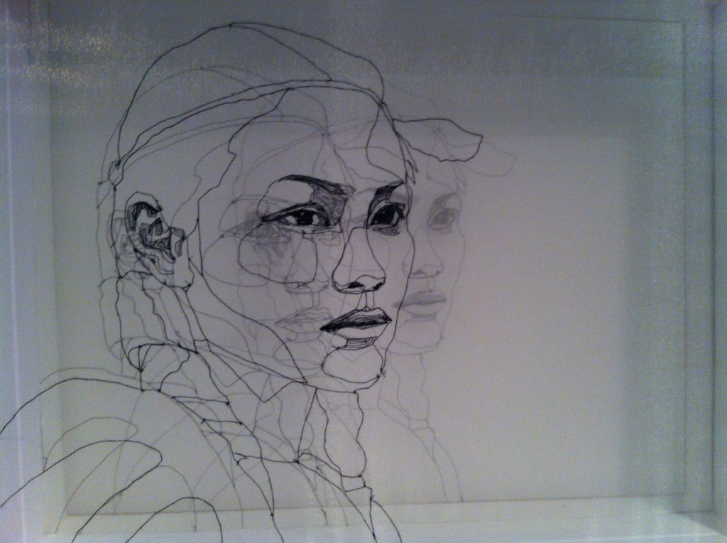 Ginny arrays the screens in a particular order so that her needlework is glimpsed through the translucent cloth, and each image is carried across the multiple layers of silk—a three-dimensional sketch. Her subjects appear like holograms; the images shift depending on which angle one views them from. Ginny framed each of her portraits in white, and hanging as they are on bright white walls, there is a clean, fresh feel to her show.