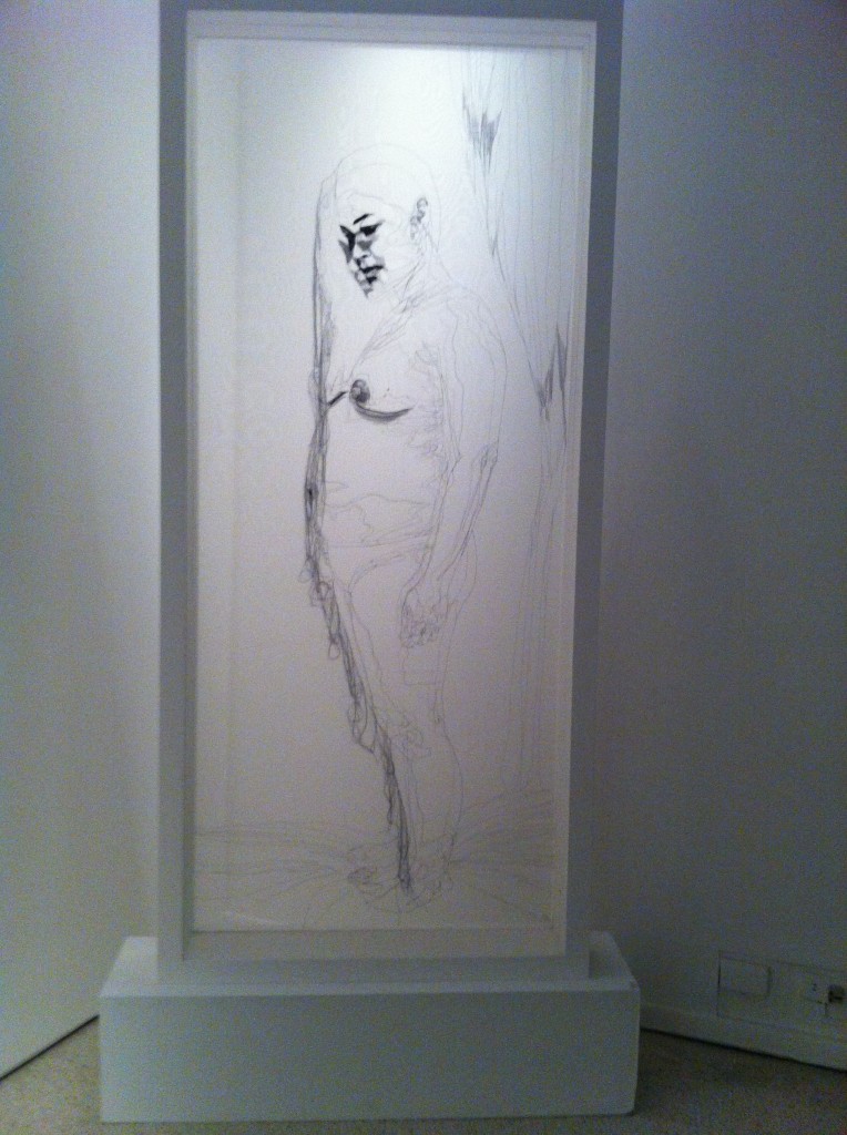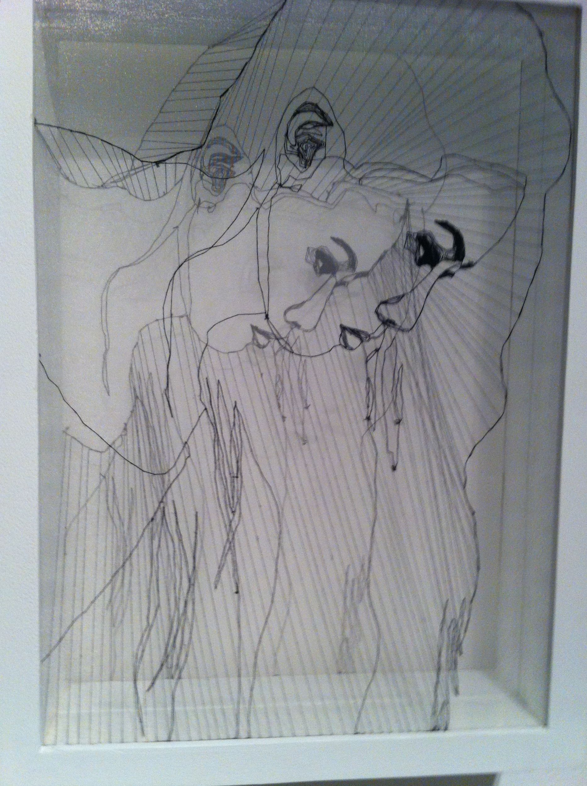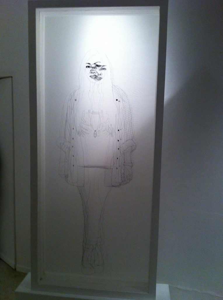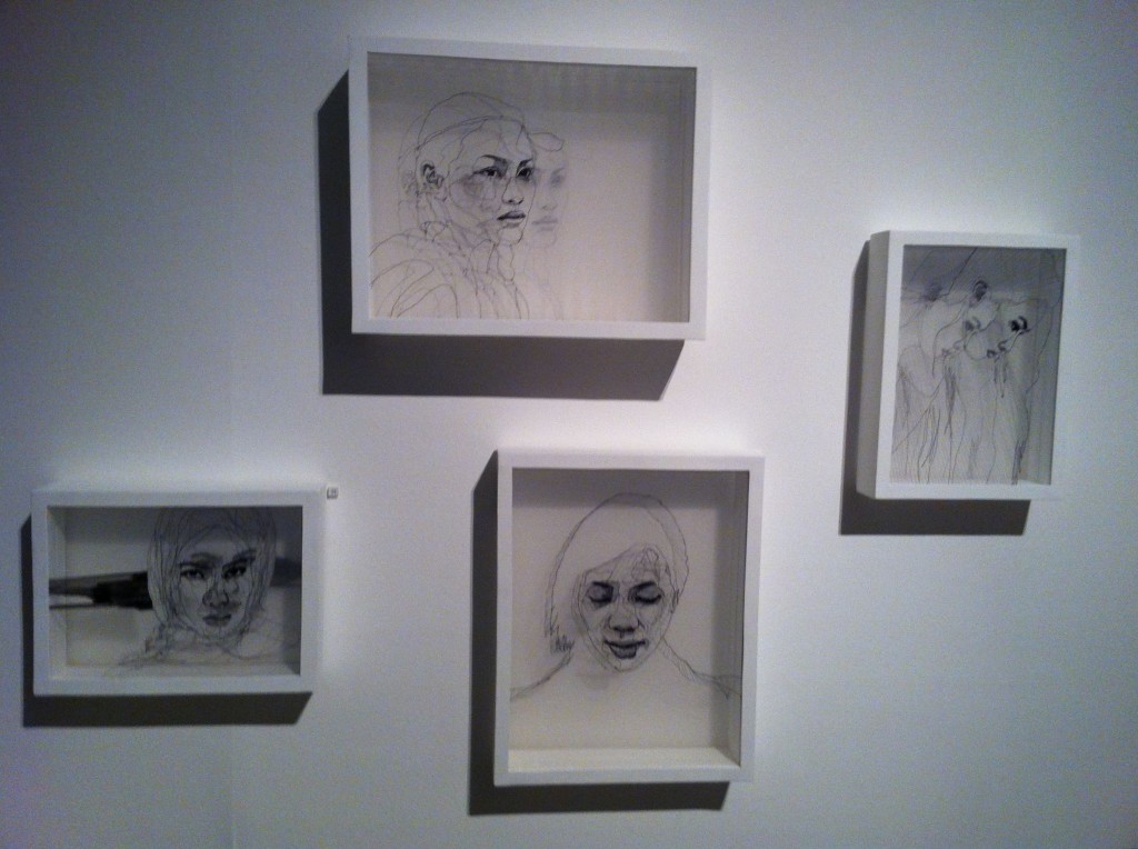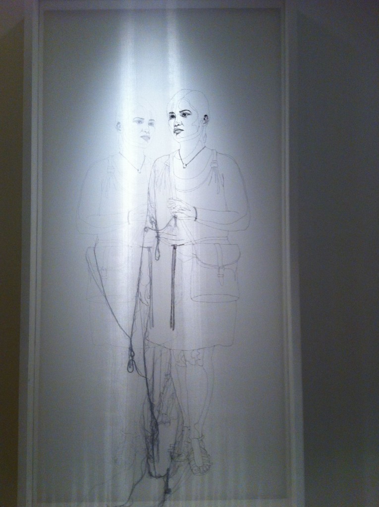 Ginny arrays the screens in a particular order so that her needlework is glimpsed through the translucent cloth, and each image is carried across the multiple layers of silk—a three-dimensional sketch. Her subjects appear like holograms; the images shift depending on which angle one views them from. Ginny framed each of her portraits in white, and hanging as they are on bright white walls, there is a clean, fresh feel to her show.