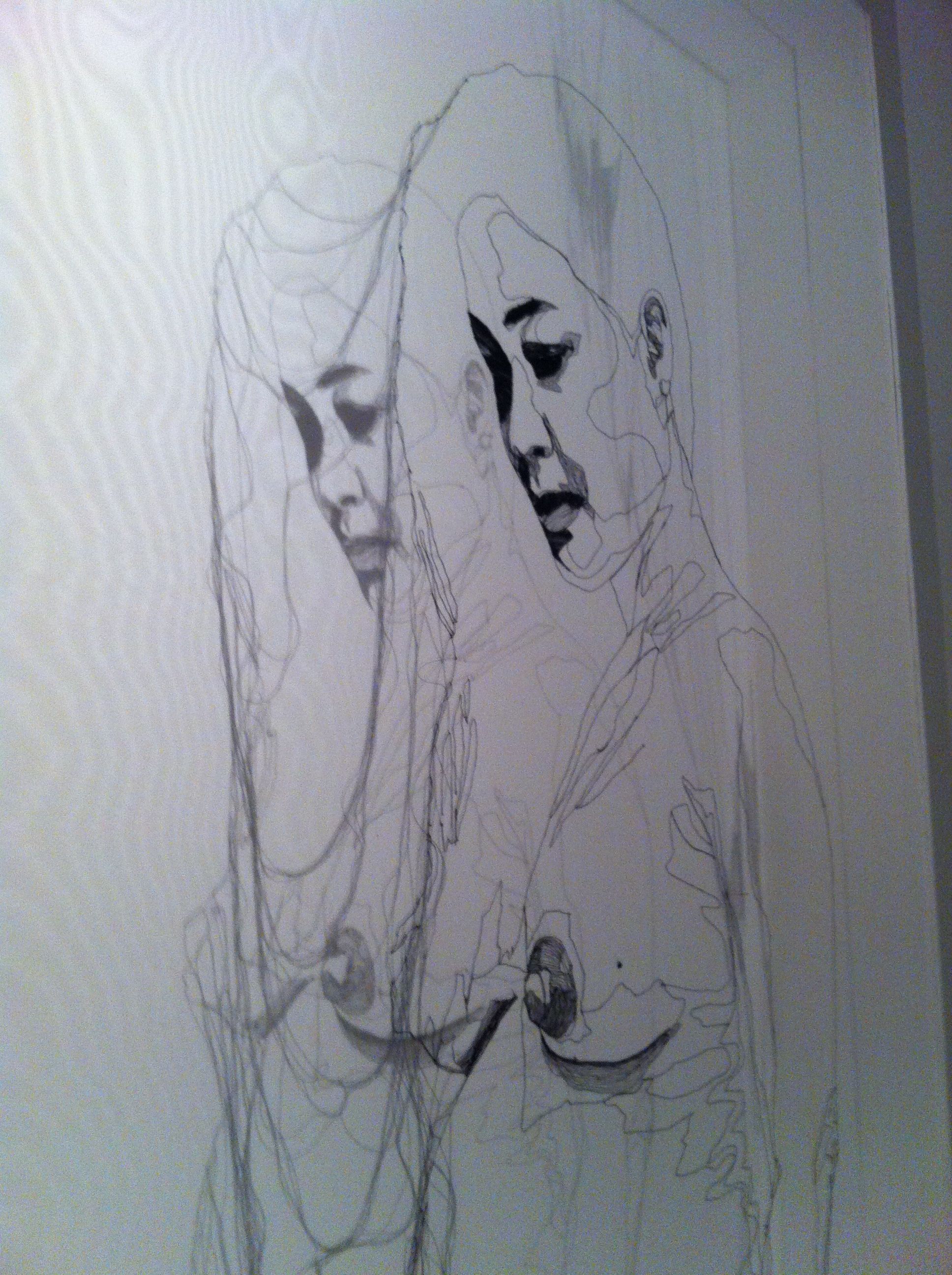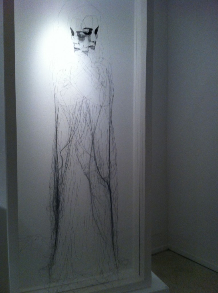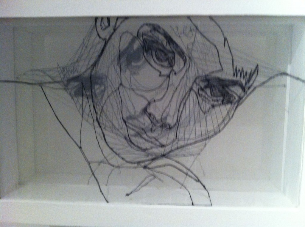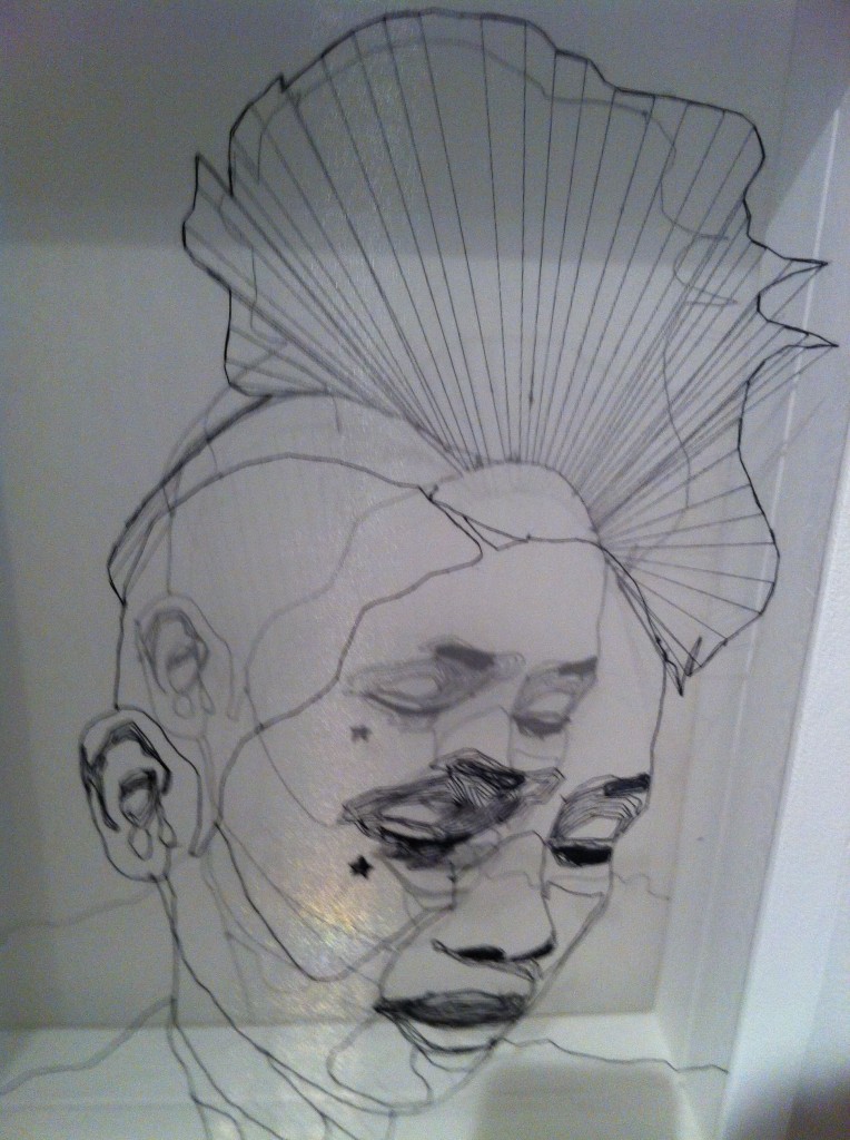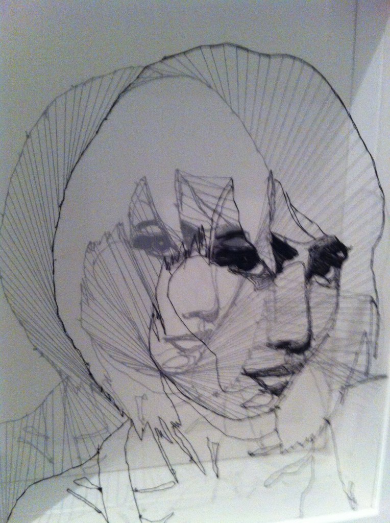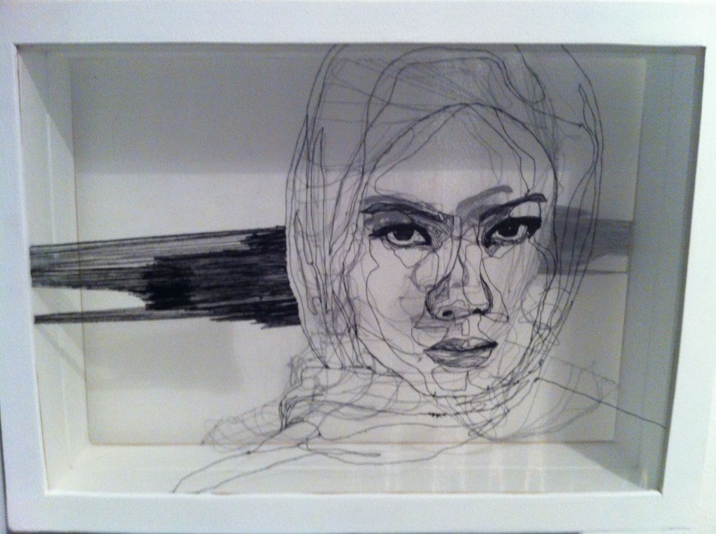 The title of her first one-man show, Thread, comes from the medium that Ginny has chosen to work with. As she did with those portraits for Art In The Park, Ginny captures her subjects by sewing their impressions on silk screens, the gossamer fabric used mainly for transferring images in ink. Fine black strands stretch tautly or fall into tendrils, outlining features in place of pen or pencil.