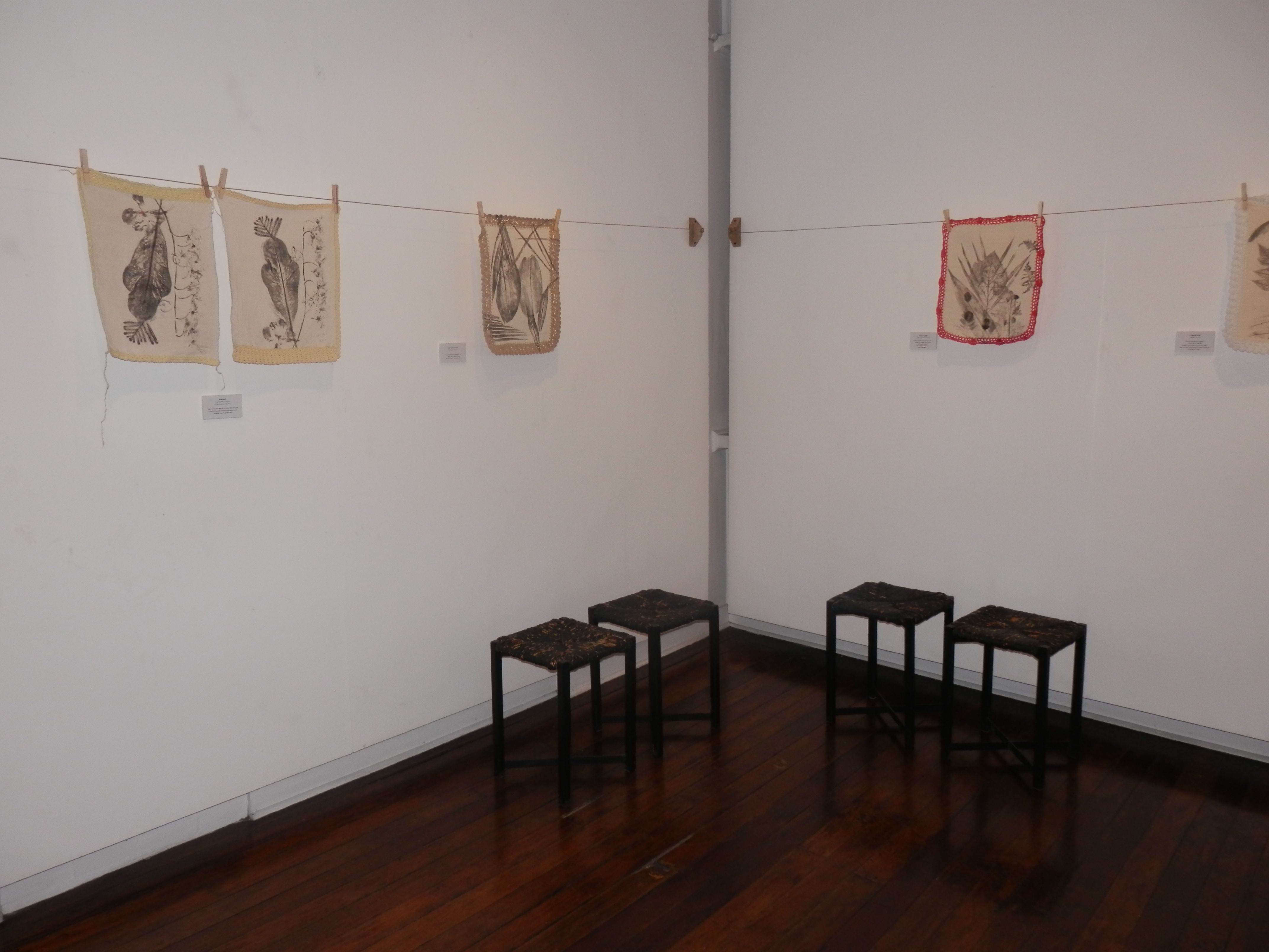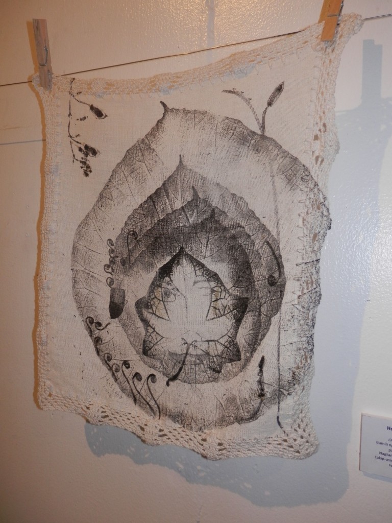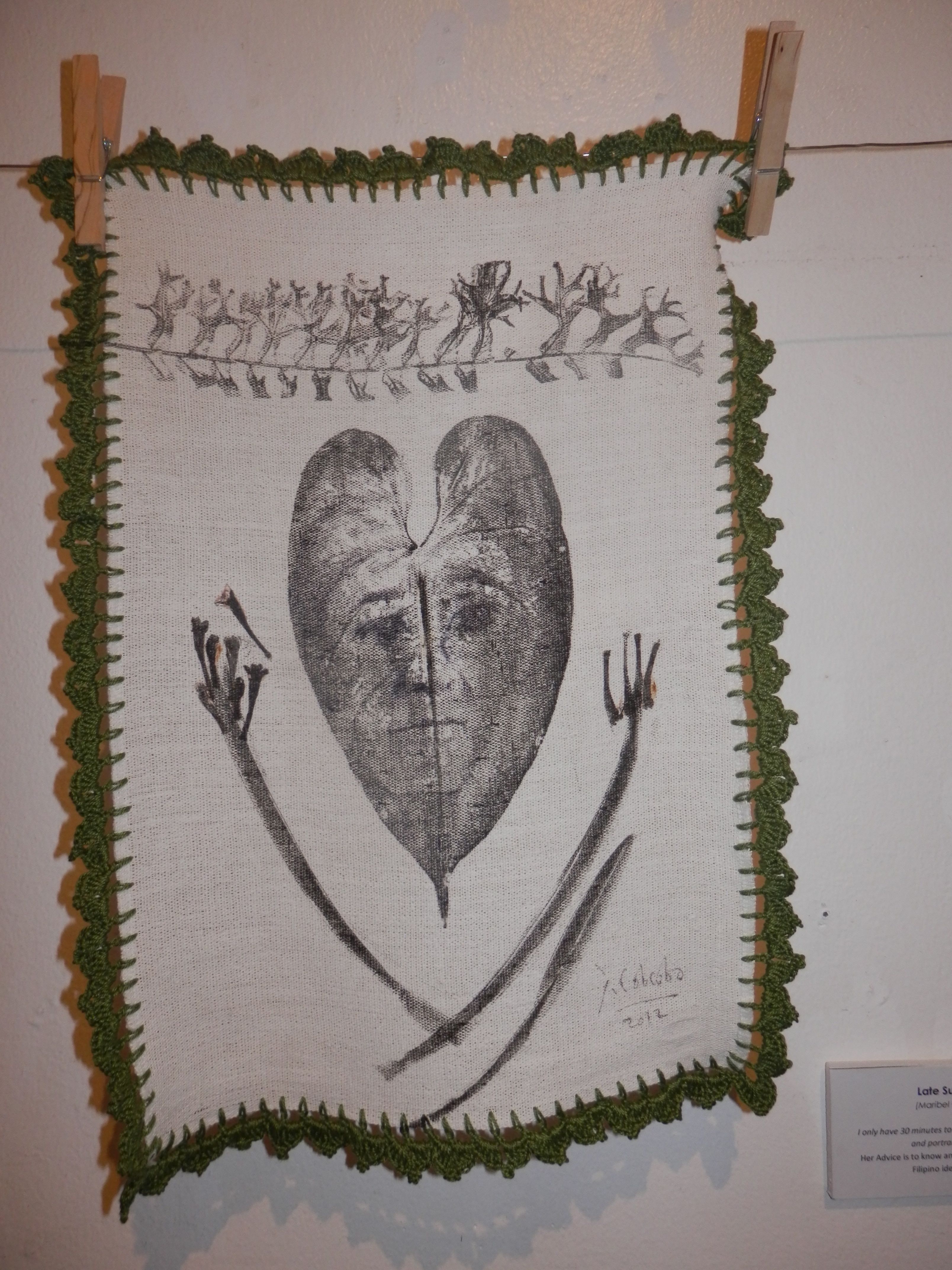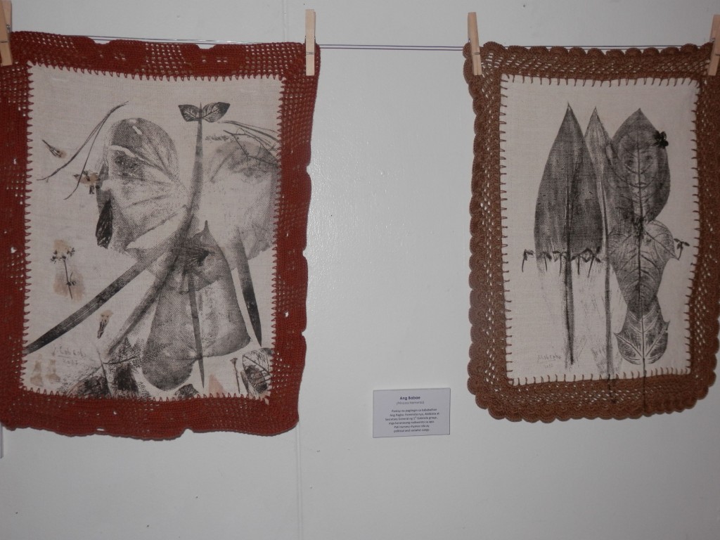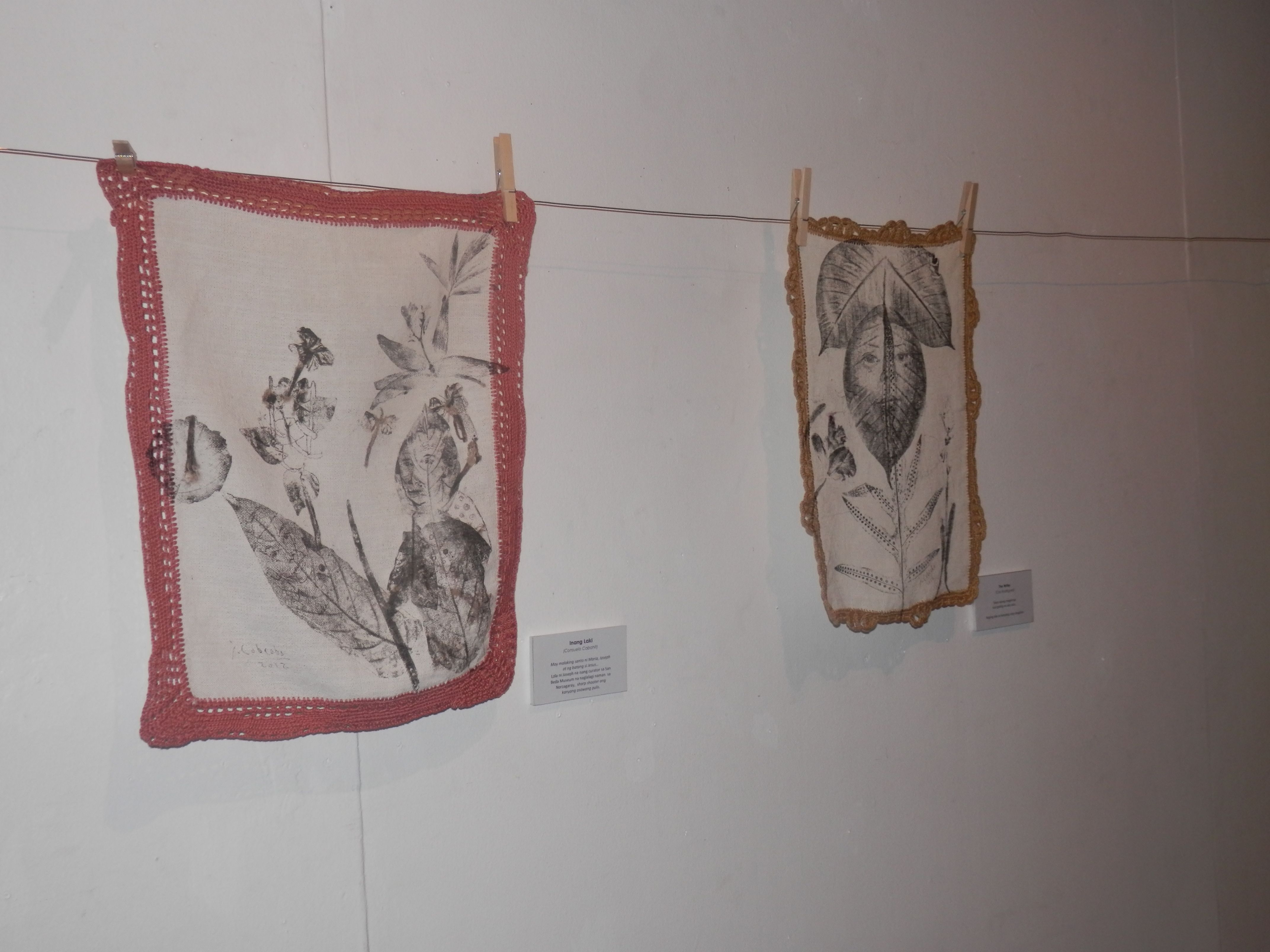 Currently running at Avellana Art Gallery, Lola 101 Part 2 presents more of his conversations with grandmothers, 46 more of them to be exact. This completes his goal of speaking to 101 women, lolas all. After each interview, then as now, Joey engraved portraits of these women on large leaves then printed his impressions onto fabric. Lace crocheted by his mother frames each piece of cloth. The works hang all over the gallery, a jaunty, heartwarming celebration of family love.