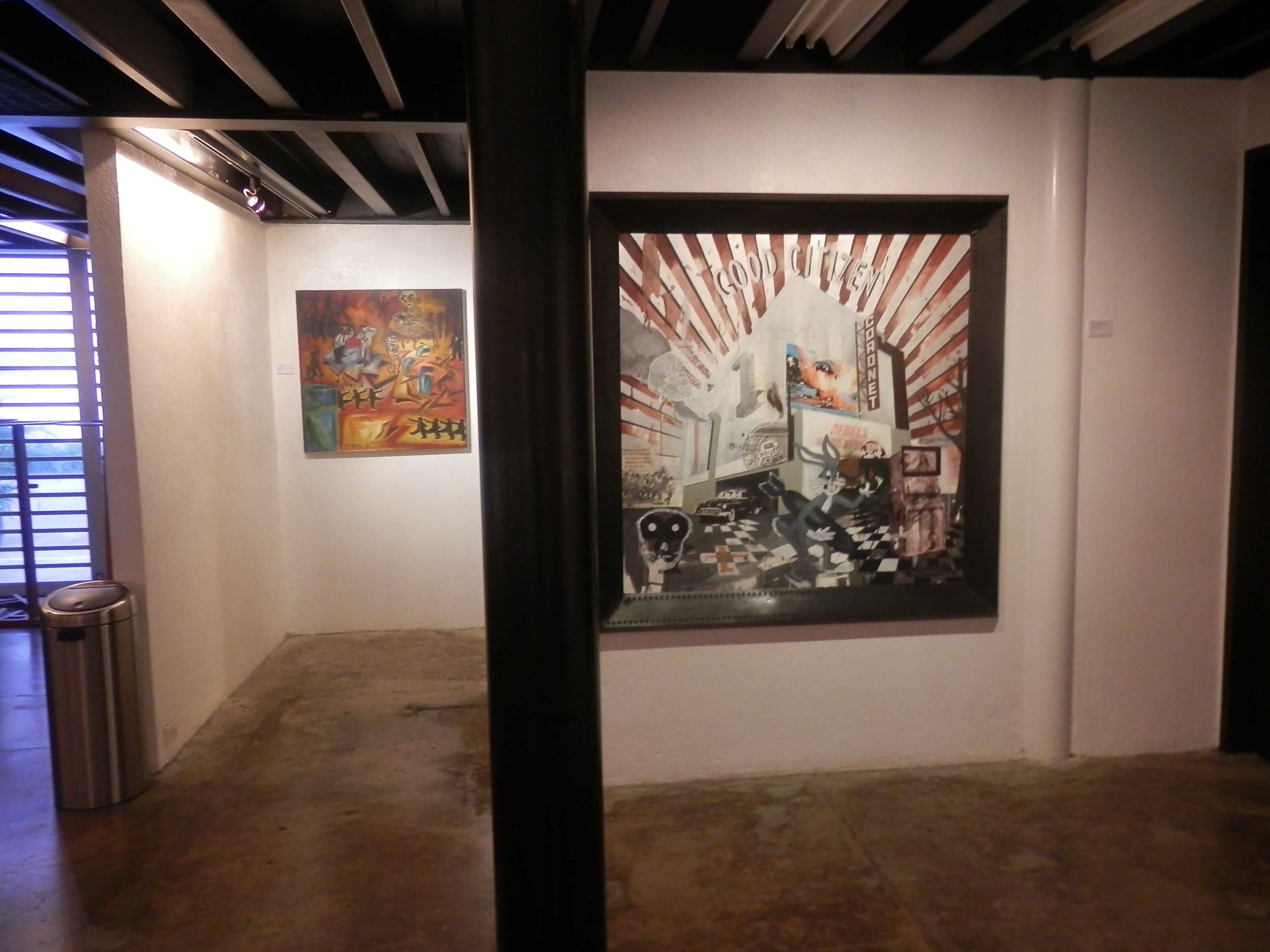 Charlie Co, "Times Where", oil on canvas, 1990 and Kawayan de Guia, "Good Citizen", mixed media, 2011