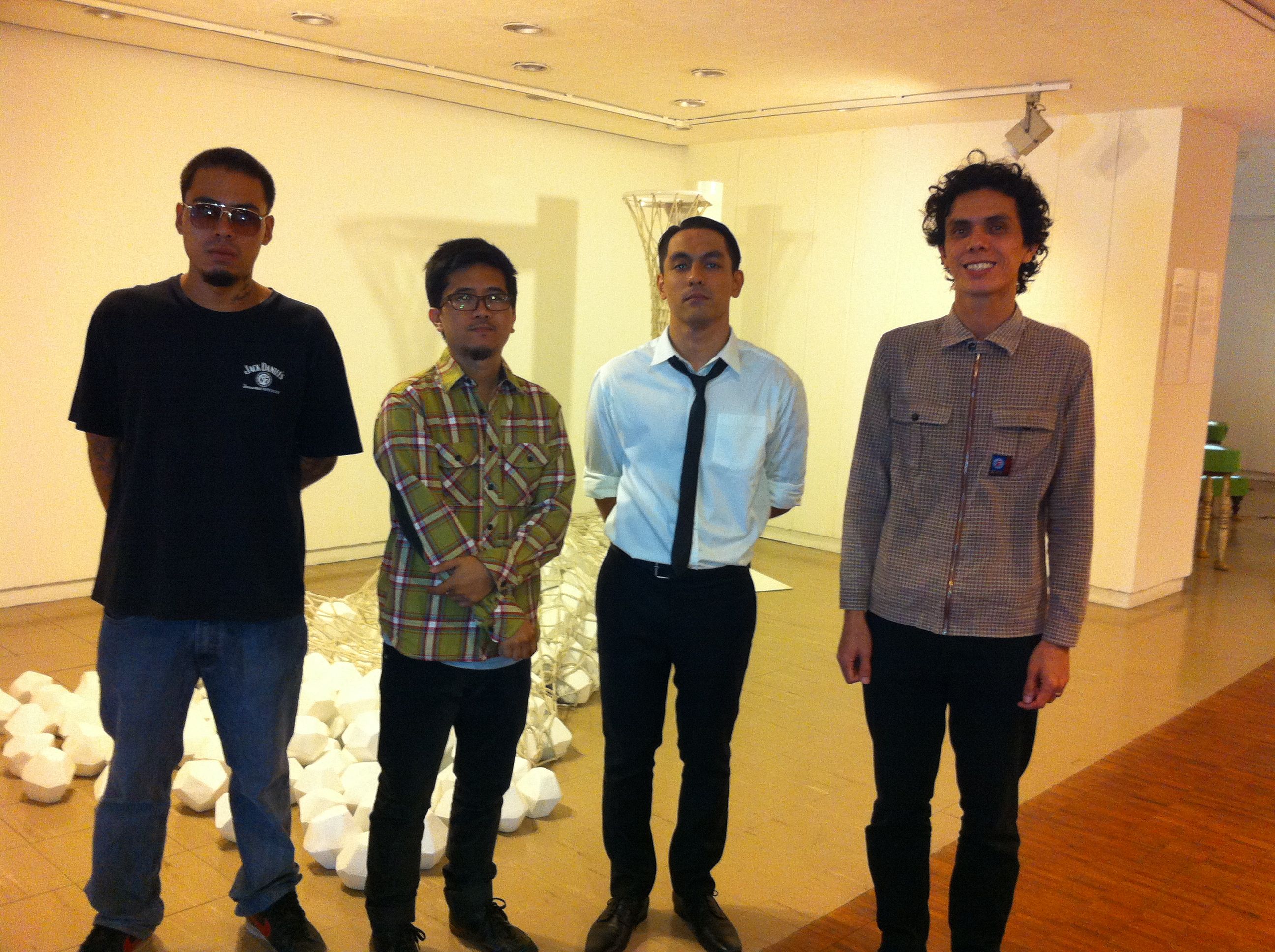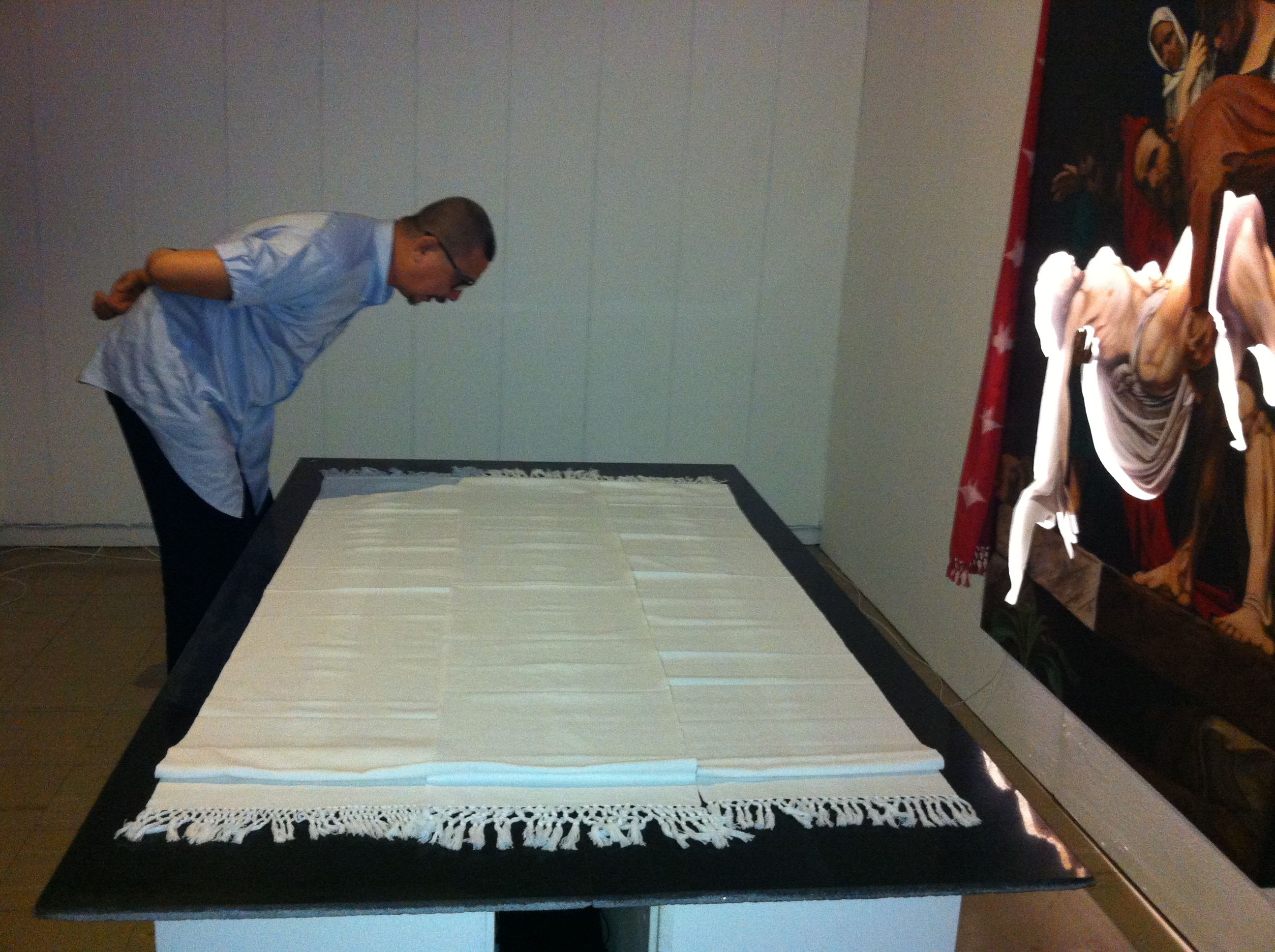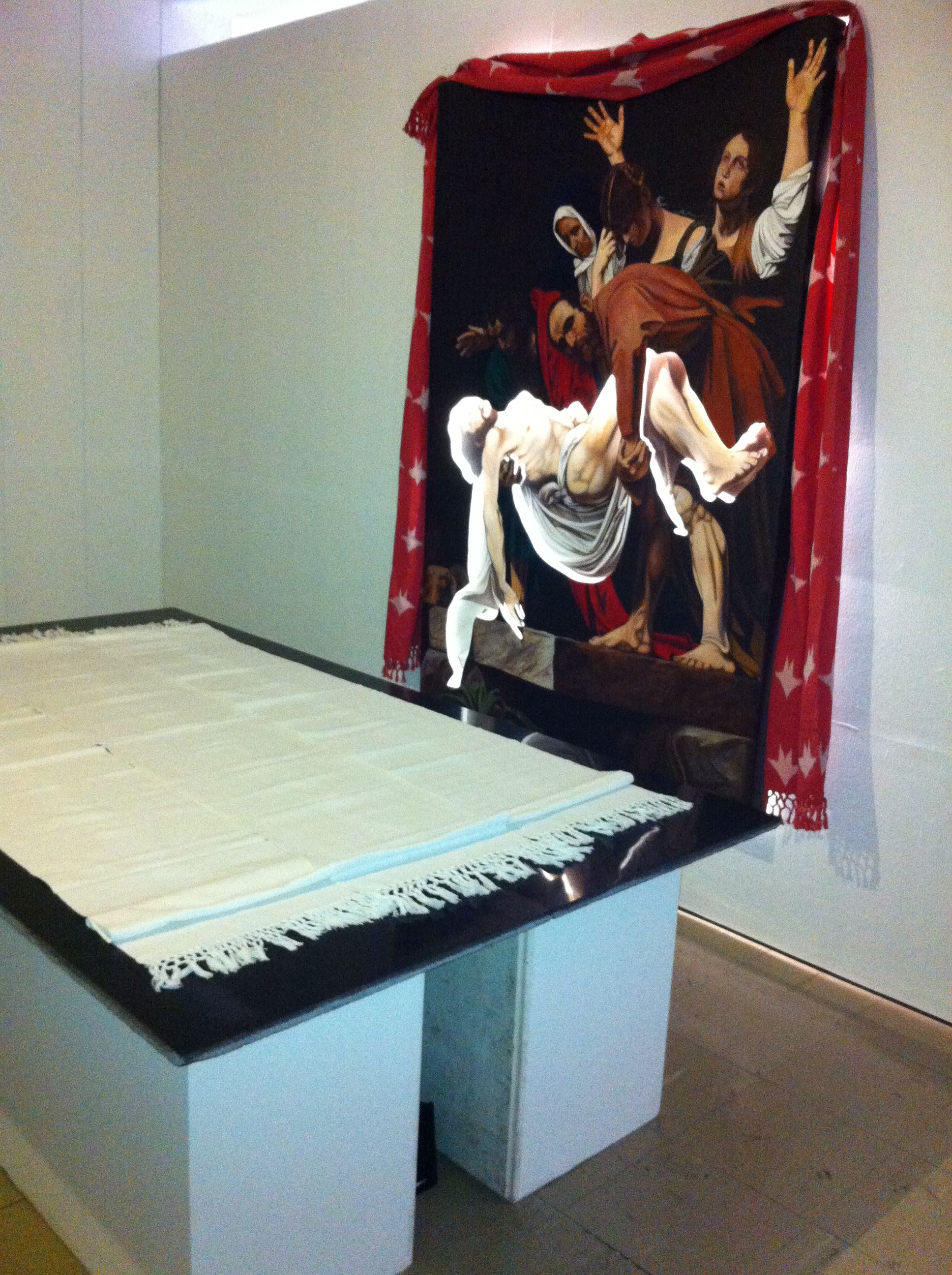 Michael Muñoz had a section closed off for his work, an installation in three parts. Mike has moved from politically charged protest works to those with themes of salvation and redemption, pieces that explore his spirituality. He has also started working with indigenous artisans for the preservation of traditional crafts. In Morir Ob Christum, Morir Intra Christum, he recreates a Baroque religious painting, sets a swath of textile used by indigenous tribes in burial rituals before it, and had the street artist Joop spray paint a graffiti inspired piece to stand directly across his painting. All three pieces represent the different stages of his artistic practice thus far.