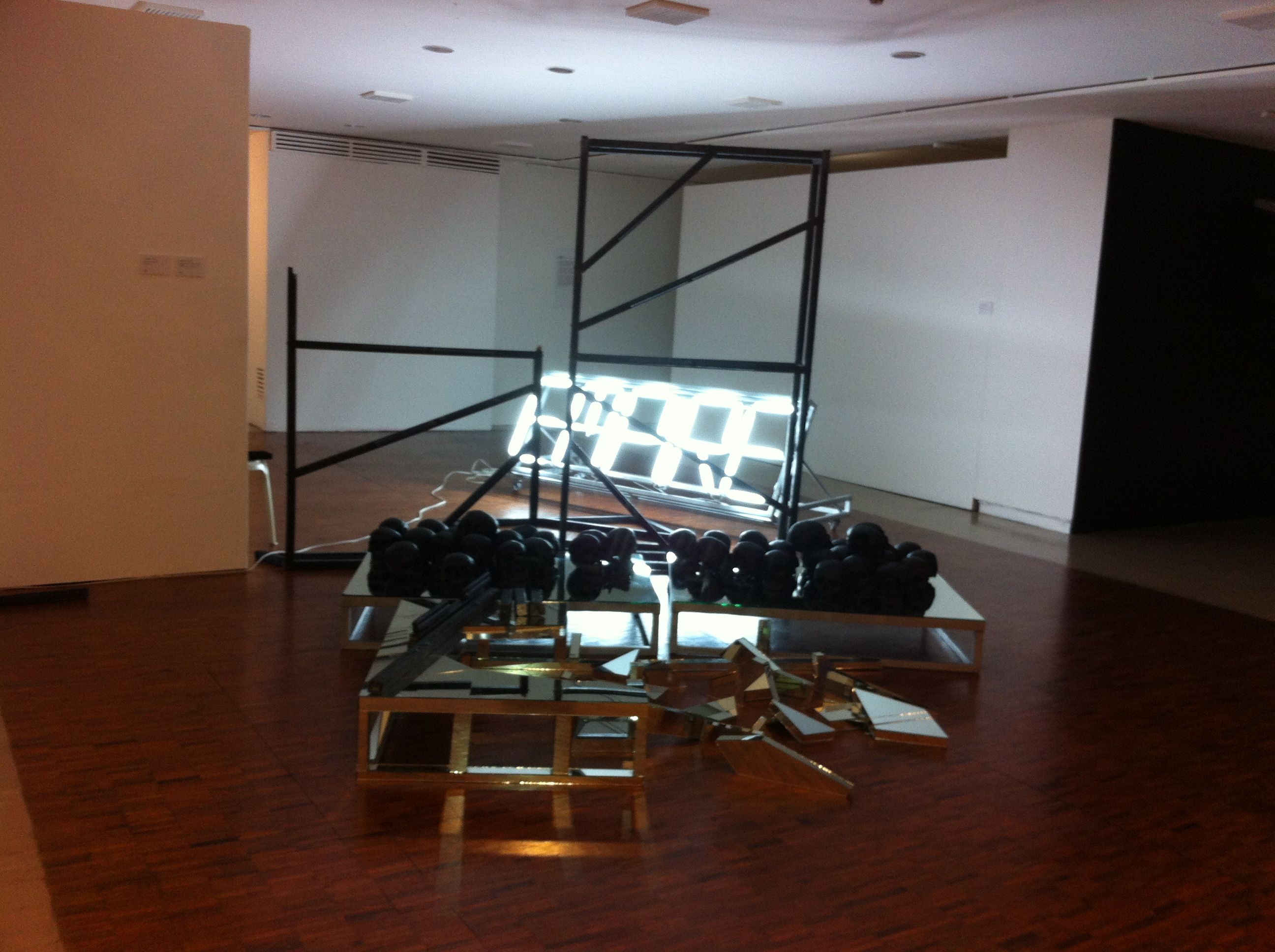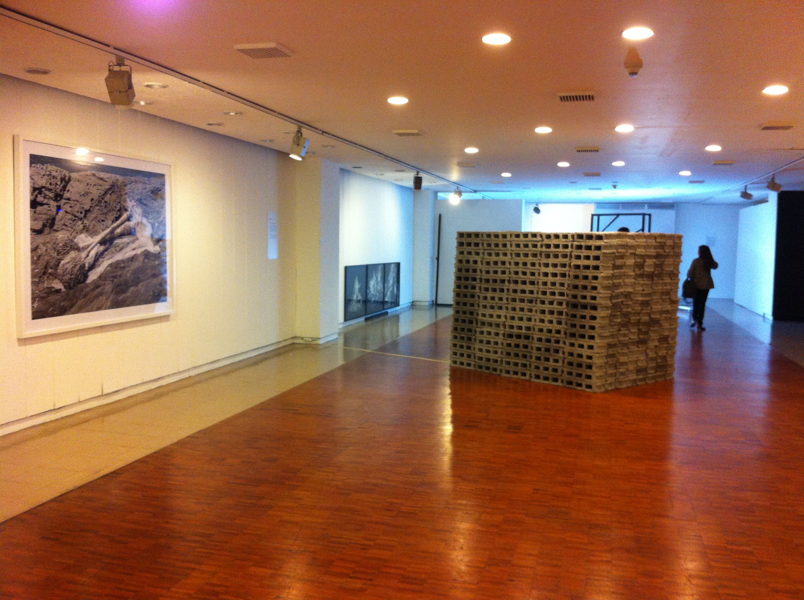 Modern Unit by Mark Salvatus, made up of stacked hollow blocks, comments on the unrealistic promises of real estate developers to deliver paradise in a metropolis teeming with humanity and sorely lacking in available space. It continues the investigation on urban living that Mark began for his Ateneo Art Awards return exhibit last year. The structure on display simulates the amount of space of an average studio unit offered for sale.