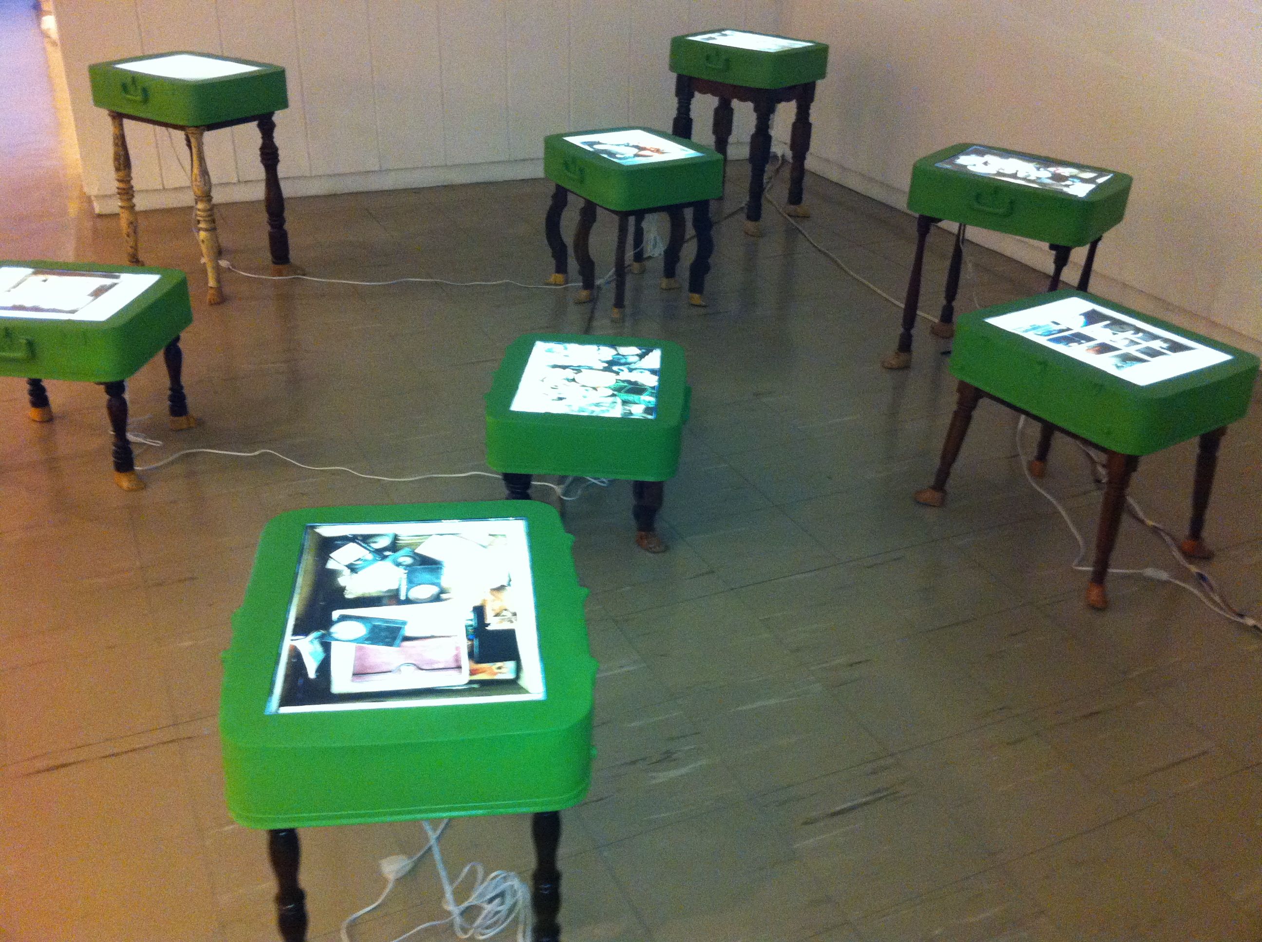 Rodel’s wife, Marina Cruz, has frequently mined her family’s history for her work. This time, she uses her own story, that of a mother to two toddler boys, as material for Walking Suitcases. Casted suitcases, supported by carved pegs propped up on wooden children’s feet, hold light boxes that contain photographs of objects around their house. Riel Hilario rendered life-sized versions of his sculpture, contemporary takes on the santo figure. Next to Riel and Marina stands Wawi Navarozza’s Long Stretch, After The Storm No. 3. Newly returned from a year in Barcelona, Wawi is more familiar for her photographs. She has Displacement and Landing, with two Palm Trees, taken in Spain, to represent this facet of her practice.