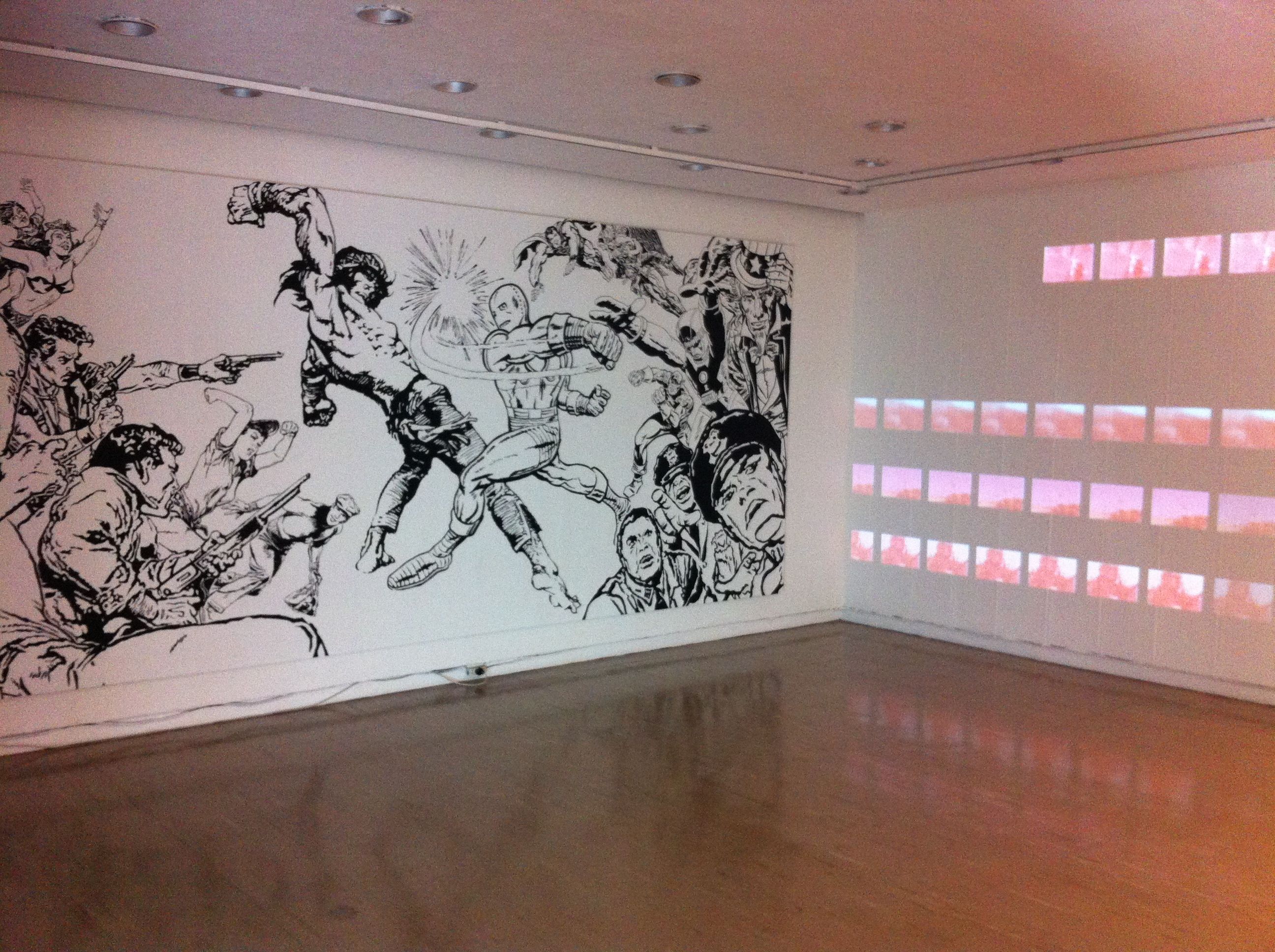 The notes describe Renan Ortiz’s Empire as playing “…with moving and painted images and sounds of war from different periods in modern-day history. He jumbles up these elements to create his own cohesive video into a large projection.”
