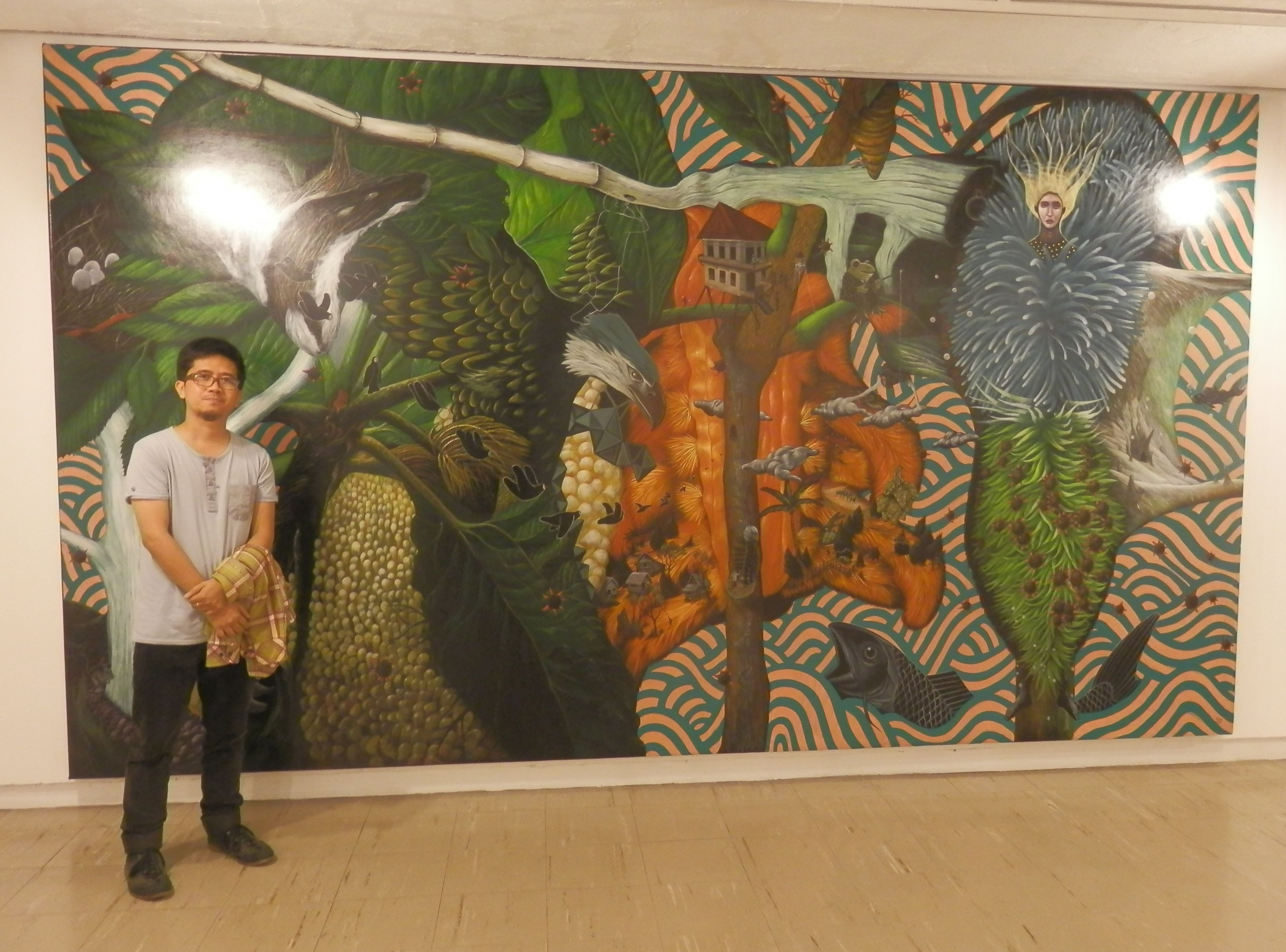 Inside the main exhibit area, Rodel Tapaya’s The Early Bird Catches The Worm welcomes you. An 8 ft. x 20 ft. acrylic on canvas painting, this piece demonstrates how much more complex Rodel has taken his compositions. Deeper colors and more elaborate patterns make his narratives so much richer. Next to him, Joey Cobcobo draws on his Igorot roots to showcase his printmaking skills on multi-dimensional surfaces.