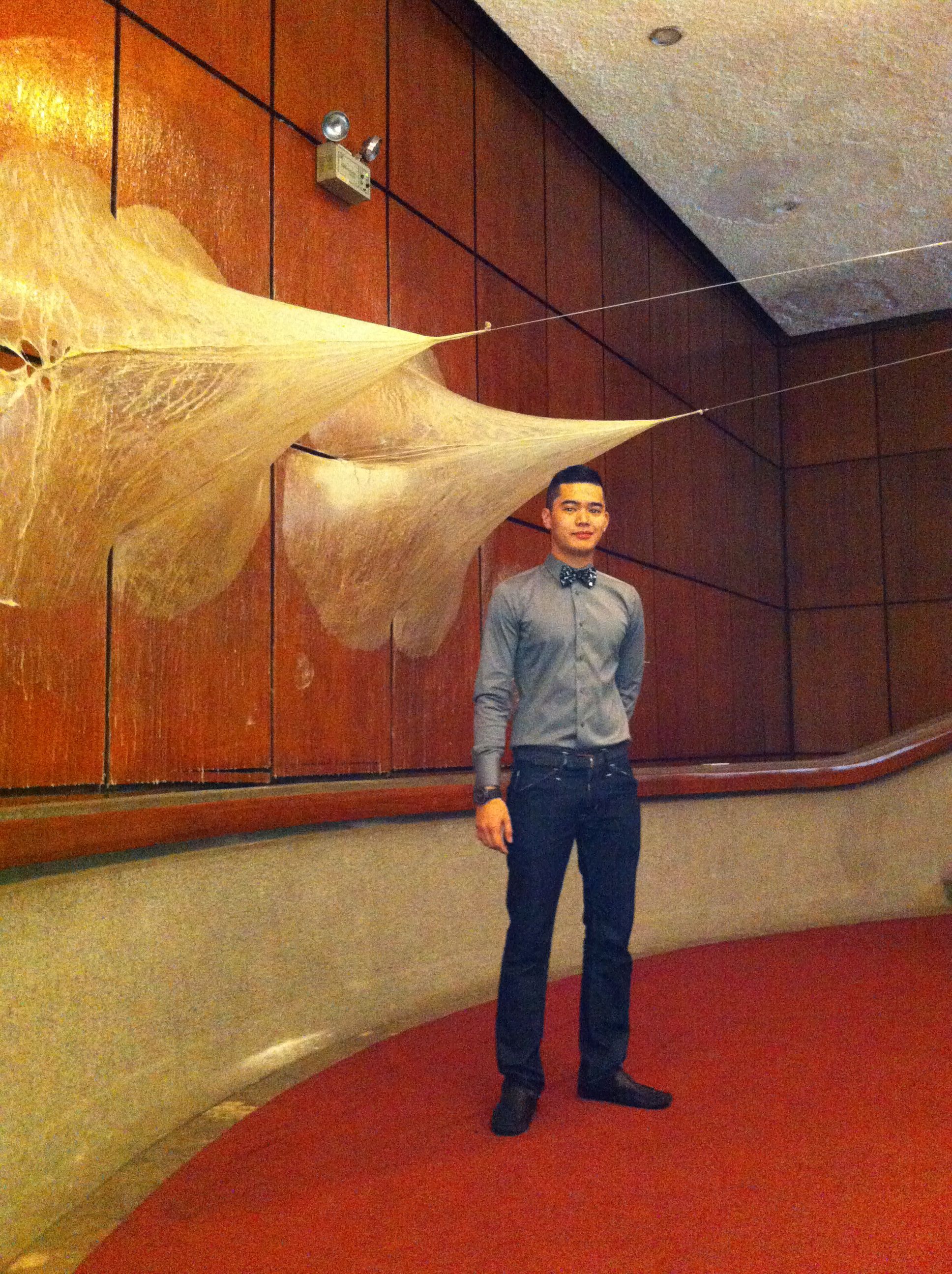 For instance, you must take the elevators to experience Kiri Lluch Dalena’s sound installations, recordings of nature’s fury that recall Typhoon Sendong, 2011’s super typhoon that devastated her mother’s home town of Iligan City. While Leeroy New stretched and strung larvae-like clumps of clear latex around the main stairwell, a marvel for fans of his spatial interventions. Leeroy’s work— whether in art, fashion, or design– displays an abiding affinity for sci-fi. These particular pieces bring Shelob’s lair to mind (perhaps because Lord of the Rings currently runs on HBO). Coolness!