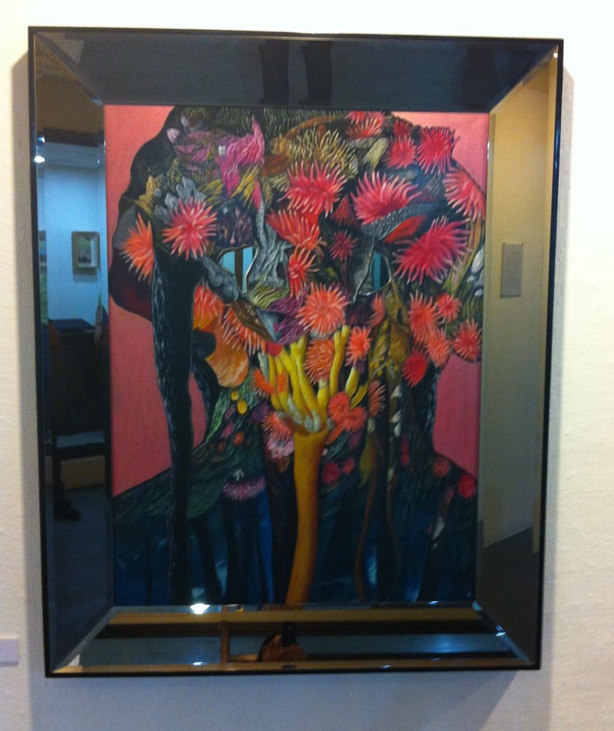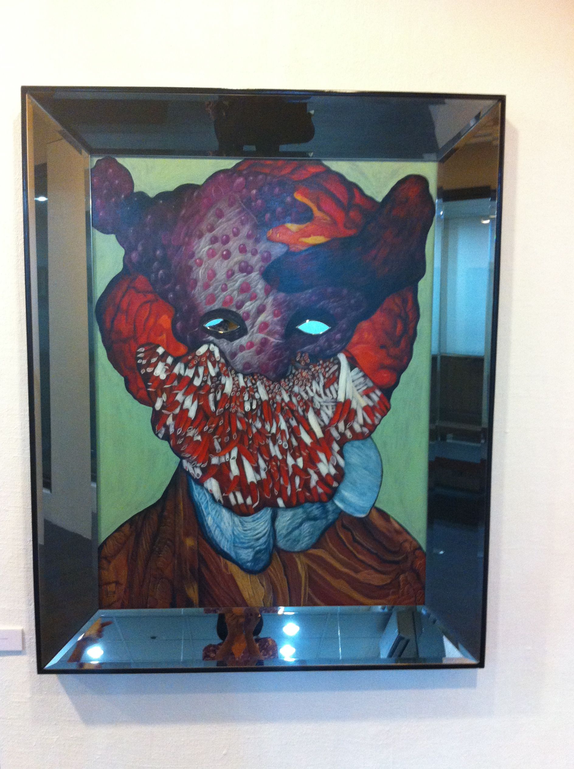 Mirrors incorporated into the acrylic paintings complement details painted by Rodel in jewel-toned layers. He has used the mirrors to replace his subjects’ eyes. Each piece has also been finished with its own glass mirror frame.