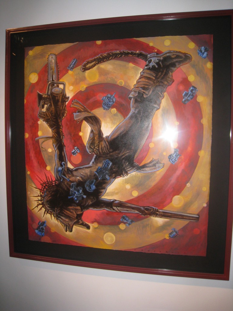 I don’t pretend to fully understand Maria’s basis for reducing her work to these forms. But I do admit a fascination to what she has created, not least of all because of the obvious amount of work she has put into her acrylic paintings. The repetitiveness of those bricks mesmerize; one could lose oneself enjoying their depths.